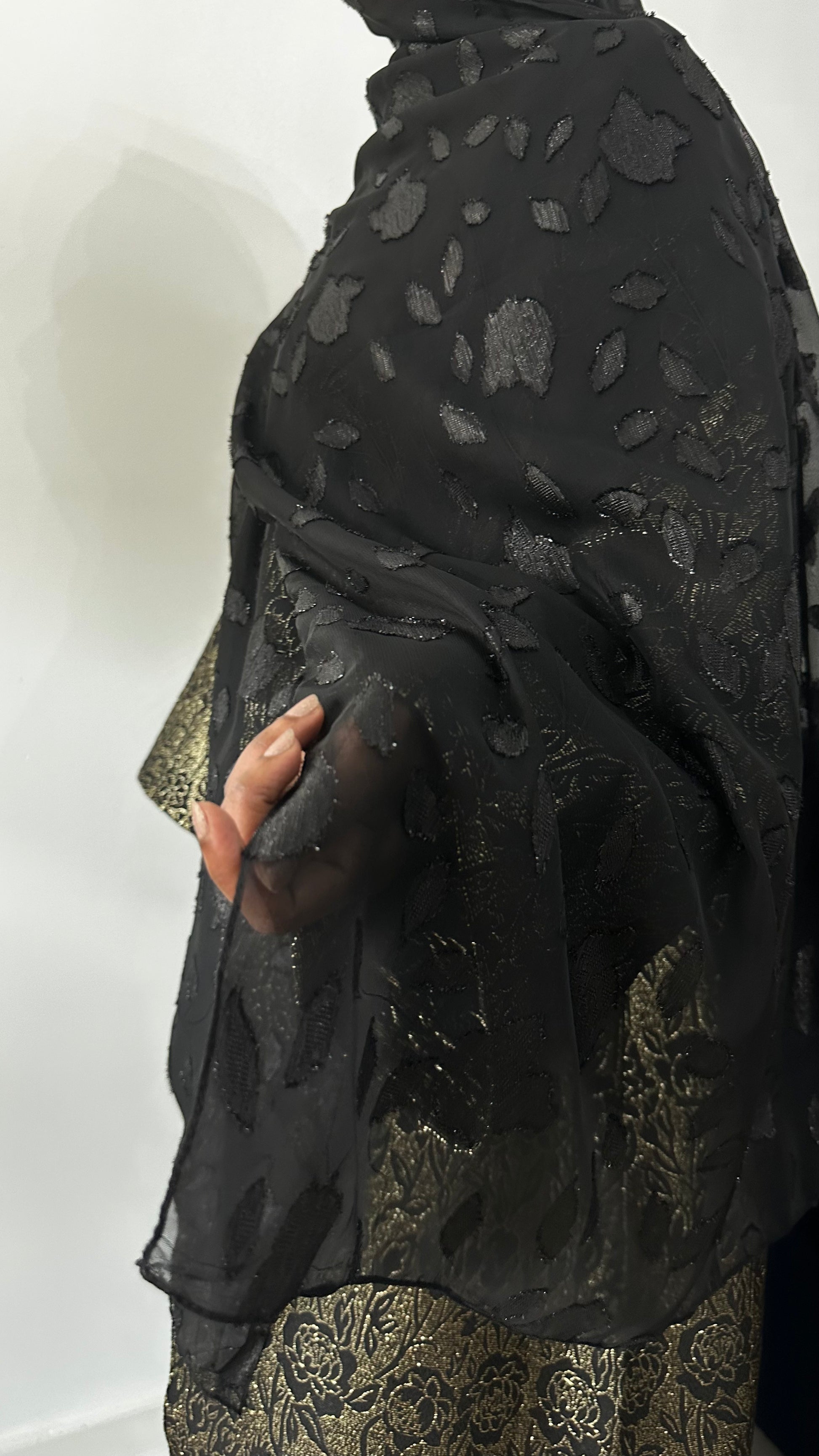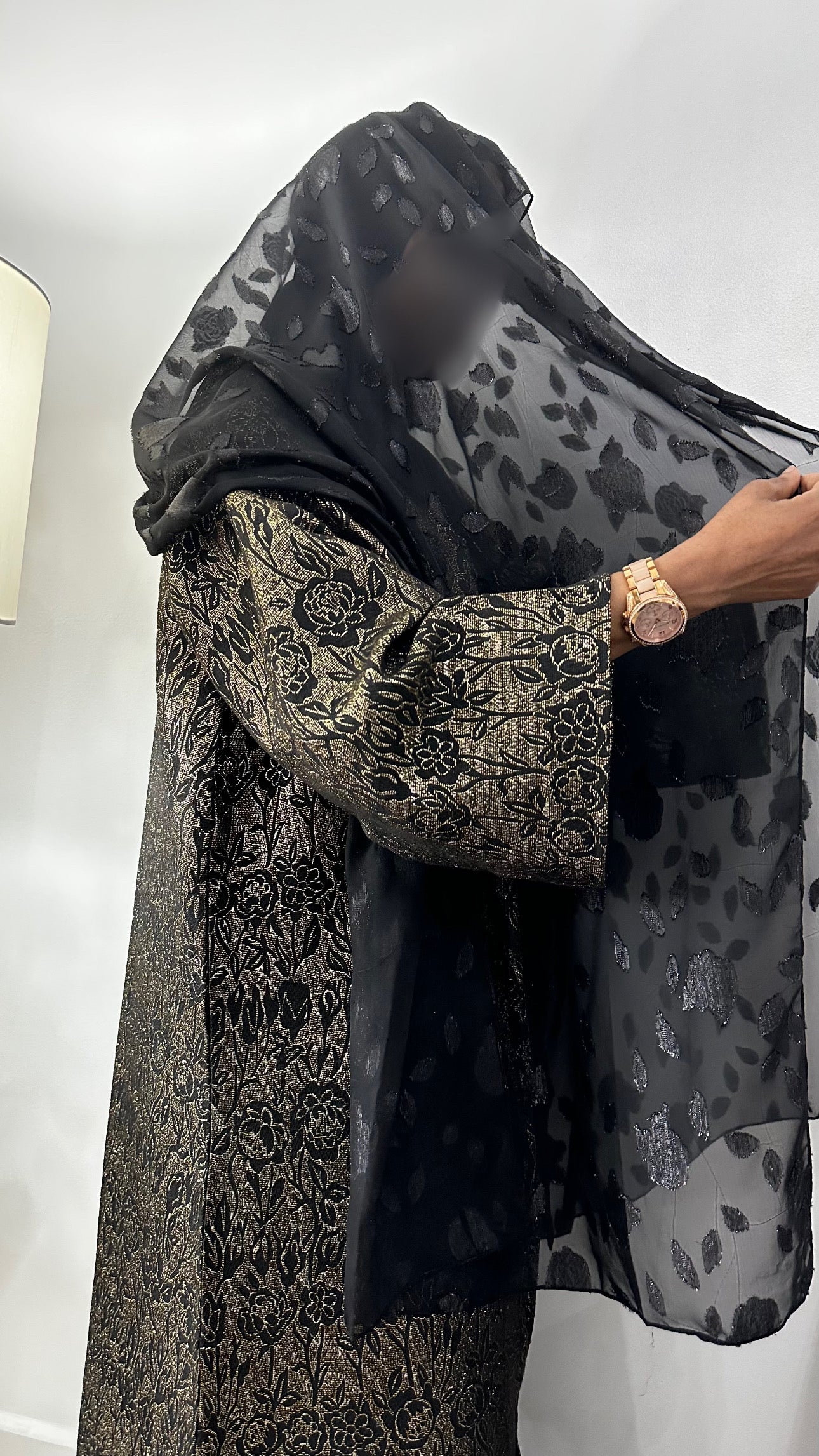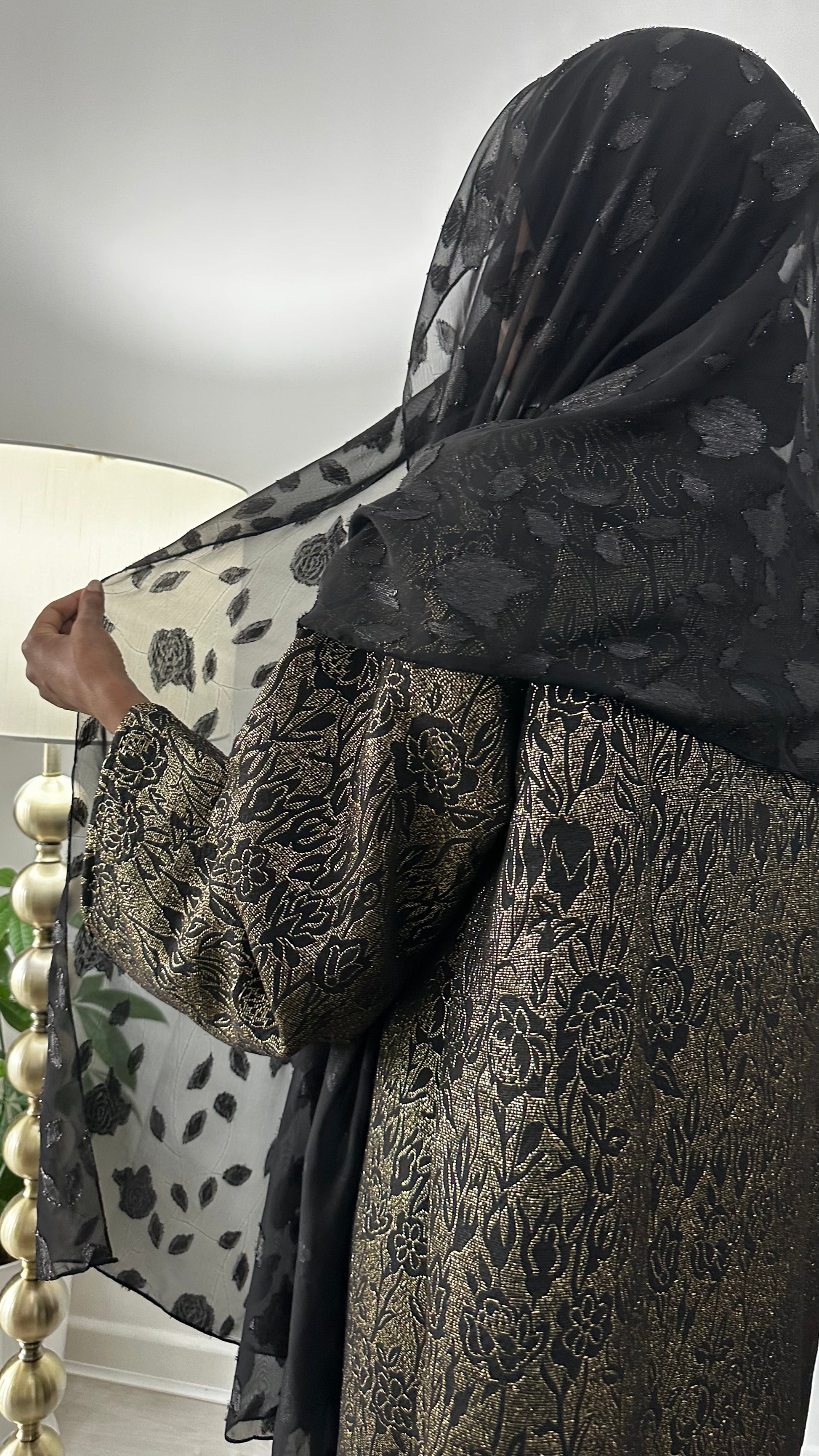 The Aaira abaya is a fusion of delicate gold leaf like patterns paired with a rich black, the abaya is effortlessly paired with a matte black scarf with the same leaf pattern finish to pair this timeless piece.