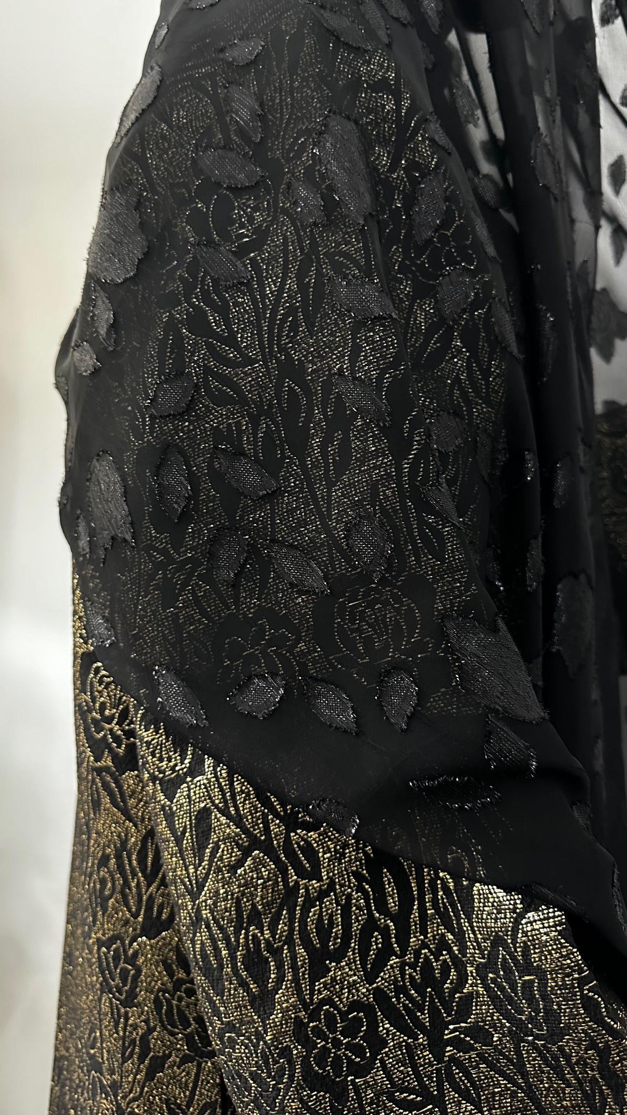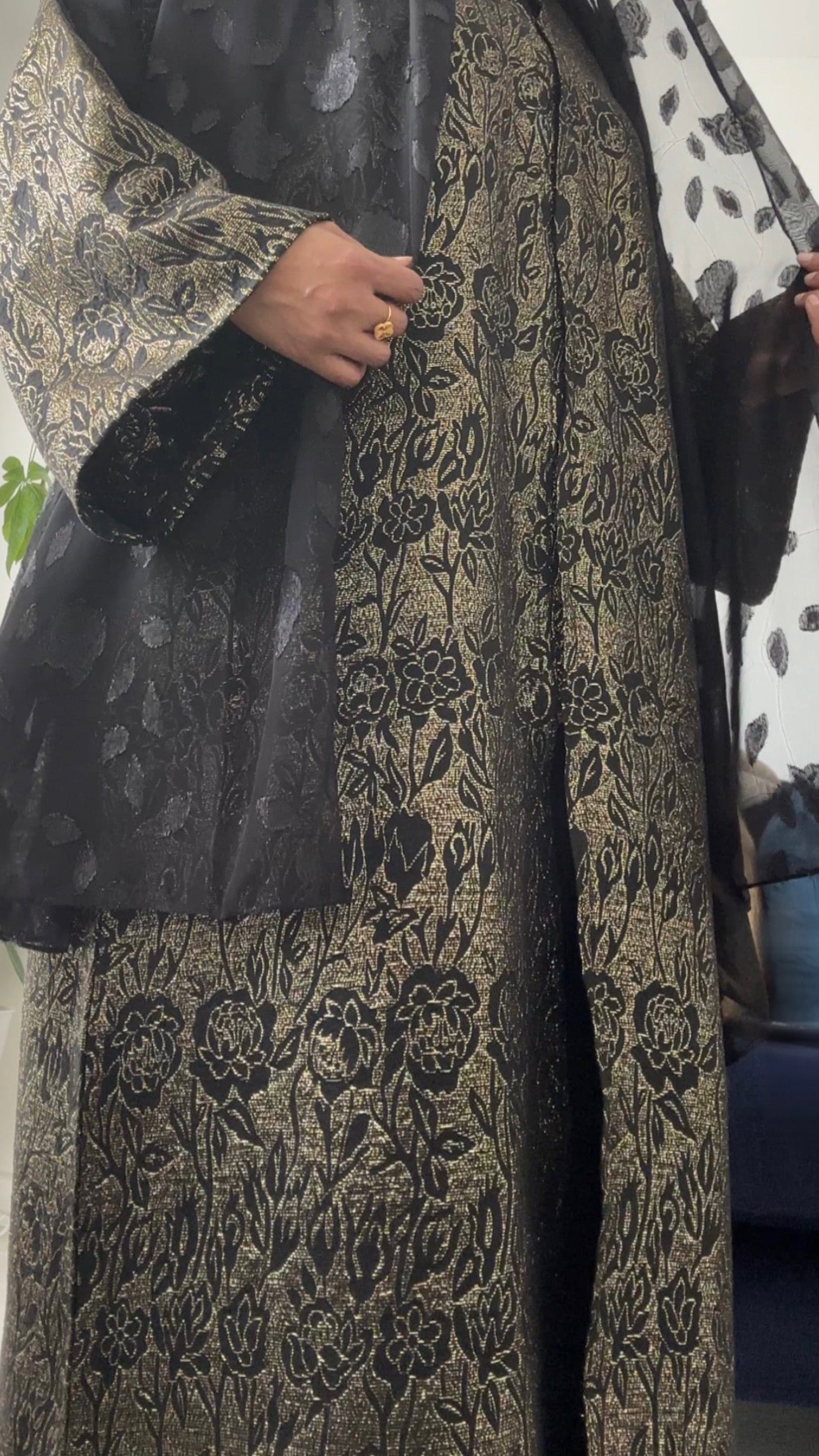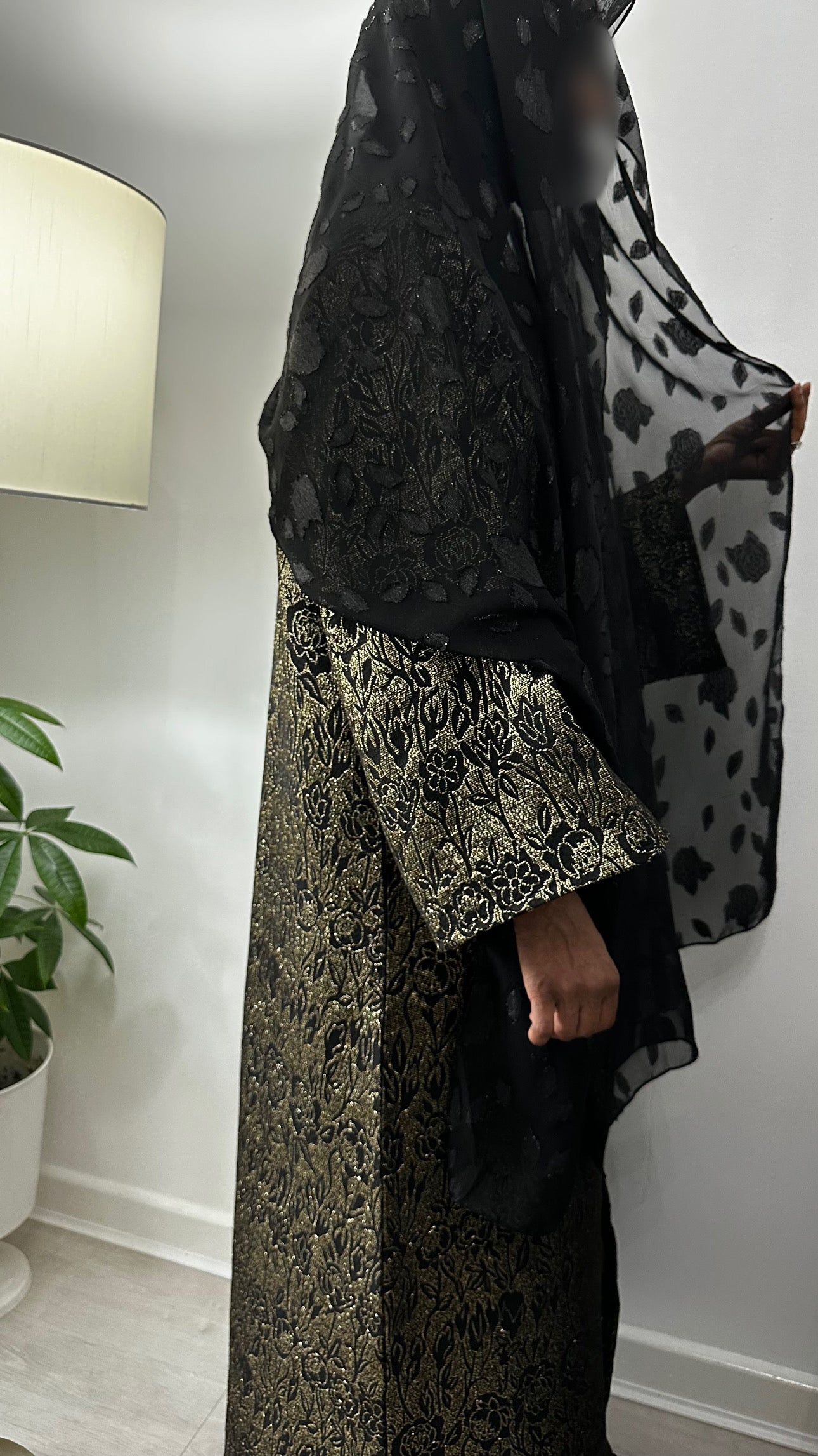 The Aaira abaya is a fusion of delicate gold leaf like patterns paired with a rich black, the abaya is effortlessly paired with a matte black scarf with the same leaf pattern finish to pair this timeless piece.