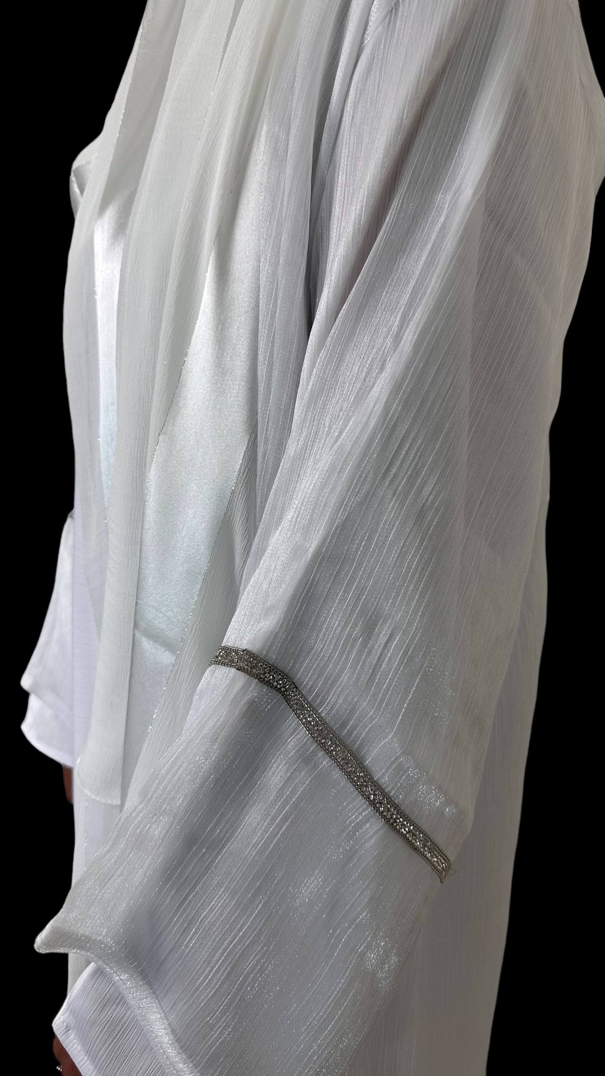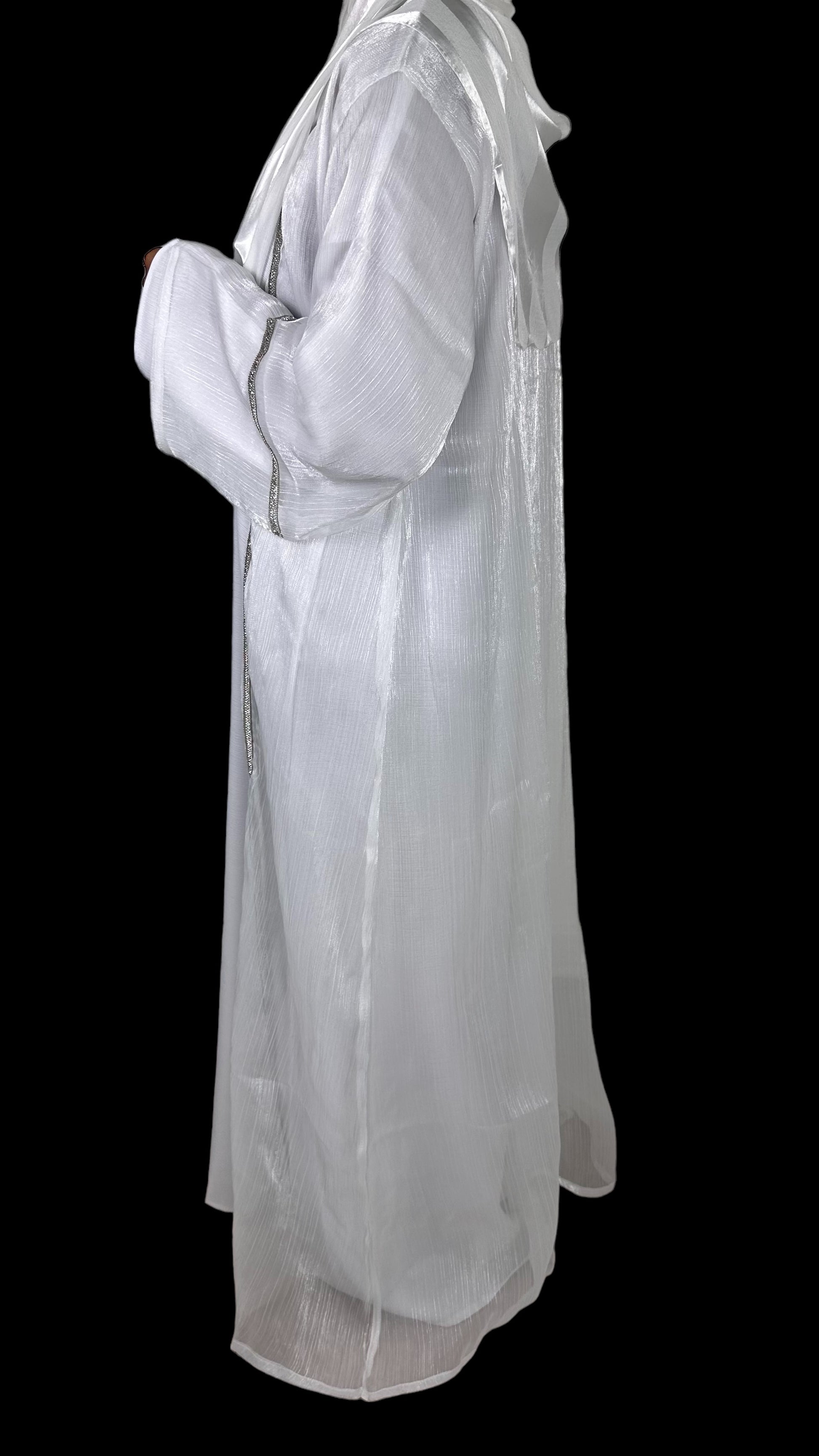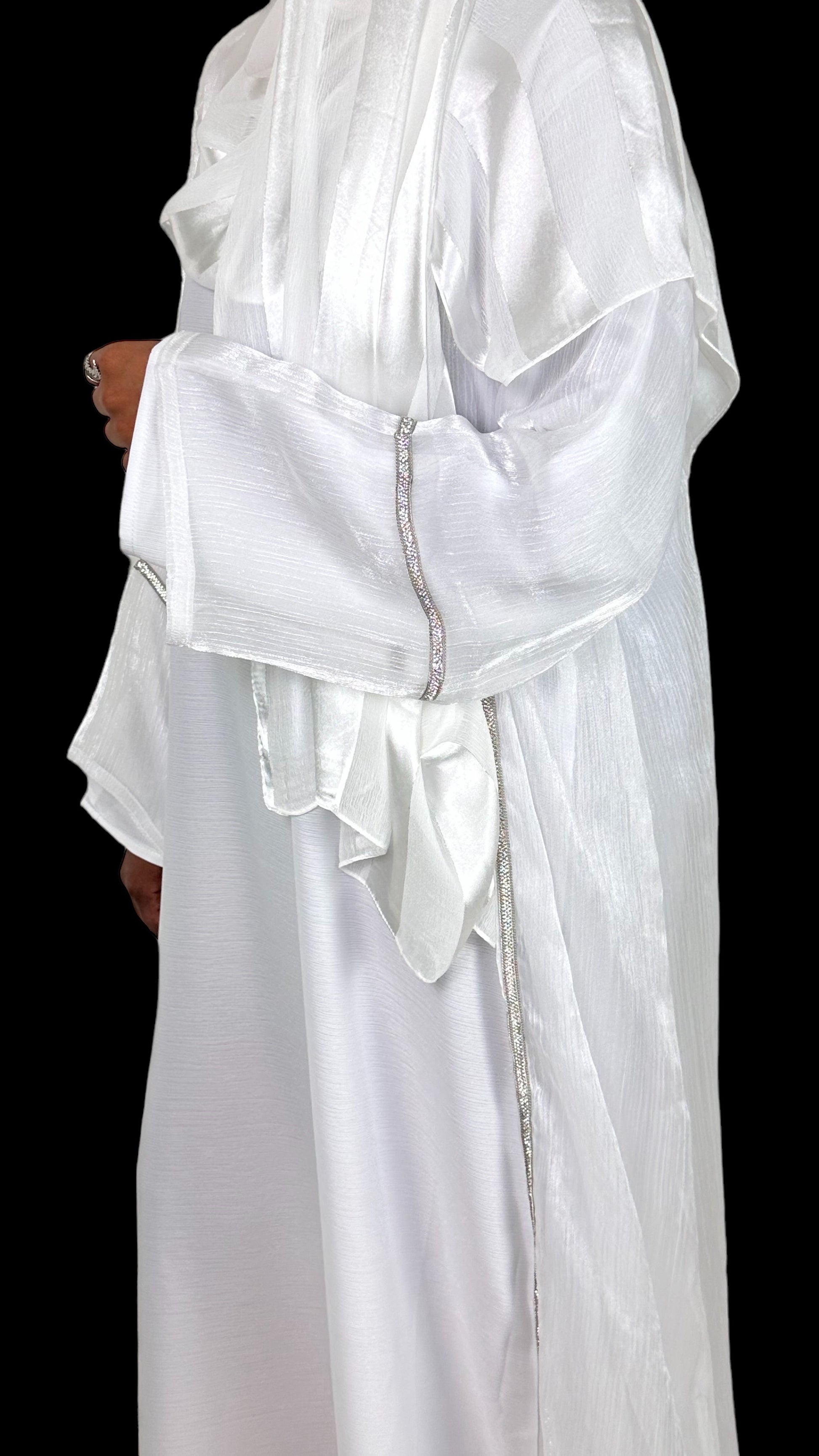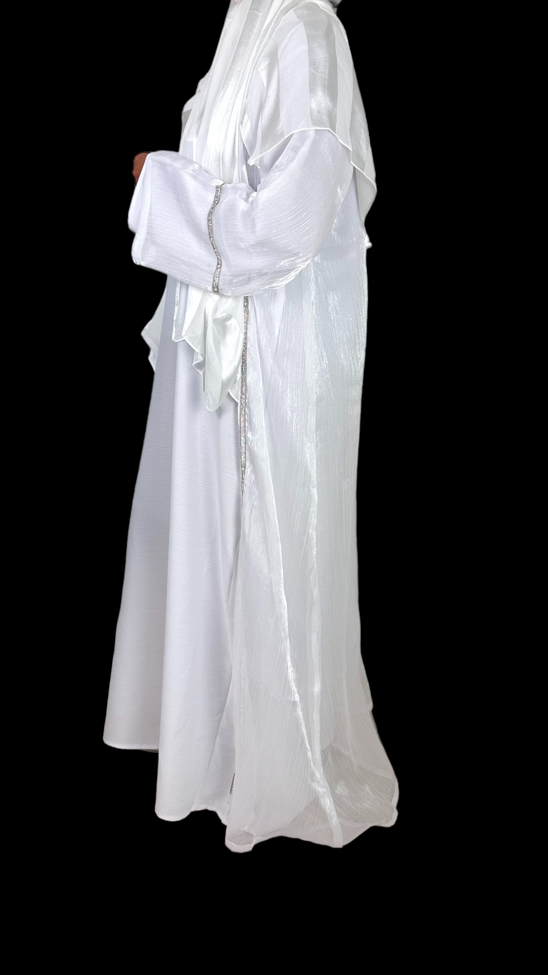 Bianca is an exquisite white, shimmery abaya set adorned with intricate embellishments on the front and sleeves. This elegant ensemble includes a full sleeved white dress, making it a must have for those special evenings when you crave the sophistication of a white outfit and beautiful scarf. The abaya comes with a complimentary belt, reminiscent of an apron, allowing you to tailor the fit to your liking.