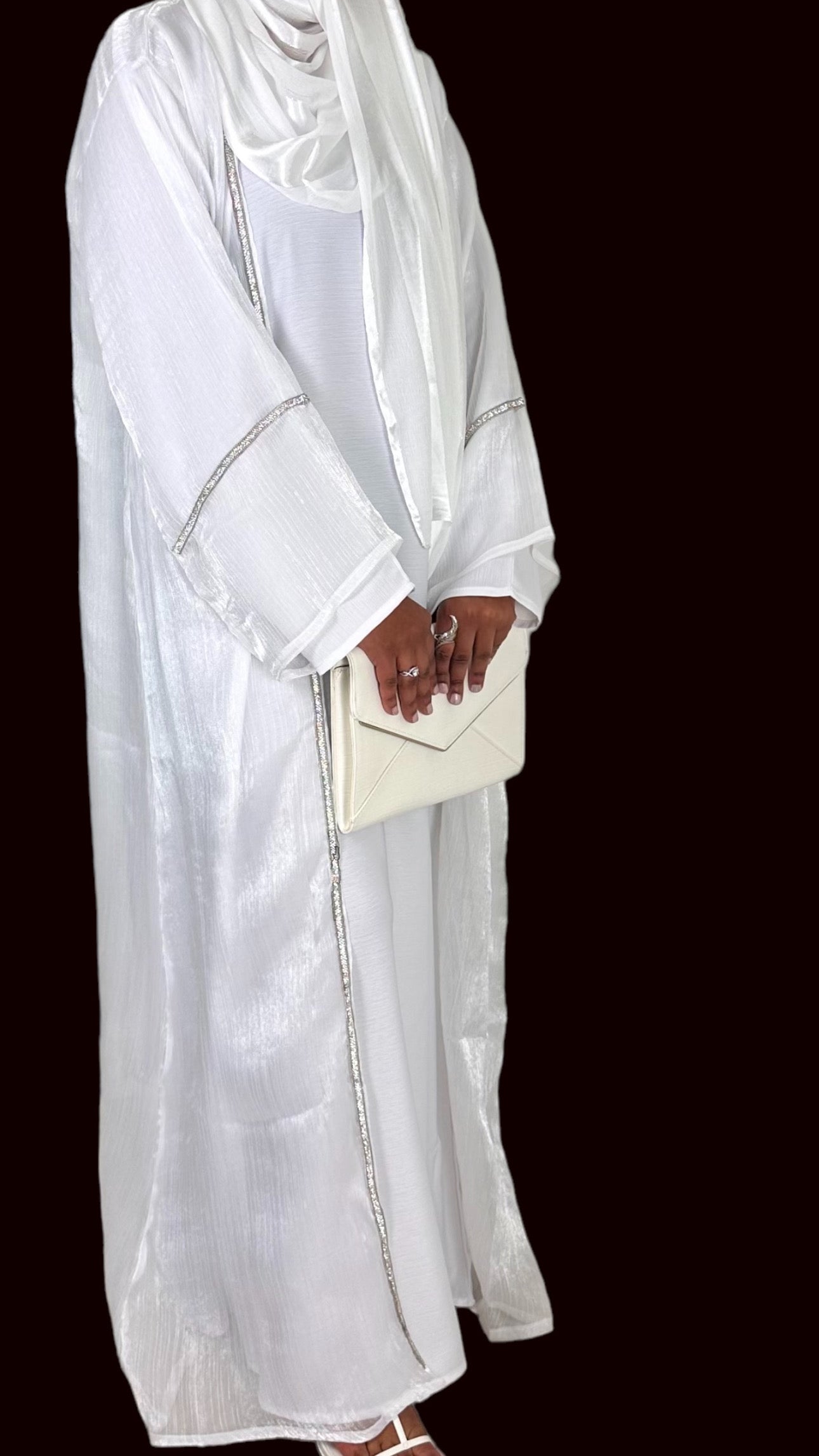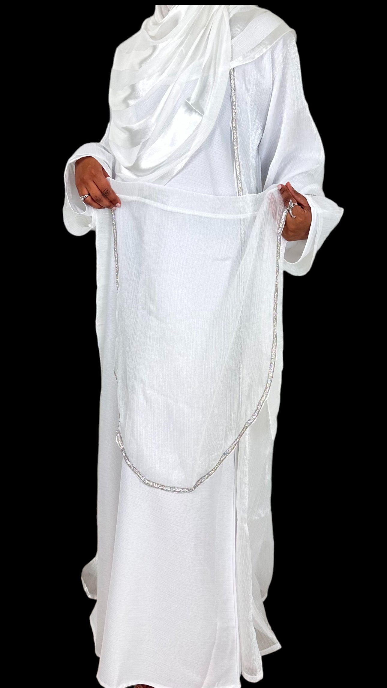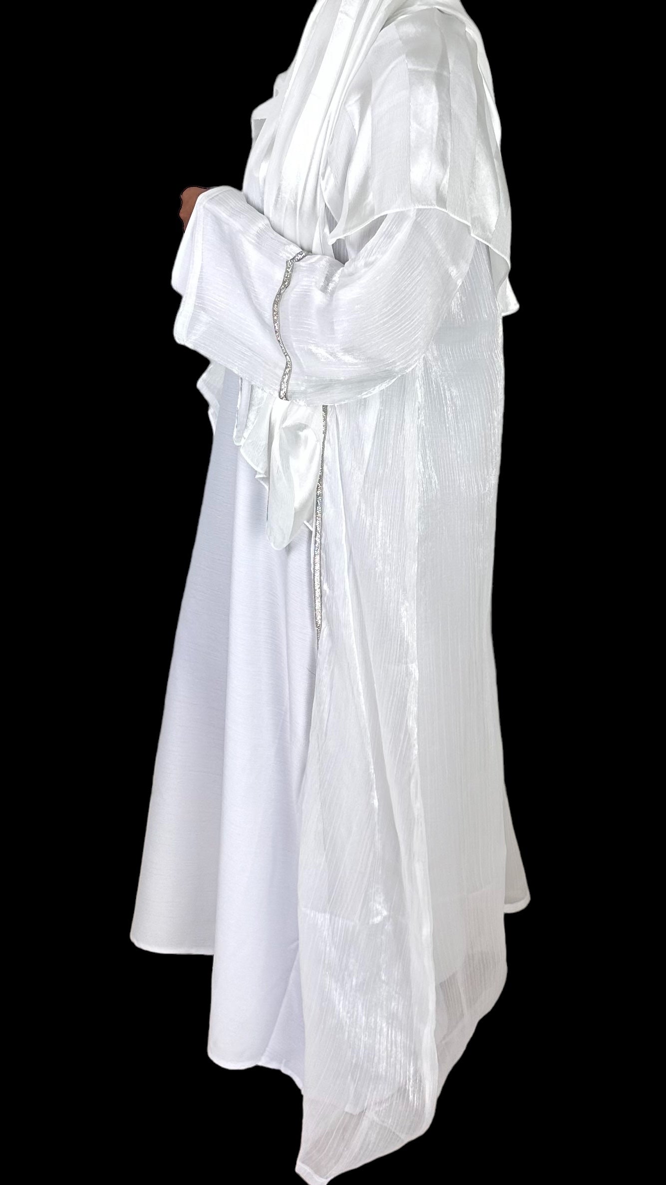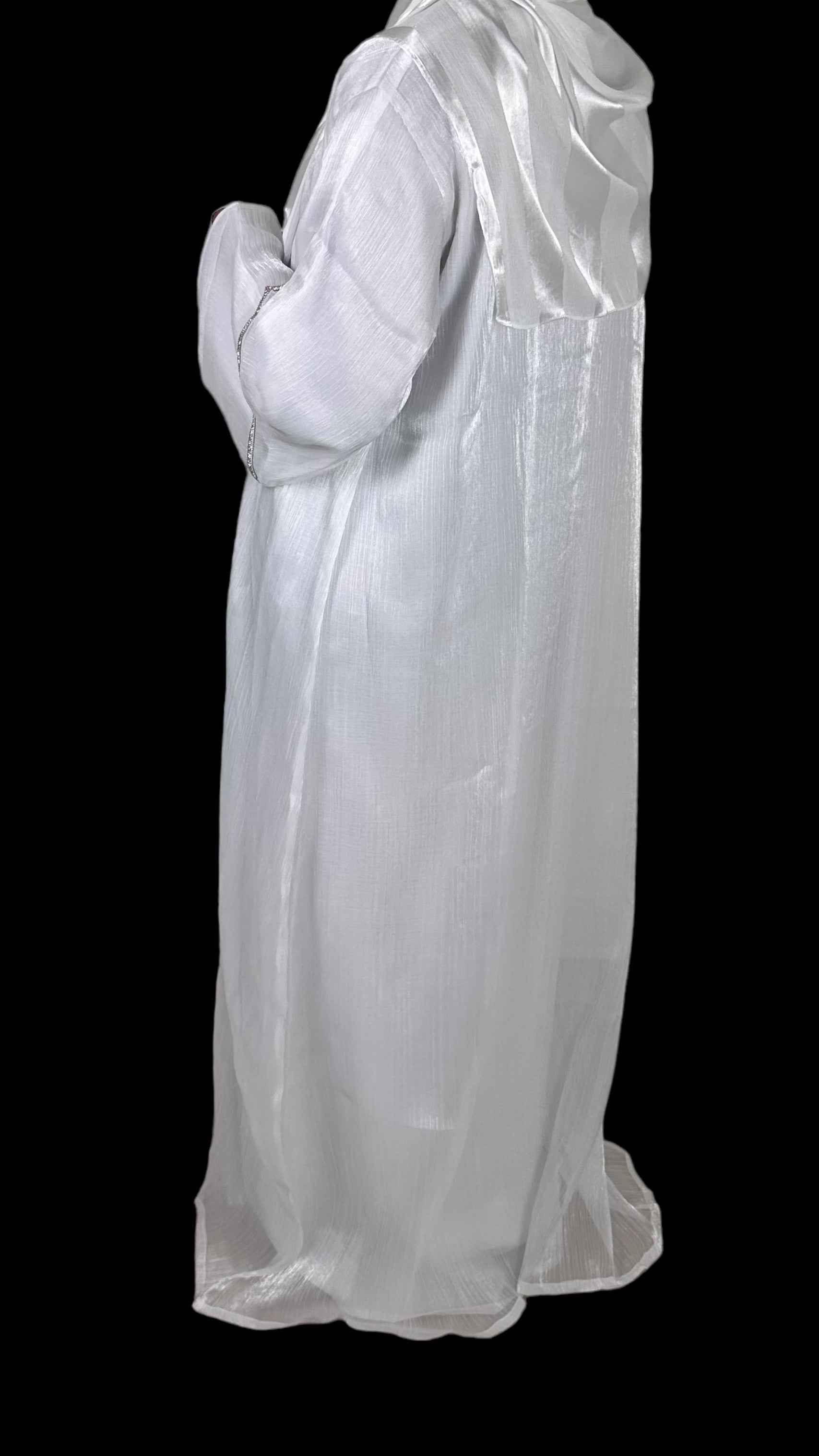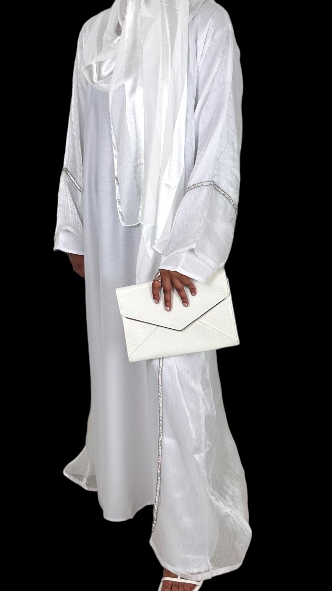 Bianca is an exquisite white, shimmery abaya set adorned with intricate embellishments on the front and sleeves. This elegant ensemble includes a full sleeved white dress, making it a must have for those special evenings when you crave the sophistication of a white outfit and beautiful scarf. The abaya comes with a complimentary belt, reminiscent of an apron, allowing you to tailor the fit to your liking.