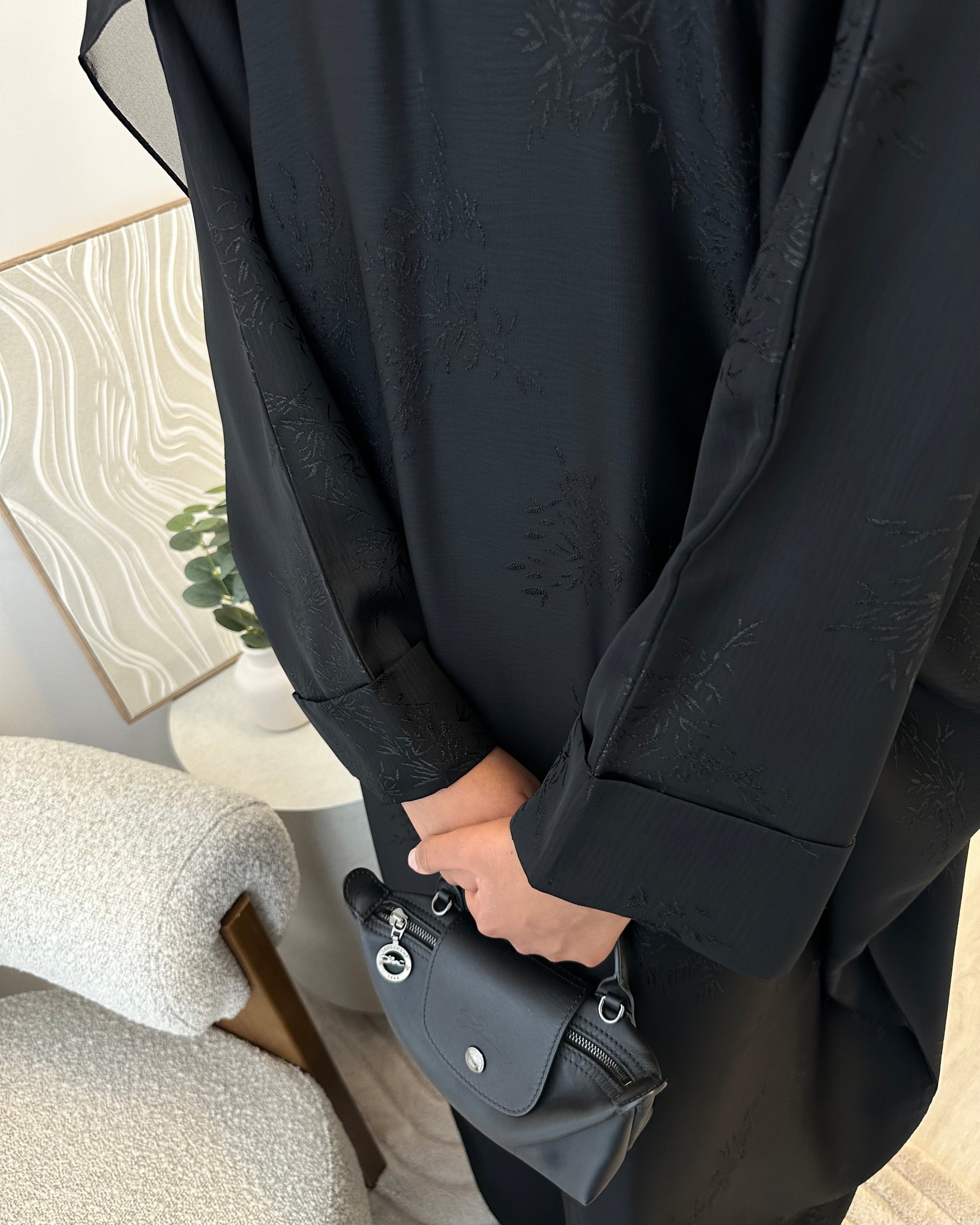 A timeless black jacquard abaya designed with a subtle leaf inspired pattern woven into the fabric for added texture and elegance. The oversized closed silhouette offers a graceful, flowing fit, finished with beautifully folded cuffs for a refined touch.