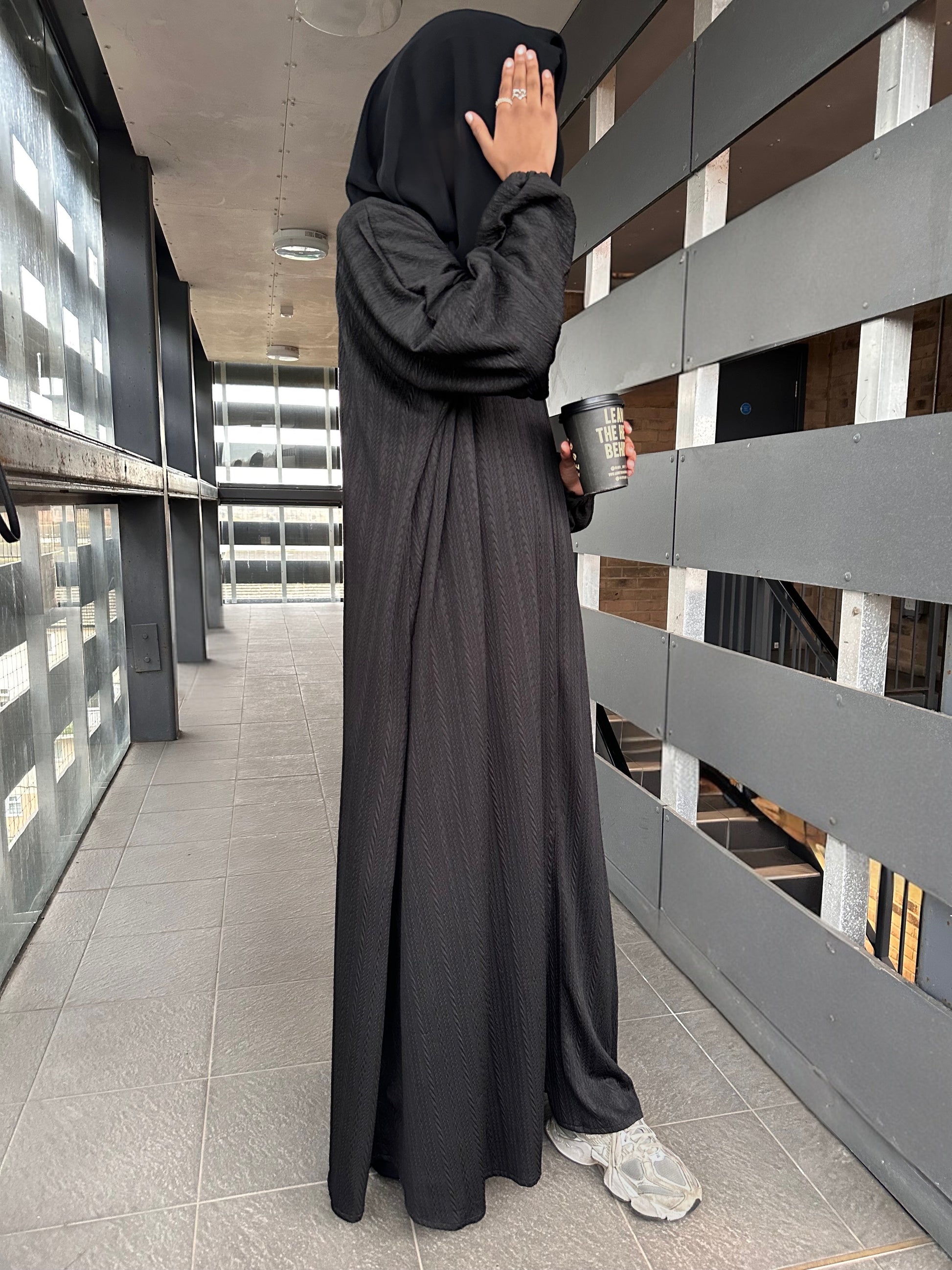 A timeless open black stretch knit abaya crafted from soft, textured fabric for an elegant drape. Designed with comfortable elastic cuffs and practical side pockets. Completed with a matching black scarf for a sleek, coordinated finish.
