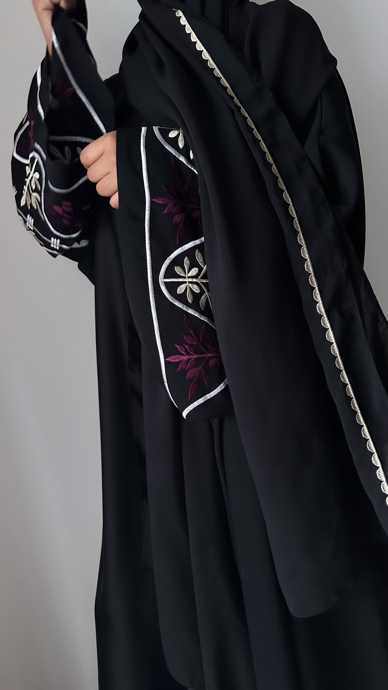 Introducing our exquisite embroidered abaya, designed to exude elegance and comfort. Featuring wide sleeves for added style and ease of movement, adorned with stunning embroidery in vibrant colours. This versatile piece can be worn open or closed with its button up design, comes with a maxi matching scarf. Elevate your wardrobe with this timeless ensemble that seamlessly blends tradition with modern sophistication.