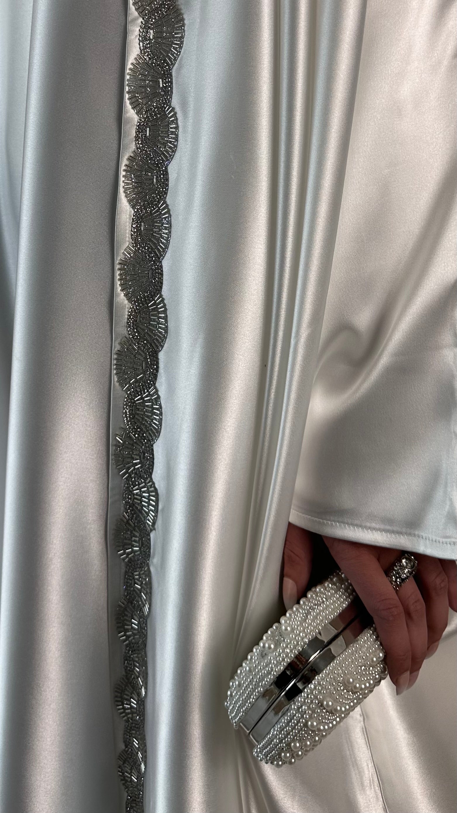 This bridal cape is made from premium soft silky satin, beautiful off white colour. The cape features intricate embellishments at the front opening, reminiscent of timeless bridal elegance. Whether paired with our premium matching full sleeves dress or your own treasured bridal garments, this cape offers a refined outerwear option, ensuring you feel confident and radiant on your wedding day.