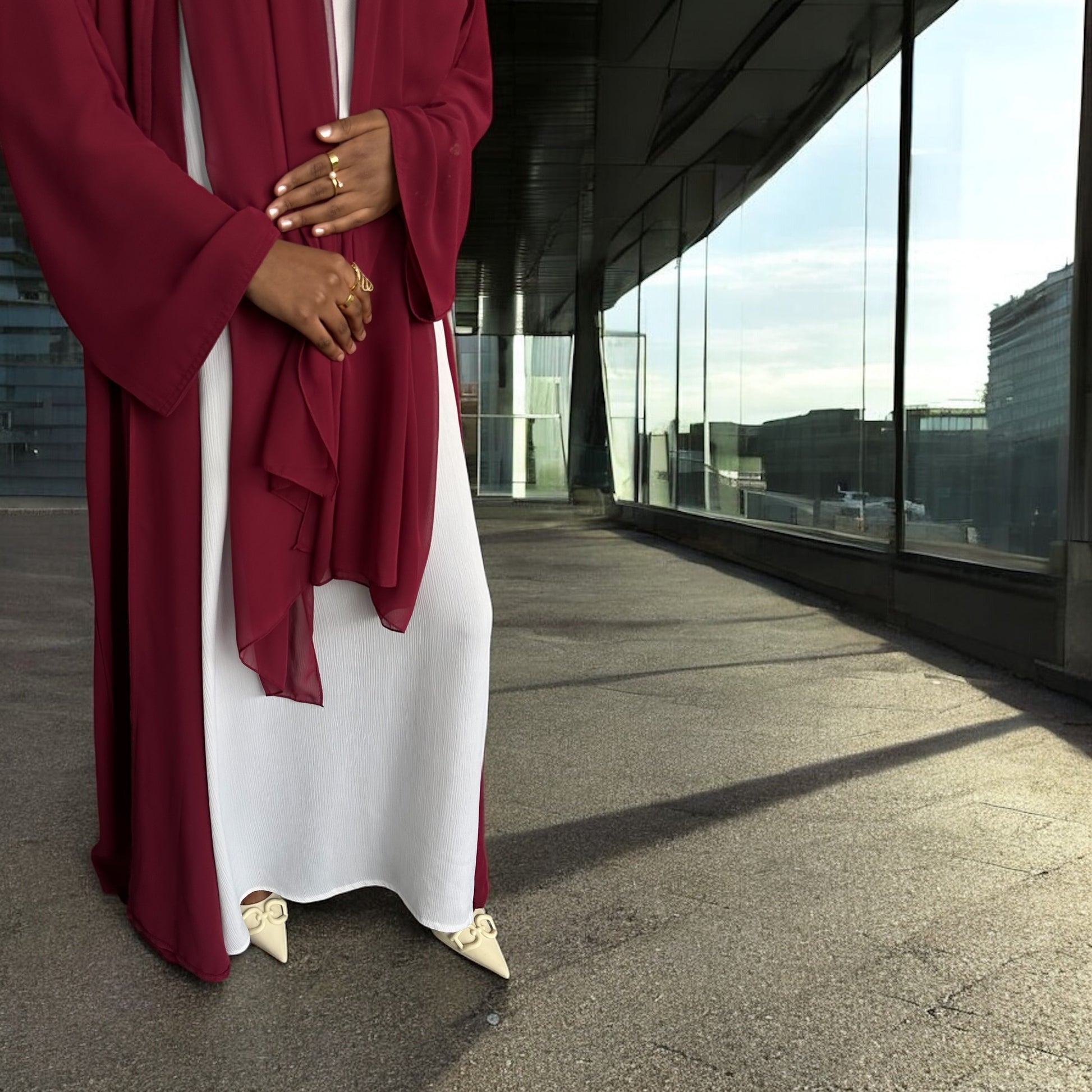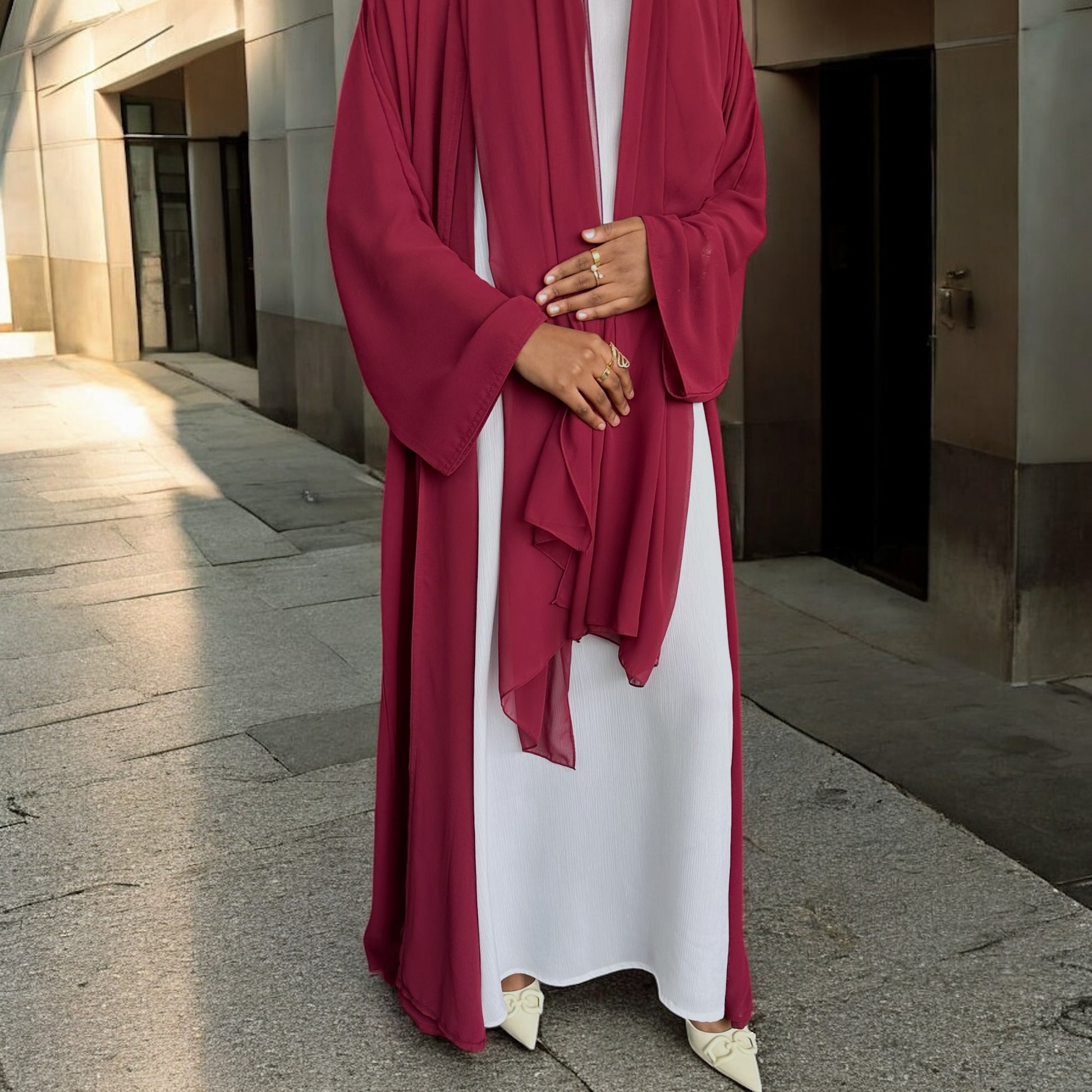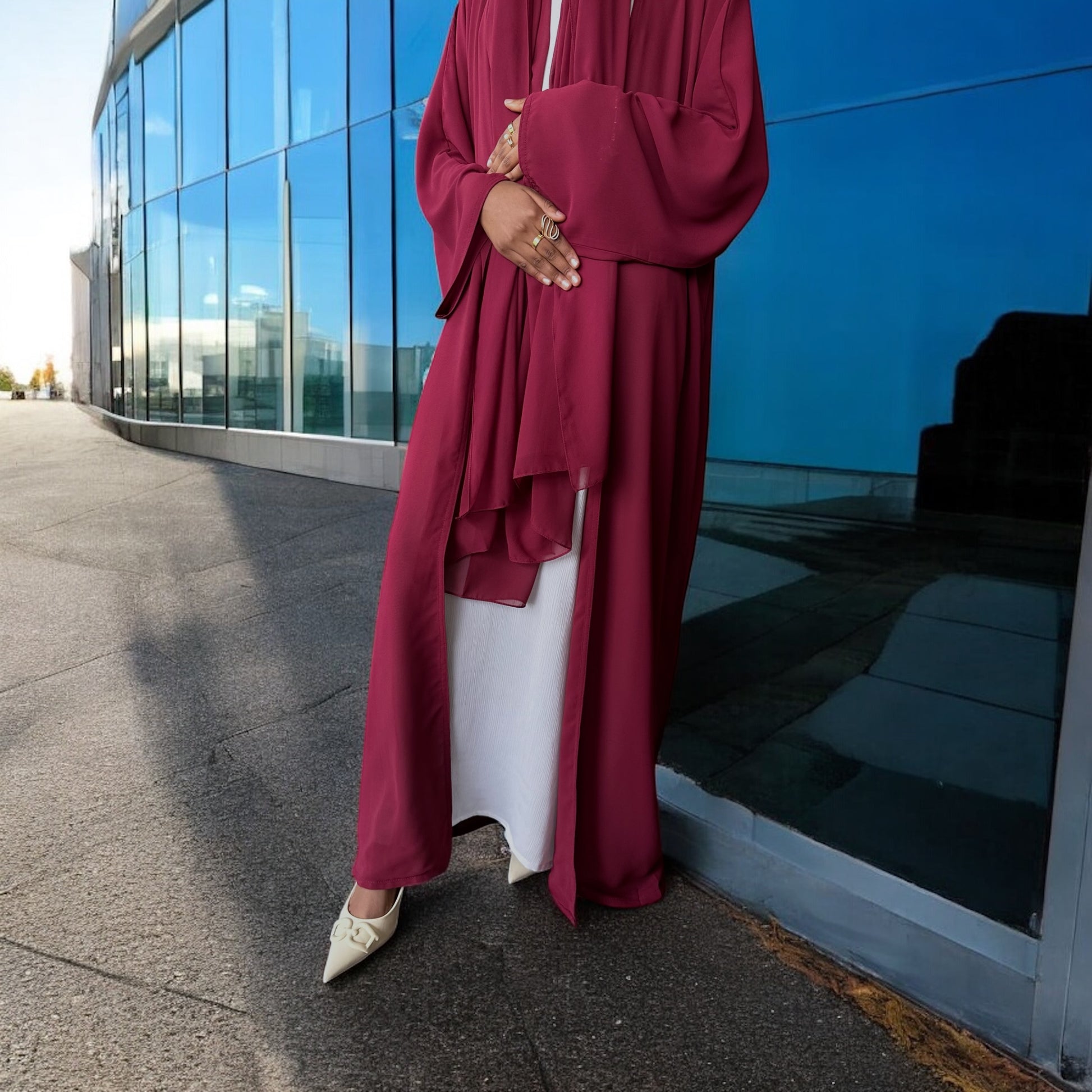 Step into elegance this summer with this gorgeous deep burgundy abaya set. Crafted from soft, double-layered chiffon, this open abaya flows gracefully for a lightweight, breathable feel perfect for warm weather. The rich burgundy shade exudes timeless sophistication, making it ideal for both daytime and evening wear. Paired with a matching maxi scarf, this set offers effortless coordination and modesty without compromising style. Whether you’re heading to a special gathering or enjoying a casual day out, this piece brings elegance to every step.