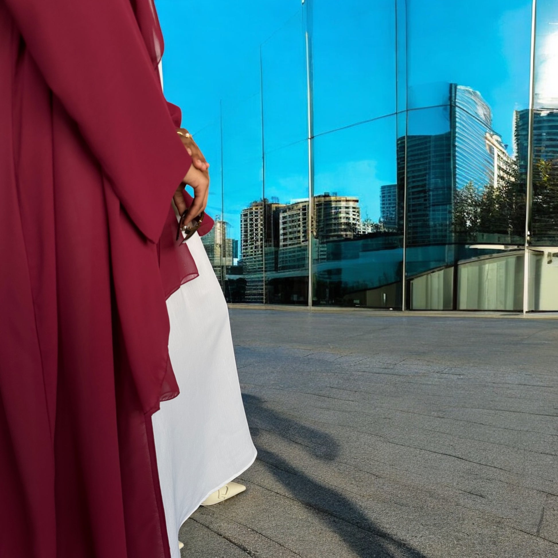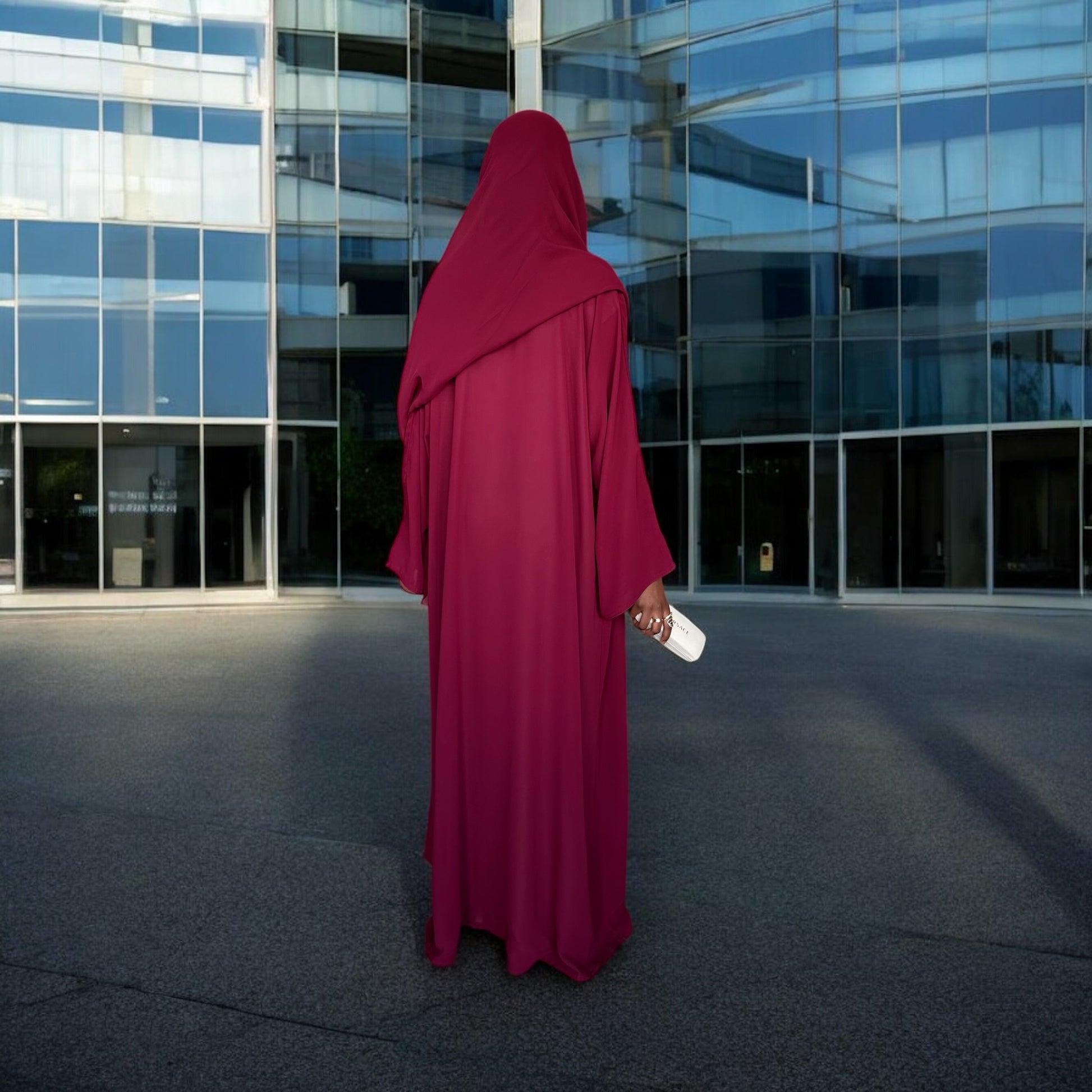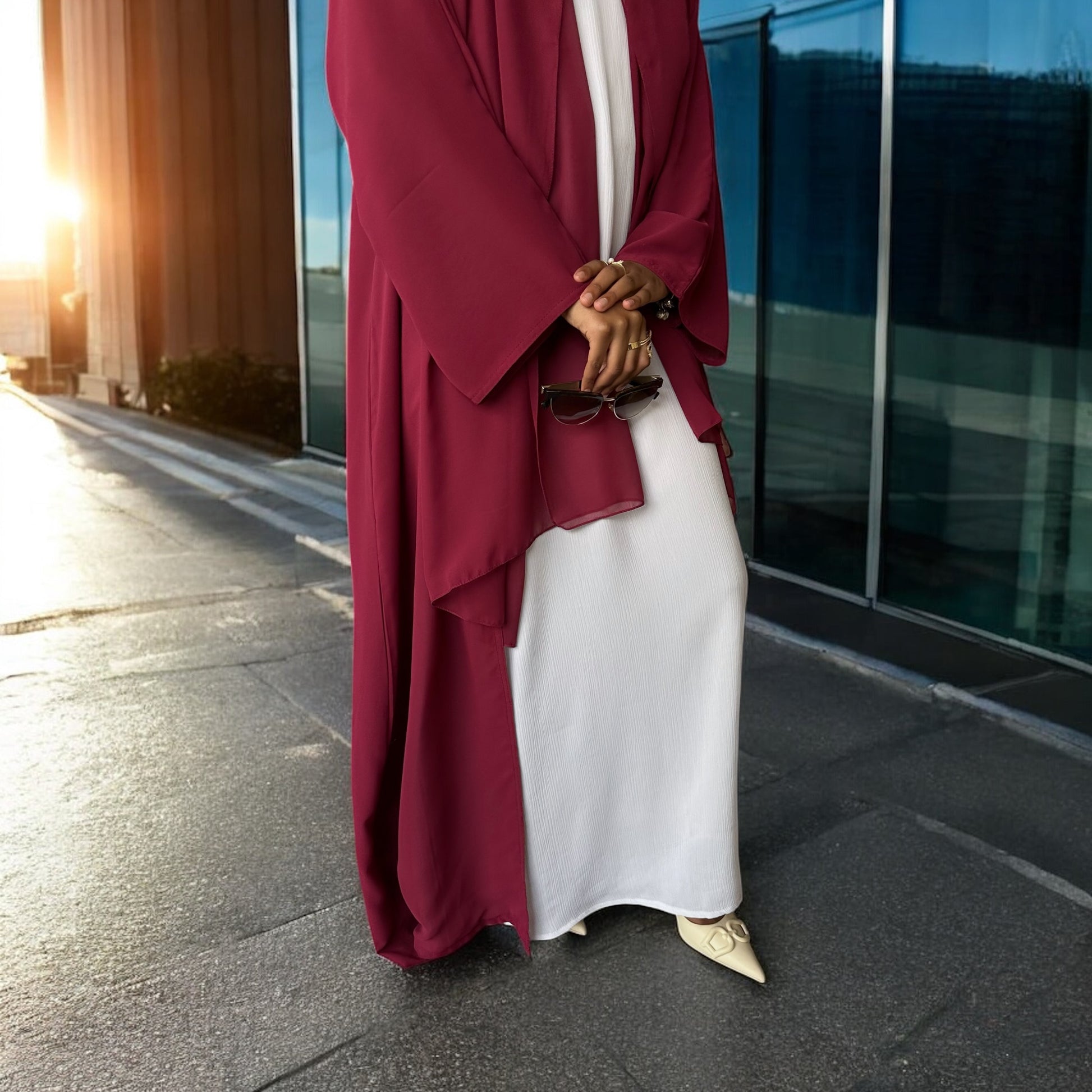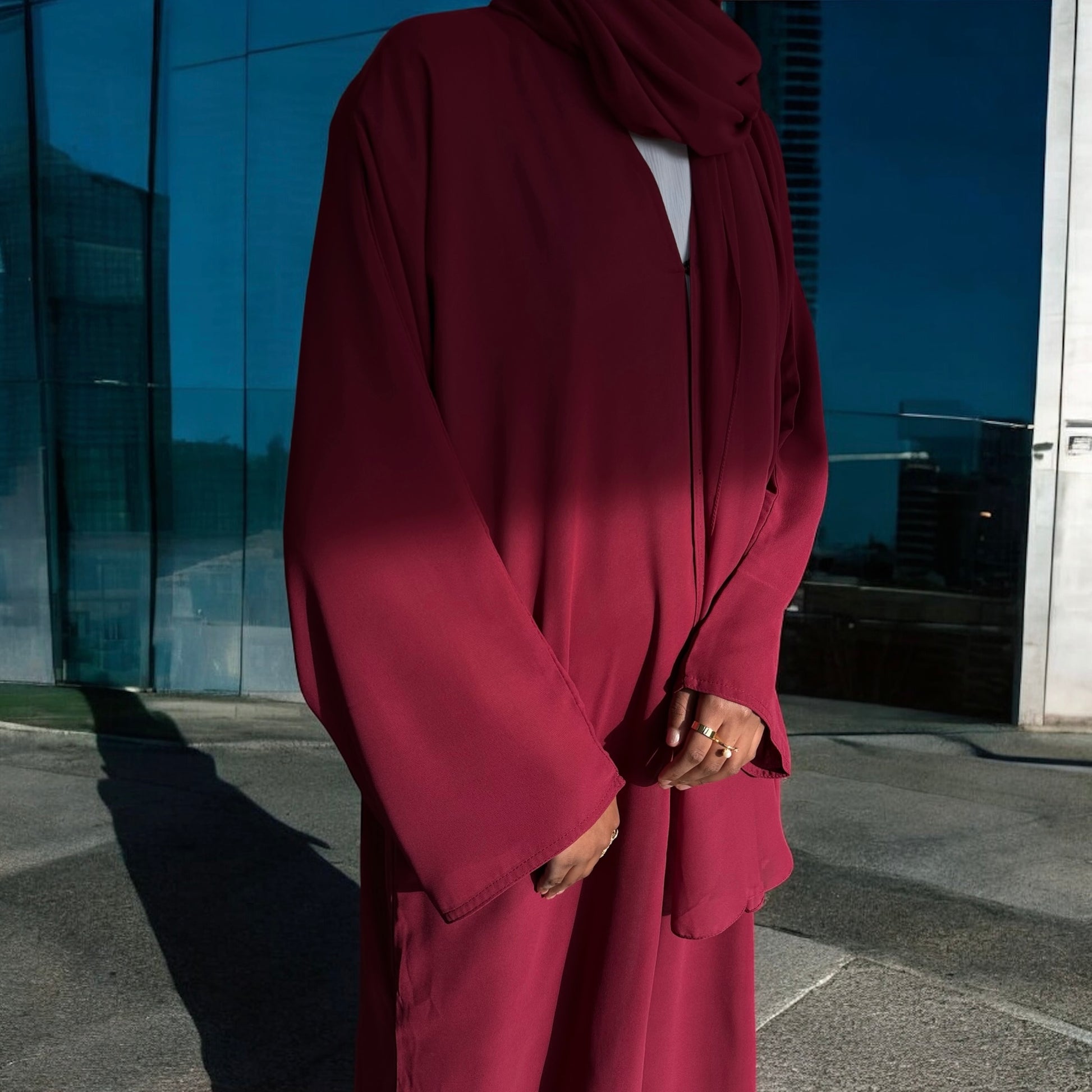 Step into elegance this summer with this gorgeous deep burgundy abaya set. Crafted from soft, double-layered chiffon, this open abaya flows gracefully for a lightweight, breathable feel perfect for warm weather. The rich burgundy shade exudes timeless sophistication, making it ideal for both daytime and evening wear. Paired with a matching maxi scarf, this set offers effortless coordination and modesty without compromising style. Whether you’re heading to a special gathering or enjoying a casual day out, this piece brings elegance to every step.