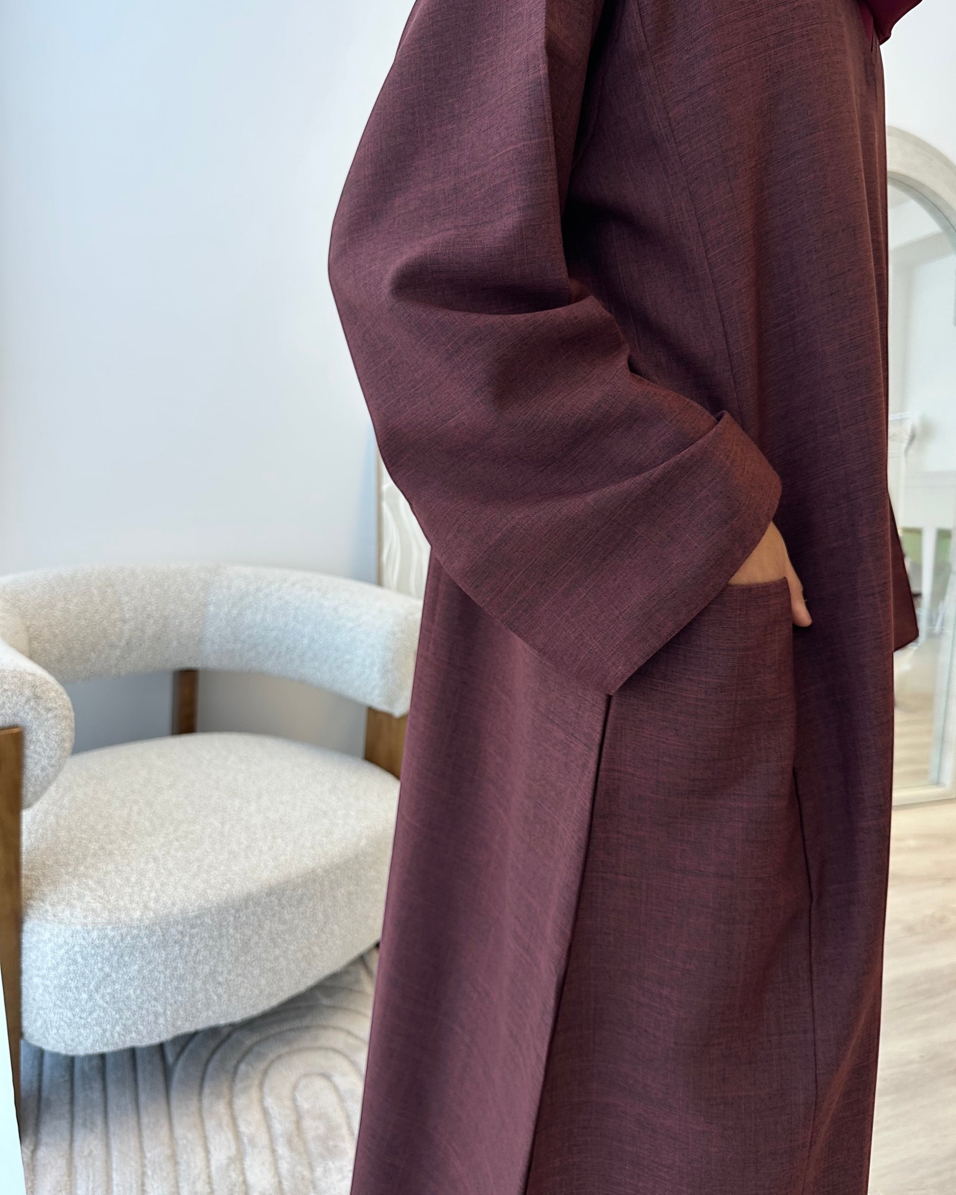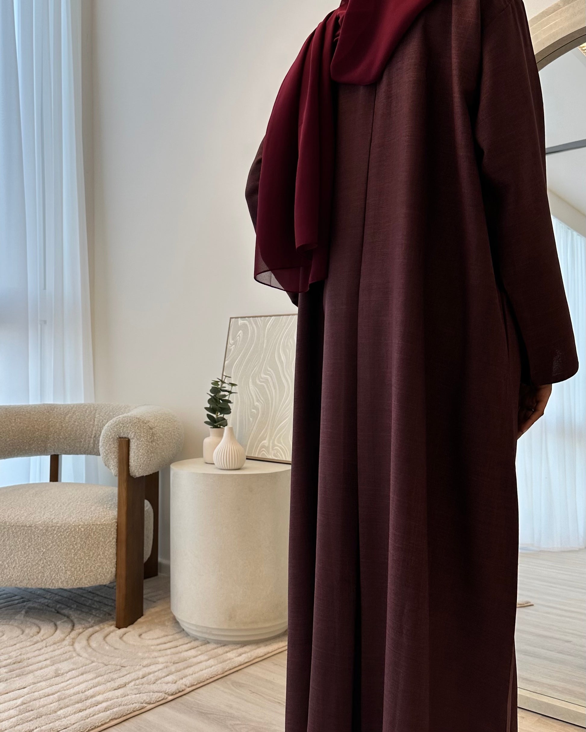 An elegant burgundy linen abaya crafted from breathable textured fabric, featuring a beautifully designed back pleat and flowing side panels for a refined silhouette. The open front style includes button closures and two beautifully integrated side pockets that add both charm and practicality. Finished with a perfectly matching burgundy scarf for a seamless look.