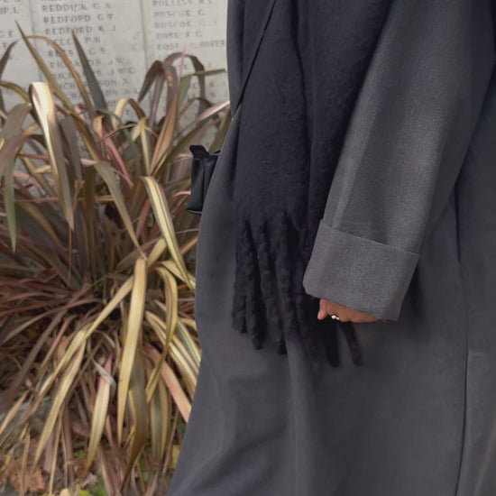 Exude understated elegance with this luxurious grey abaya, tailored from a premium wool-blend fabric that offers warmth and sophistication for the colder seasons. The closed design creates a graceful silhouette, complemented by folded sleeves and discreet side pockets for effortless refinement. Paired with a matching grey scarf, this piece embodies timeless class and elevated comfort, a perfect blend of style and practicality.