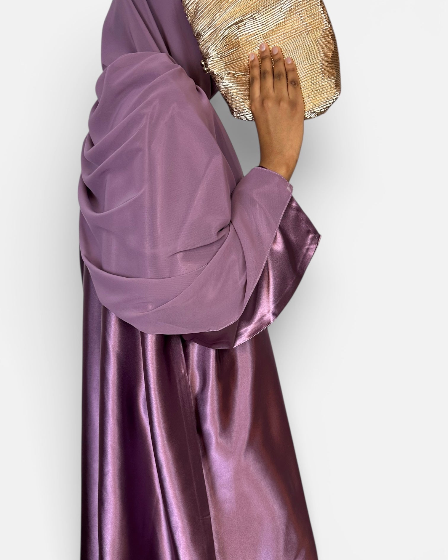 Elevate any look with this elegant lilac mist satin silk dress. It features a smooth, glossy finish and a graceful drape that feels as luxurious as it looks. The delicate lilac hue adds a soft, romantic touch, while its versatile design makes it ideal to wear on its own or as an inner dress under abayas and outerwear. A refined essential for effortless styling, day or night.