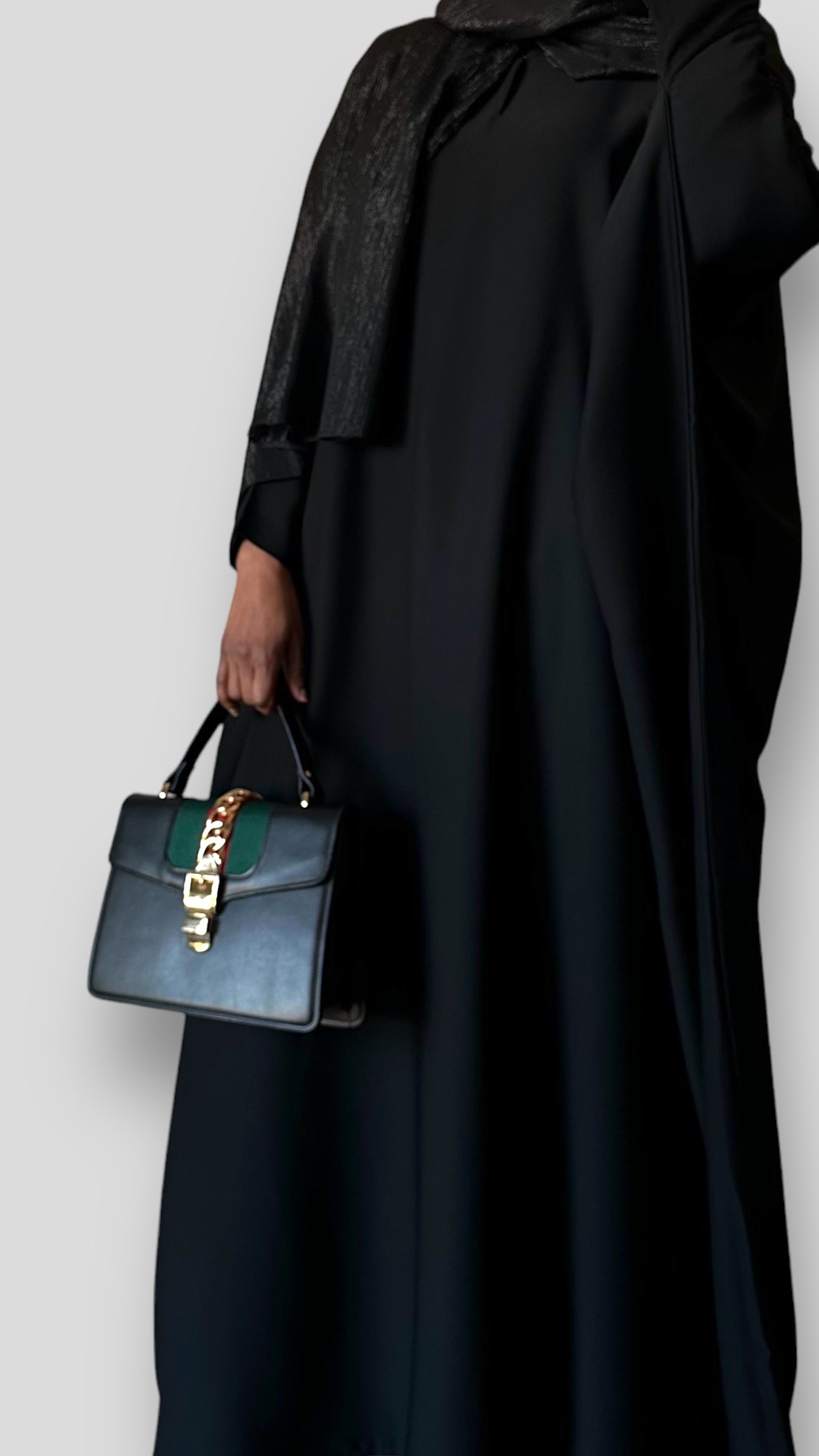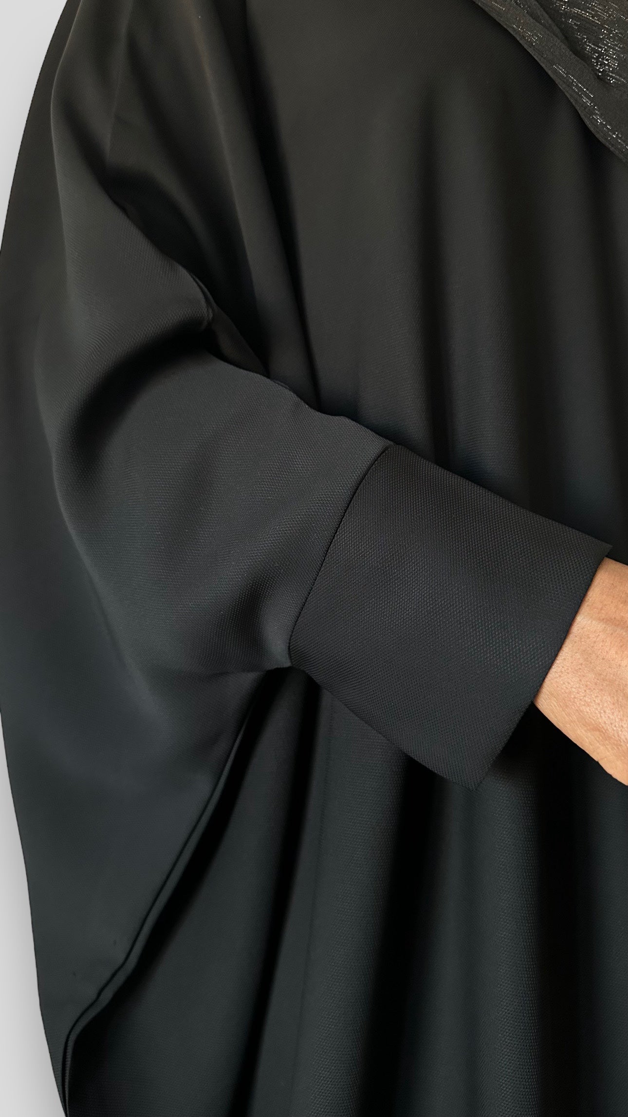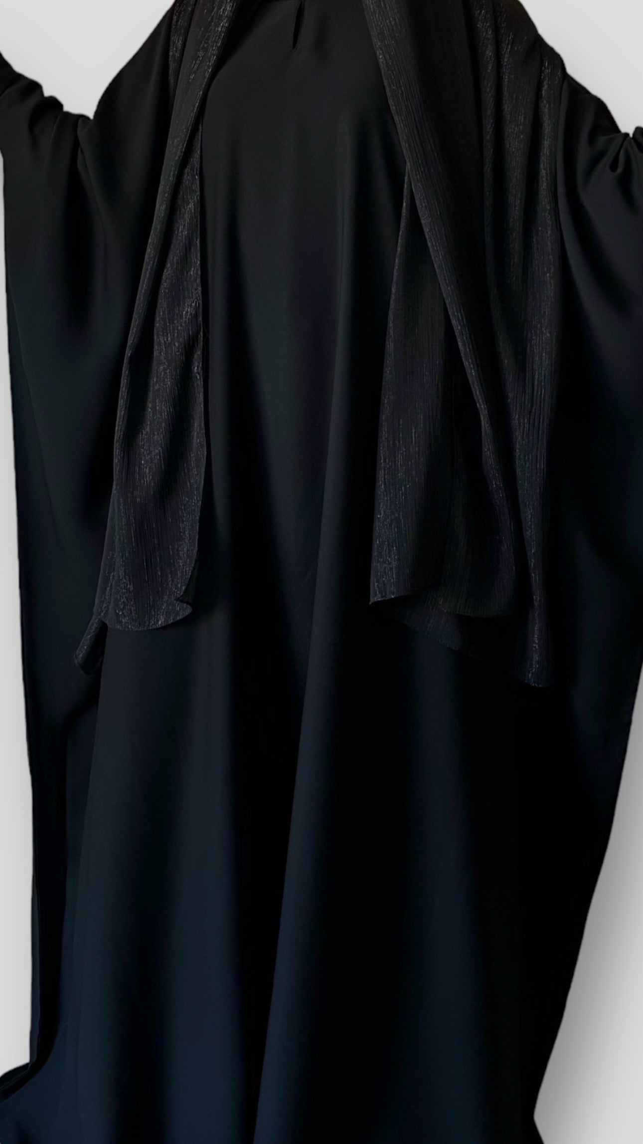 Introducing the CoCo Black abaya, a timeless and sophisticated oversized garment exuding elegance. Elevate your style with the accompanying shimmery large scarf for a polished look, or opt for a more relaxed vibe on casual days. Featuring classic cuffs and crafted from a luxurious, soft-textured fabric, this abaya offers both comfort and graceful movement, effortlessly embodying understated glamour.