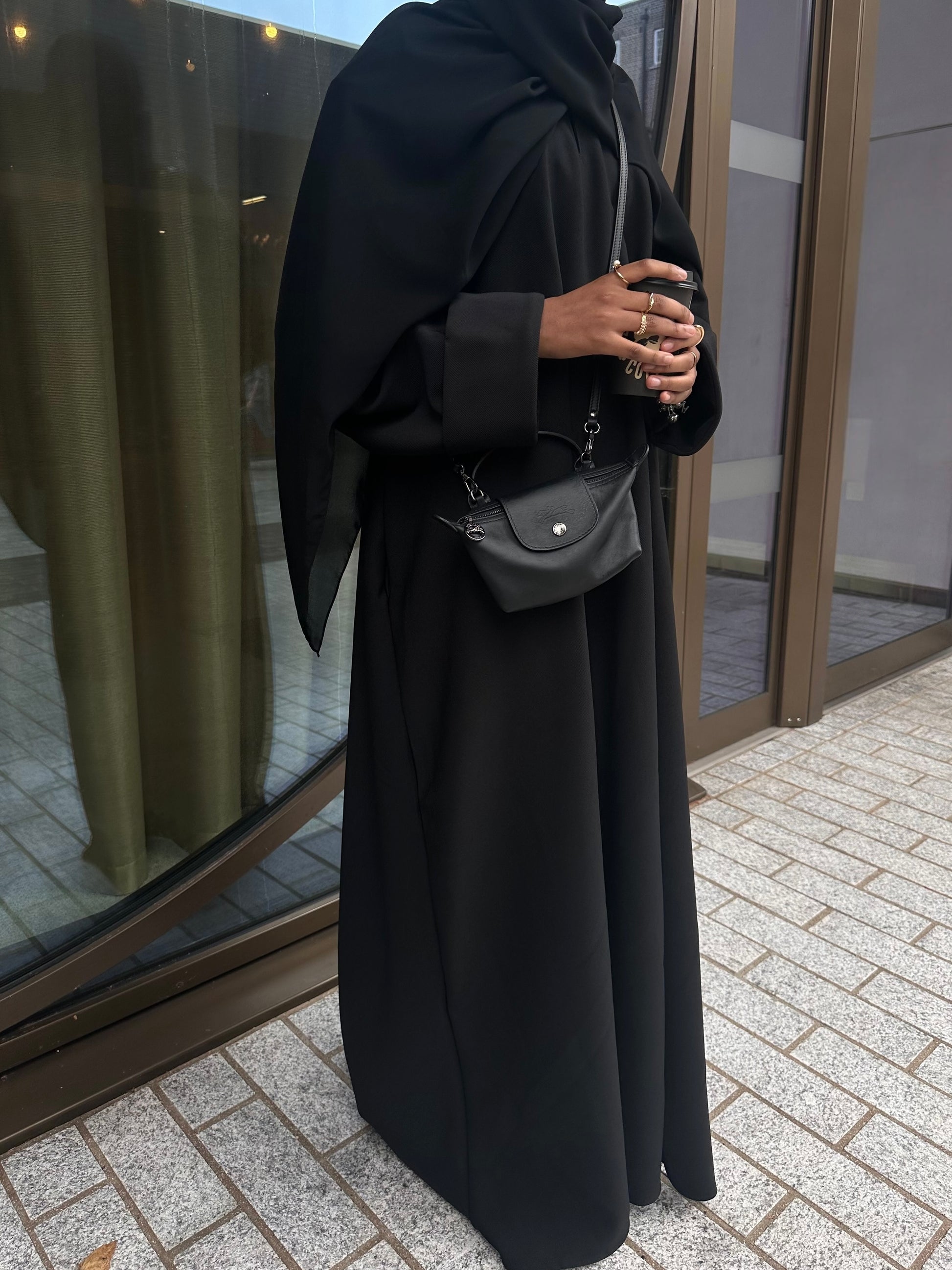 A timeless black abaya crafted from a double-faced winter fabric featuring a smooth outer surface and a soft brushed inner side for added warmth and comfort.