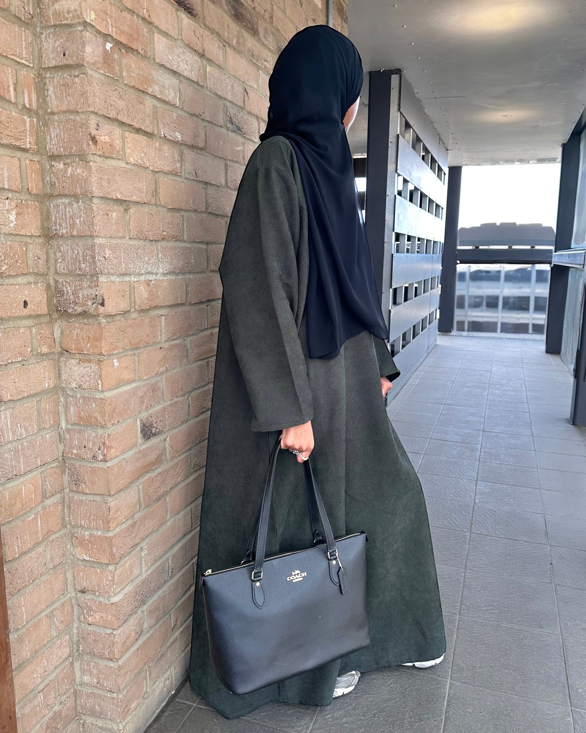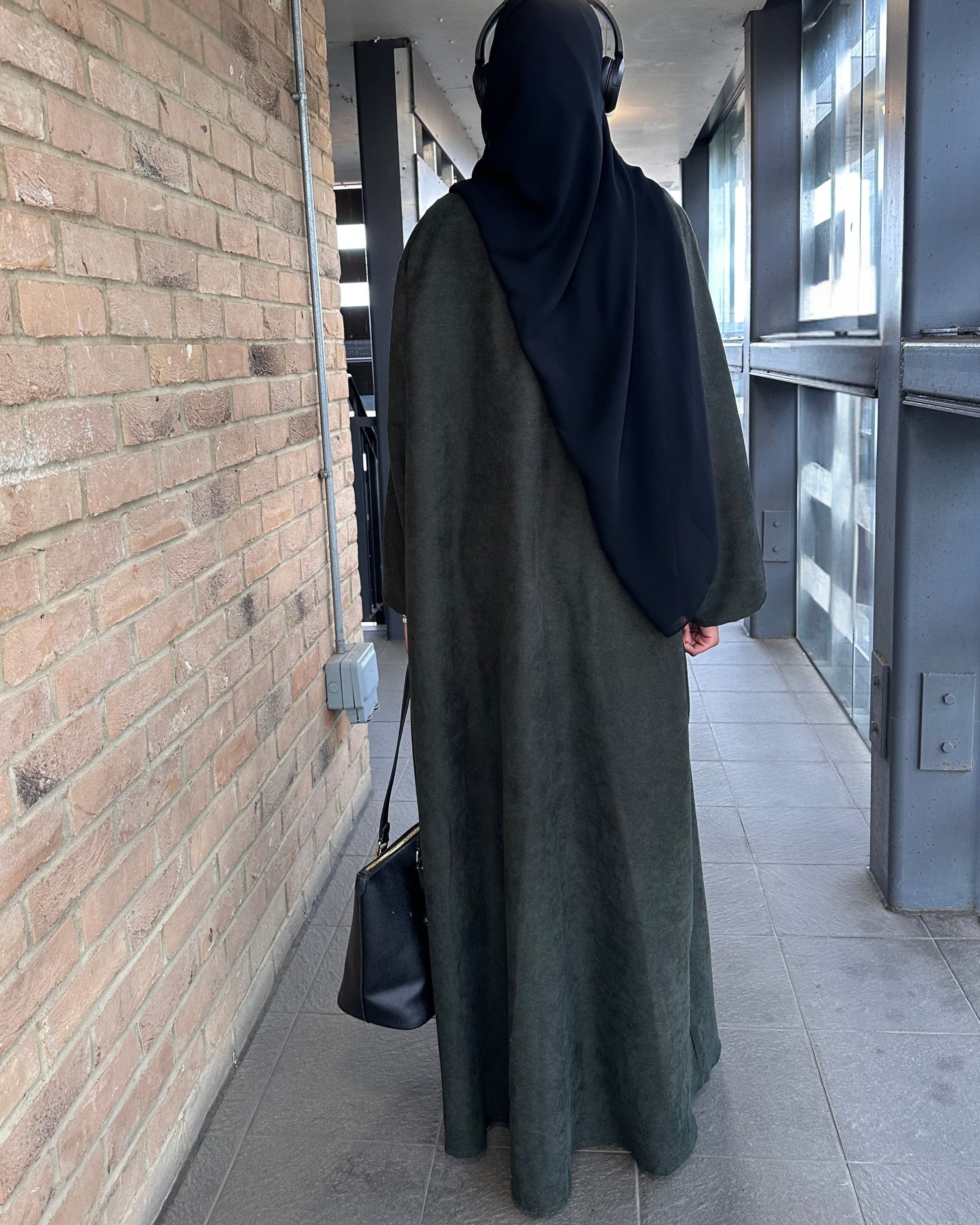 Stunning dark olive green closed corduroy abaya. This beautiful piece offers warmth and resilience while remaining effortlessly stylish for the colder seasons. Its rich colour adds a touch of elegance to your autumn and winter wardrobe, and the perfectly tailored sleeves, which are neither too wide nor too narrow, make it ideal for pairing with a coat.