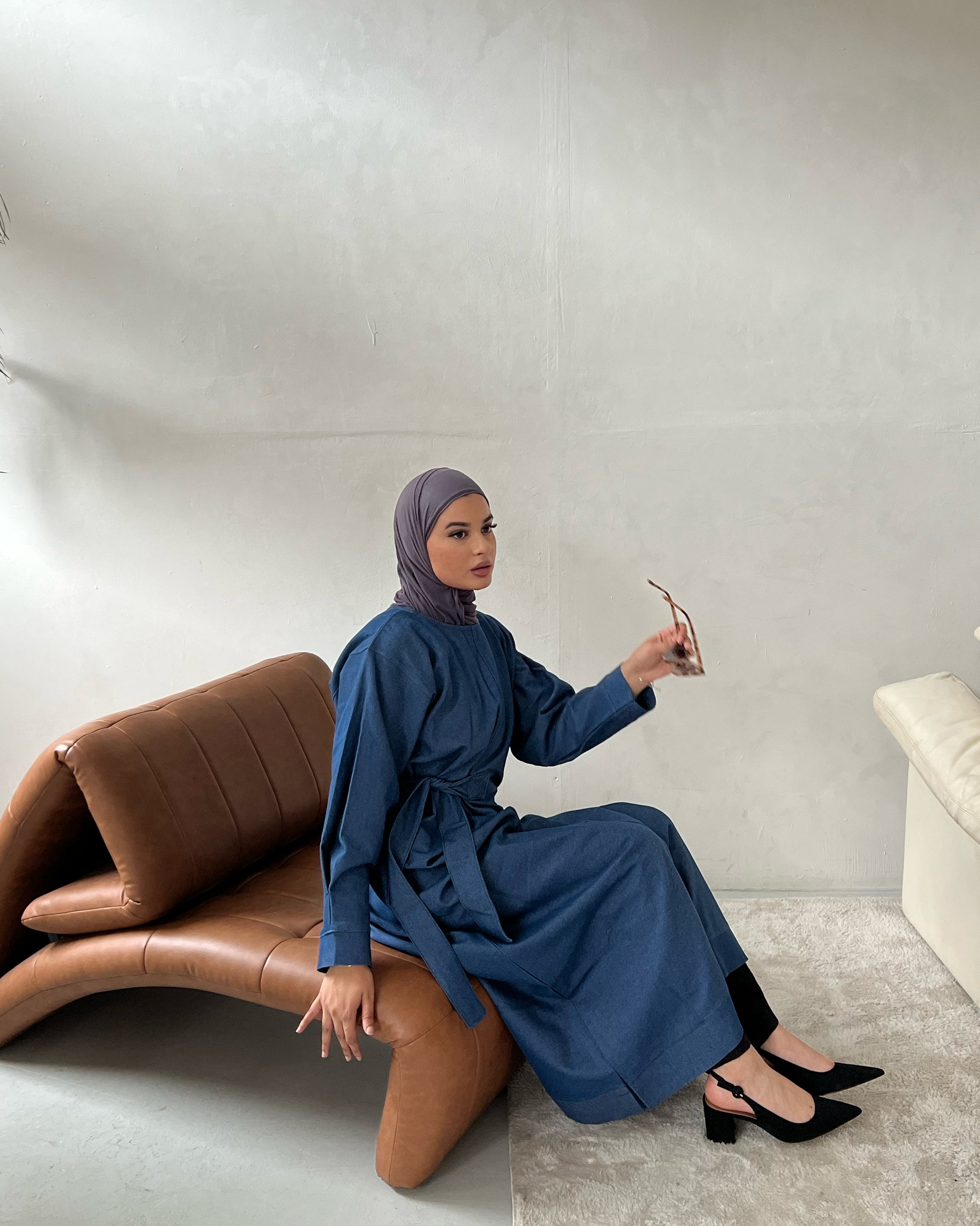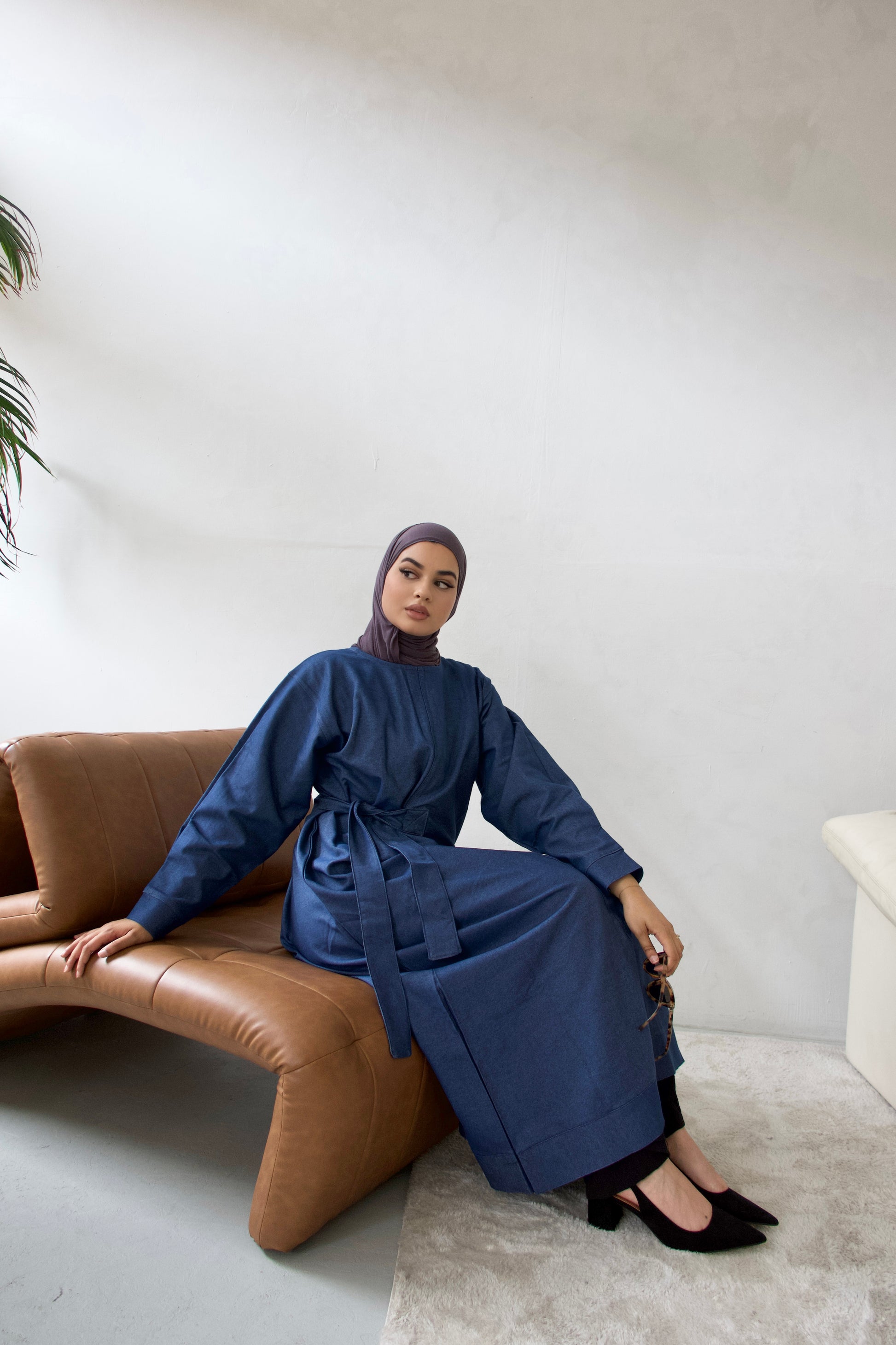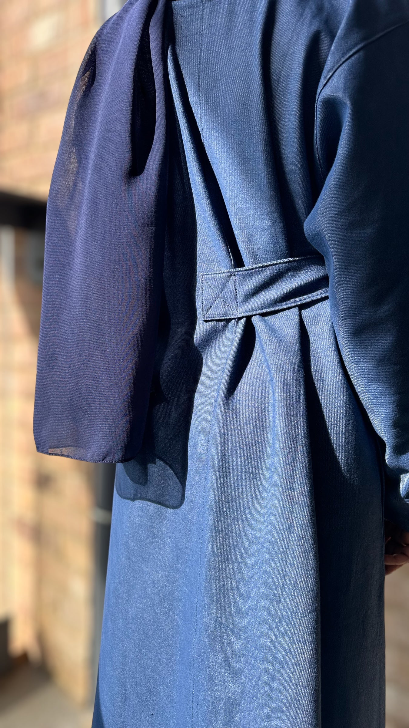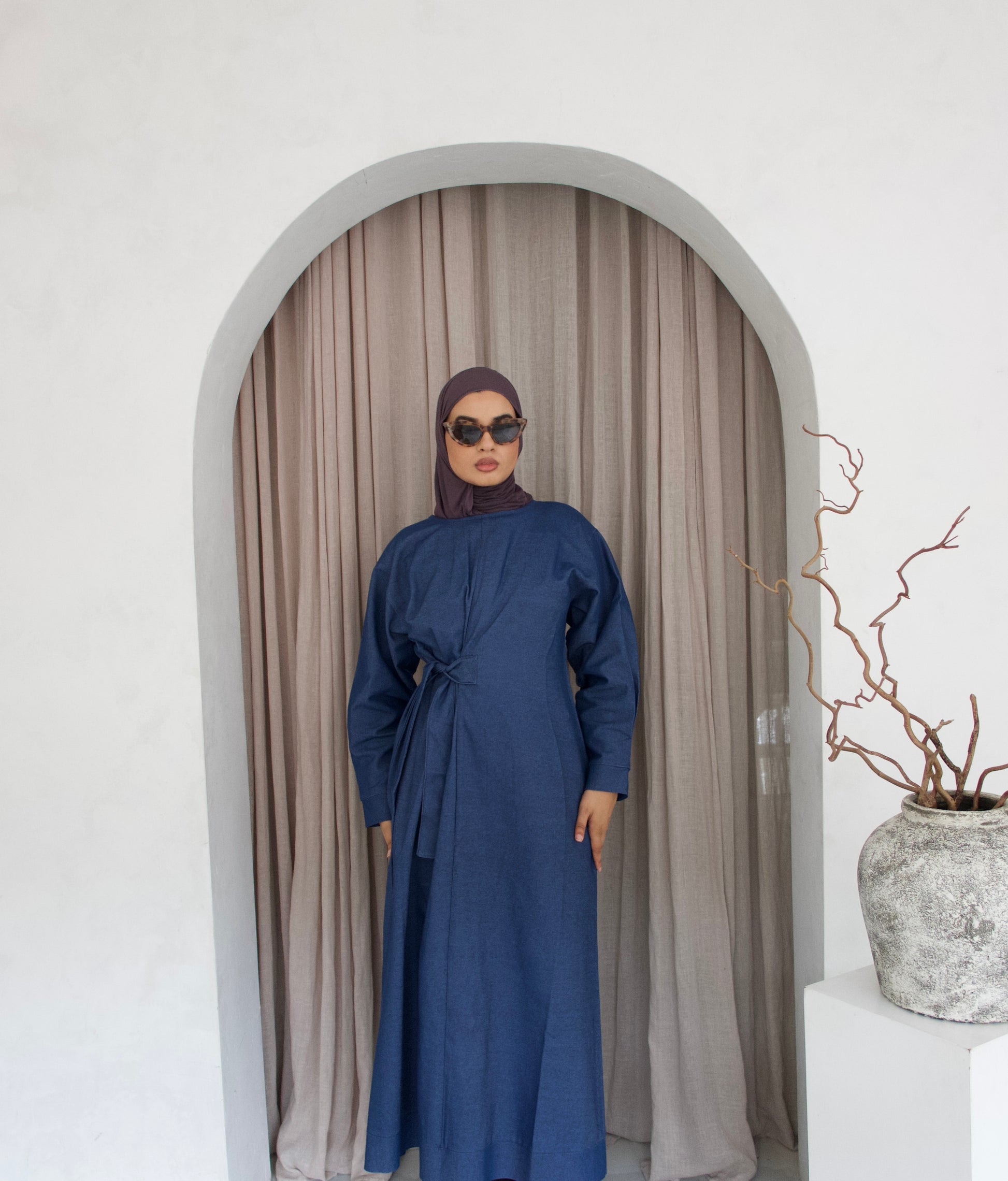 Introducing our Denim Dreamweave, a stunning denim maxi wrap dress. Adorned with intricate detailing along its long sleeves, exquisitely crafted neckline, and both front and back panels, this dress is a true standout.