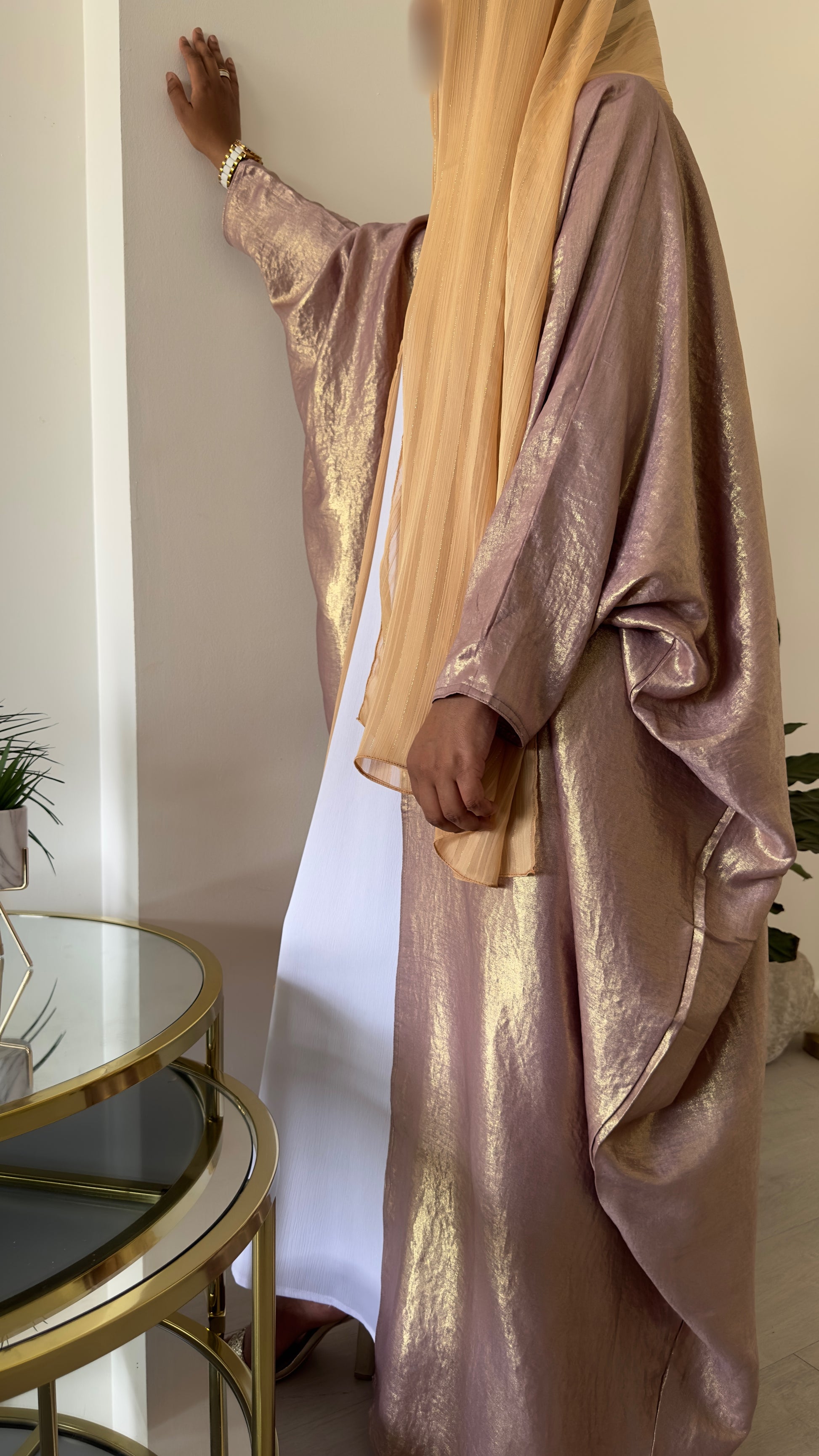 Doula is a stunning abaya with a luxurious, soft touch and a lavender undertone. Its delicate glow makes it perfect for Eid celebrations or special evenings. Comes with an elegant maxi scarf.