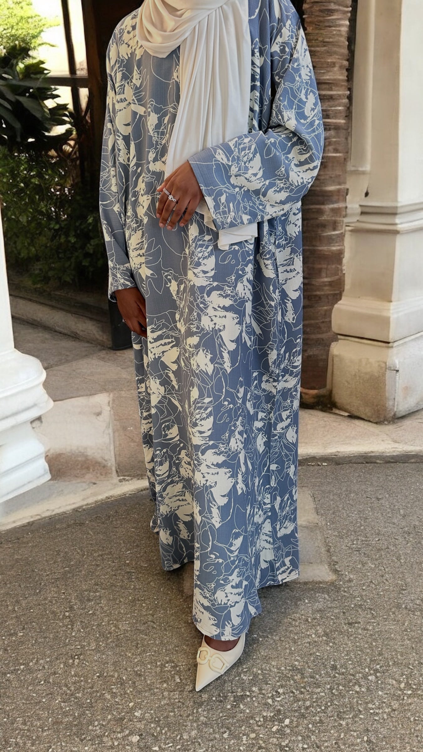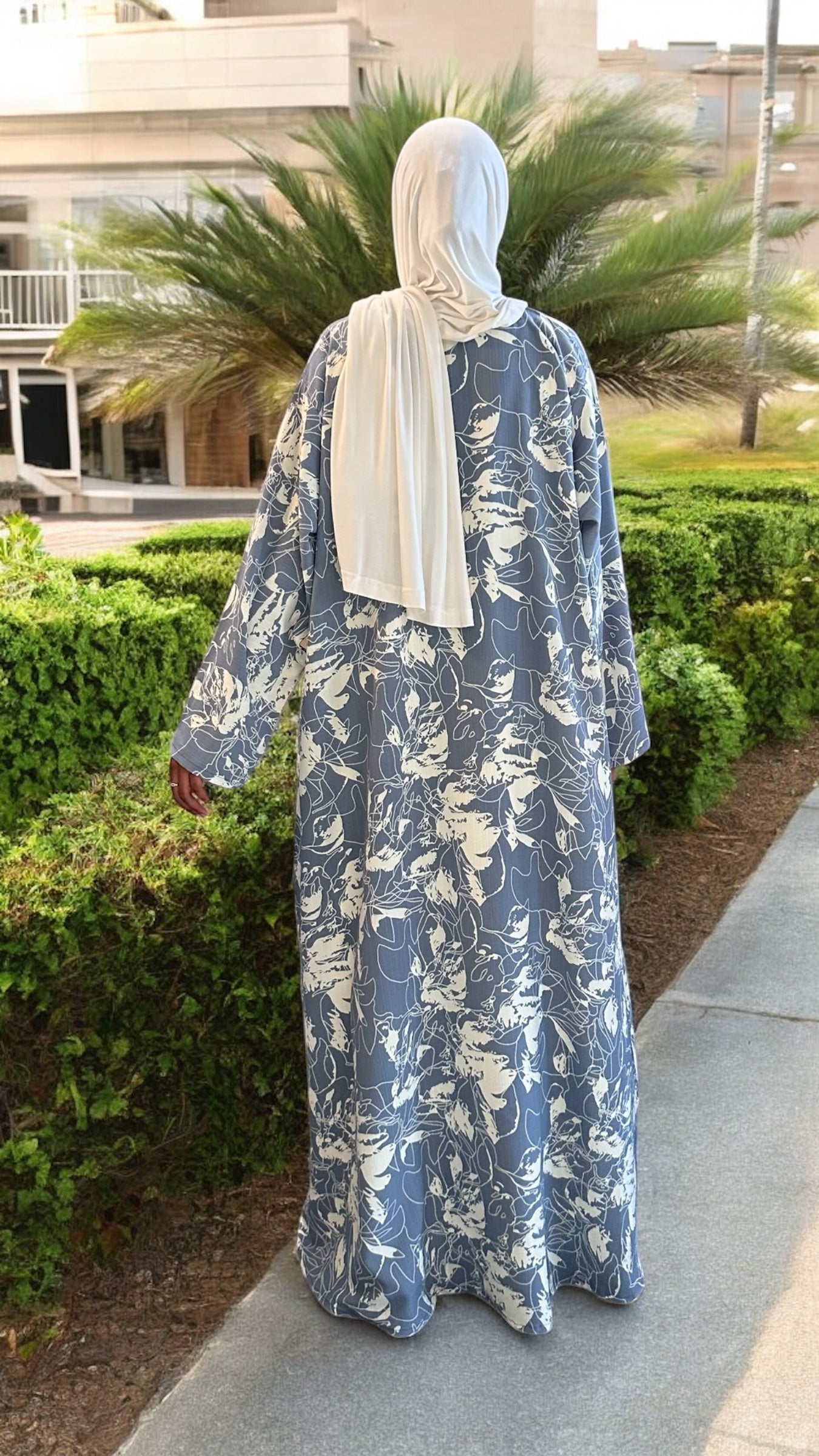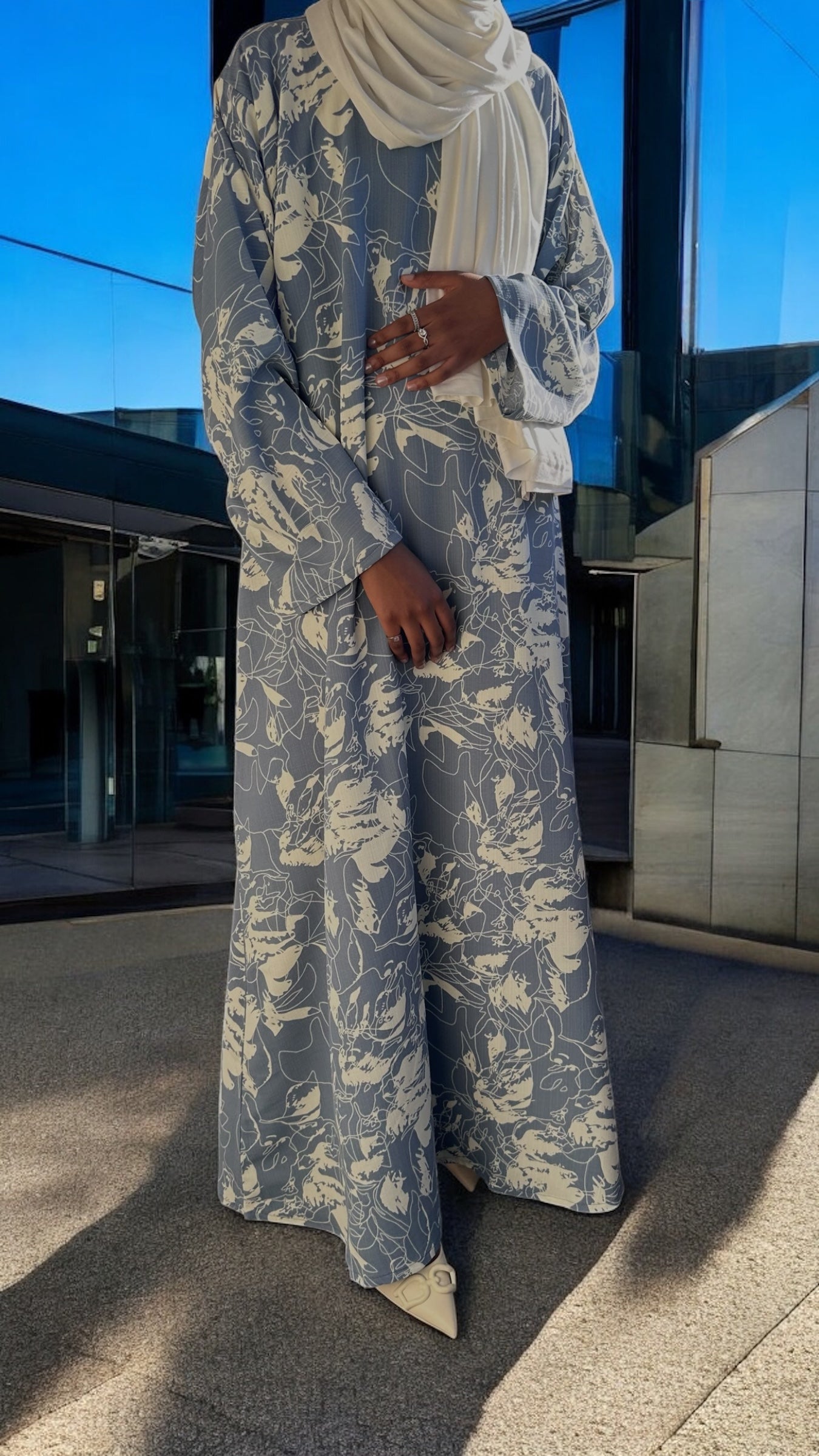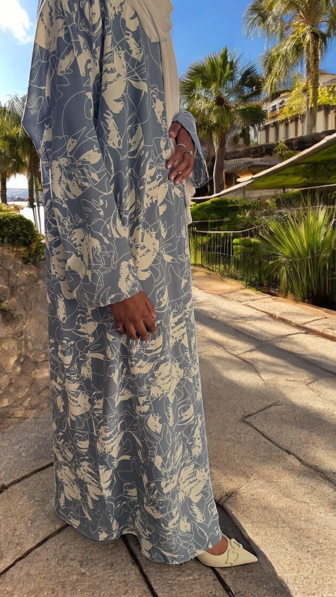 Sophisticated yet casual, this dusty blue abaya is a summer wardrobe staple. The lightweight fabric keeps you cool without compromising style. Delicate ivory abstract floral print detailing adds a contemporary twist to the classic abaya dress cut. Easy to dress up or down, this piece is a go-to for summer evenings or errands.