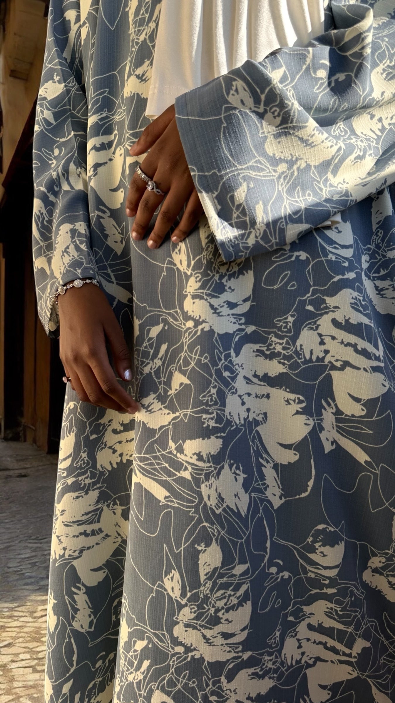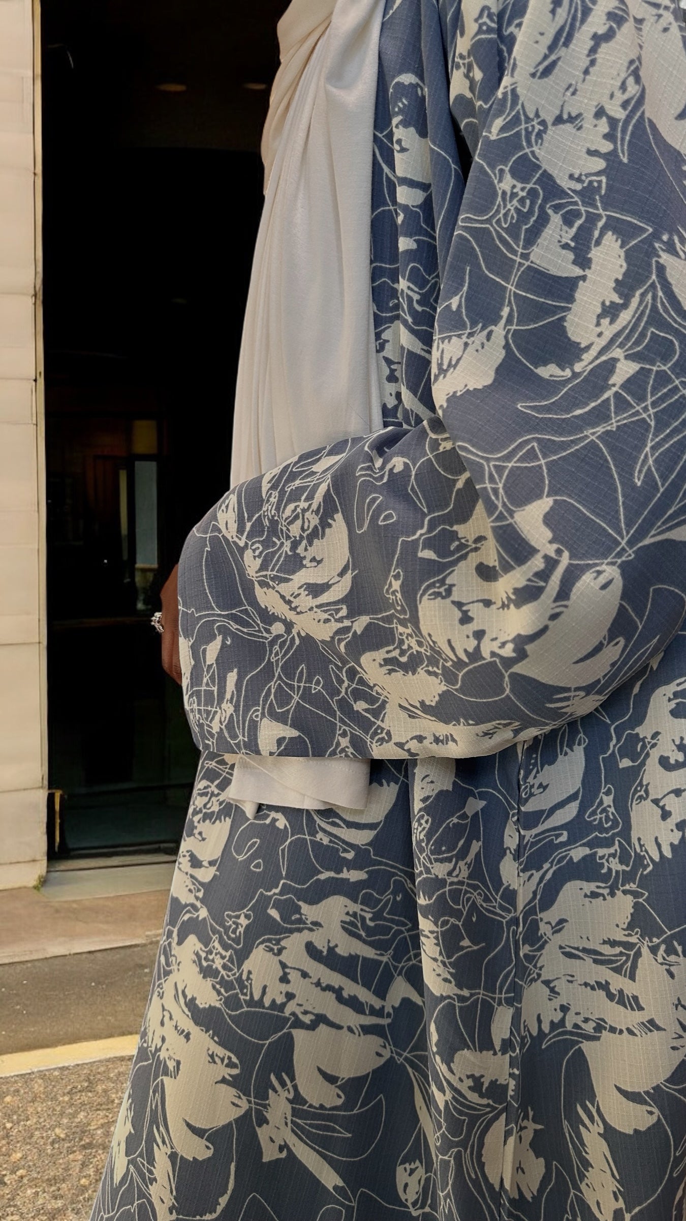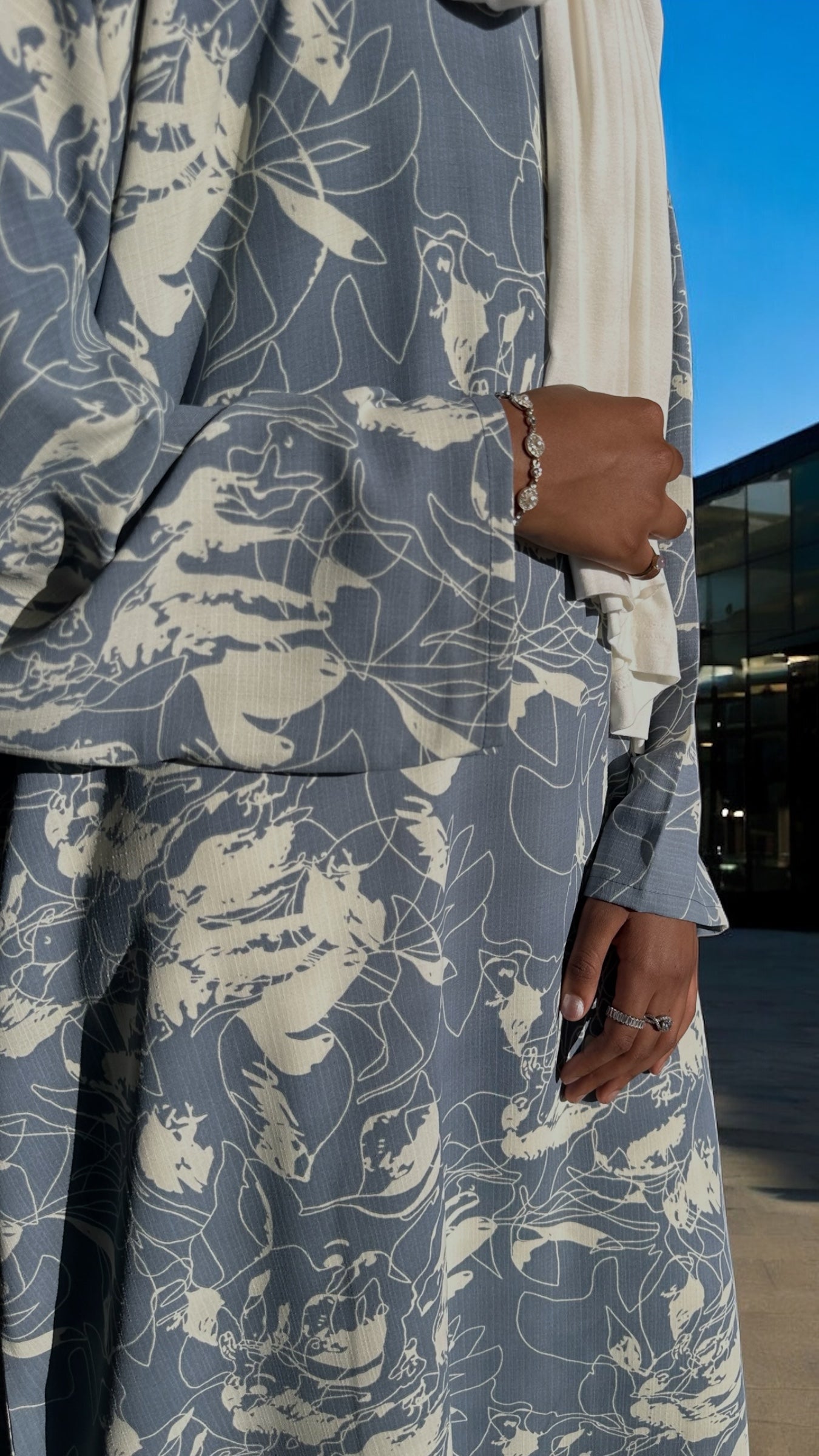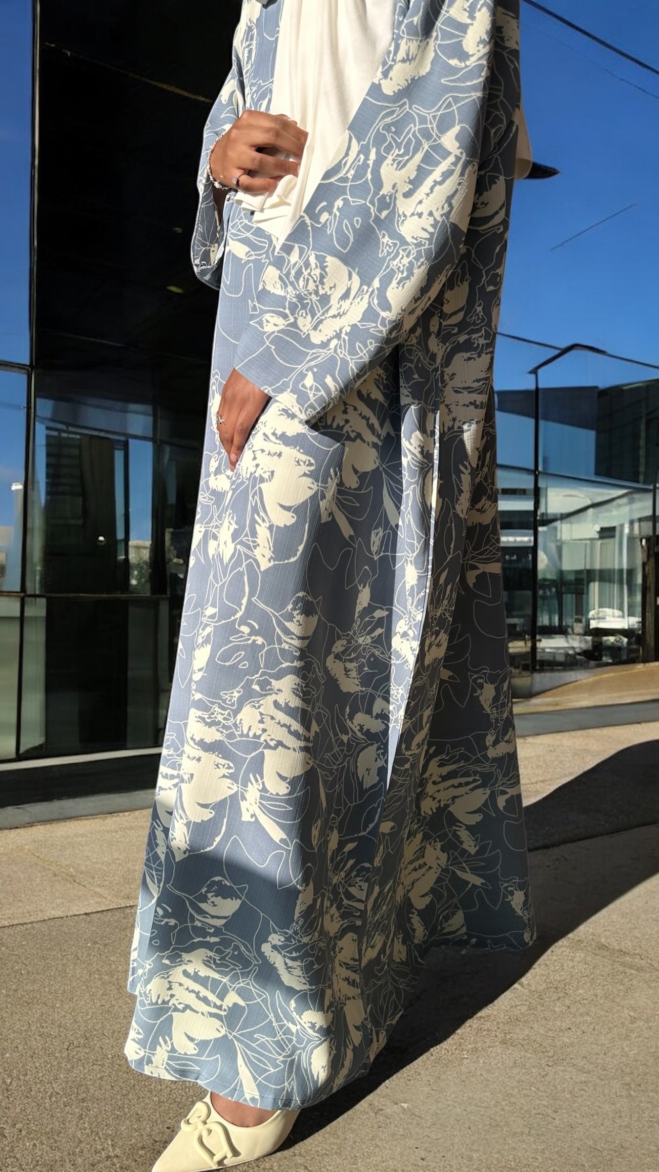Sophisticated yet casual, this dusty blue abaya is a summer wardrobe staple. The lightweight fabric keeps you cool without compromising style. Delicate ivory abstract floral print detailing adds a contemporary twist to the classic abaya dress cut. Easy to dress up or down, this piece is a go-to for summer evenings or errands.