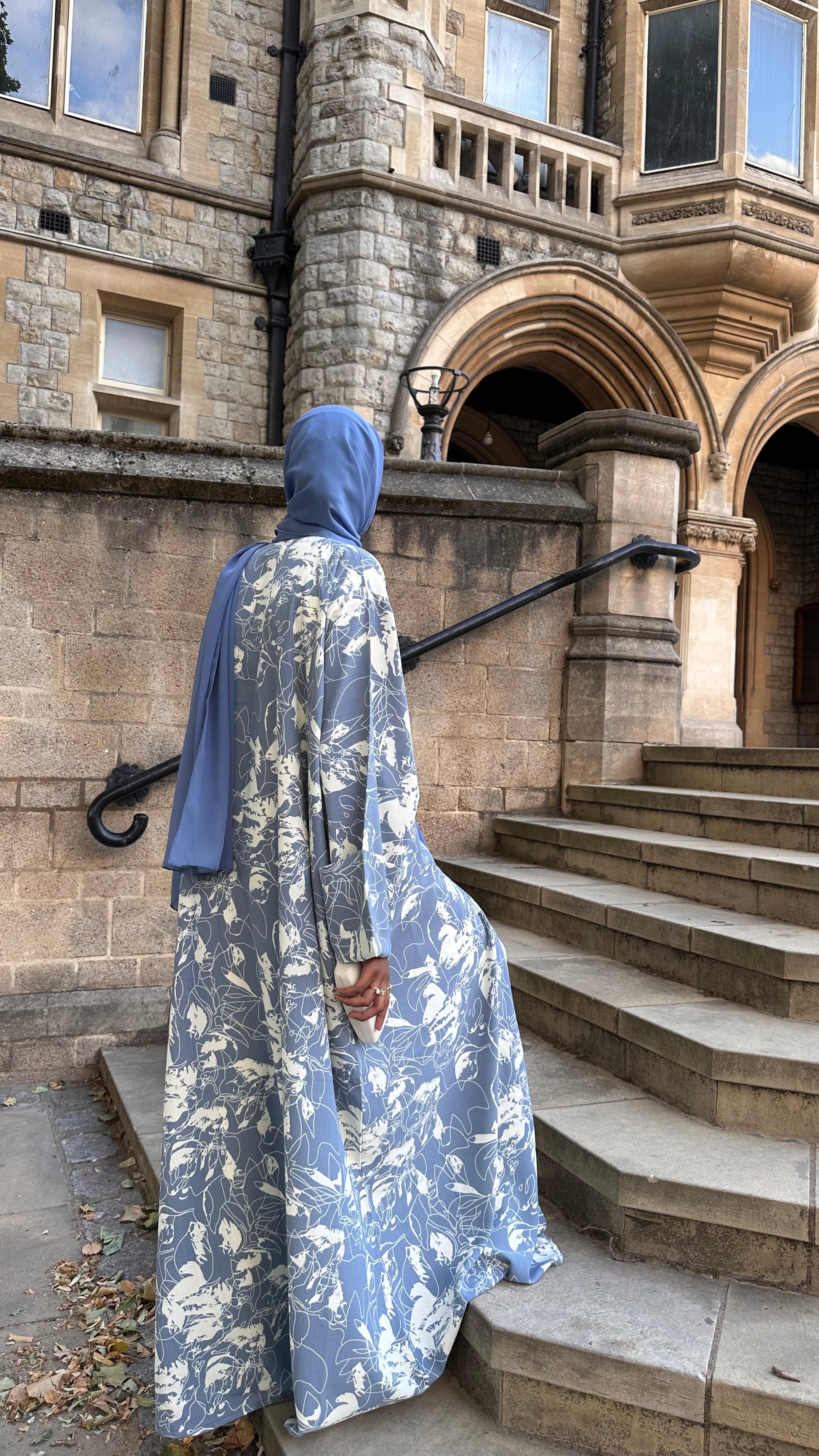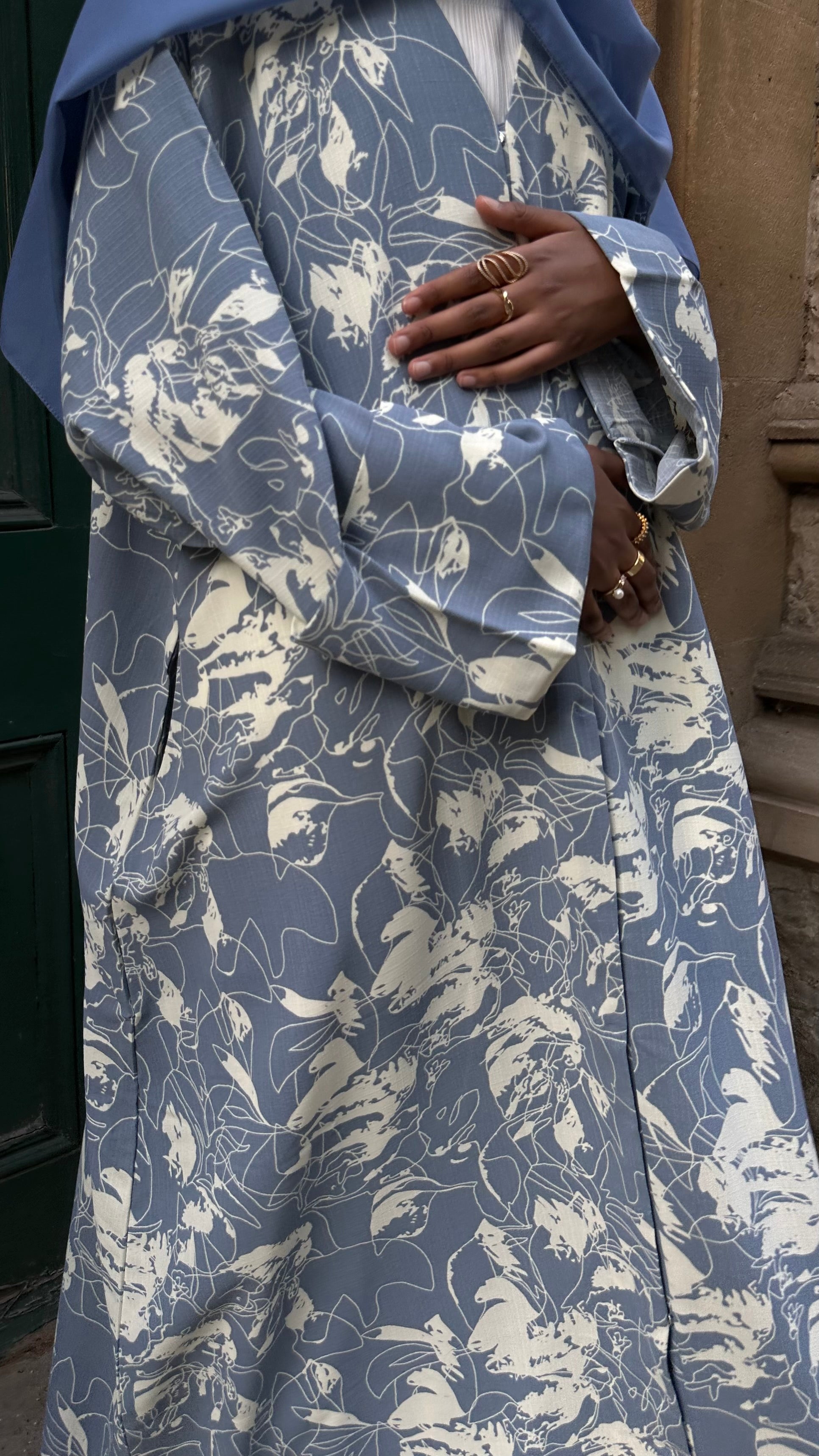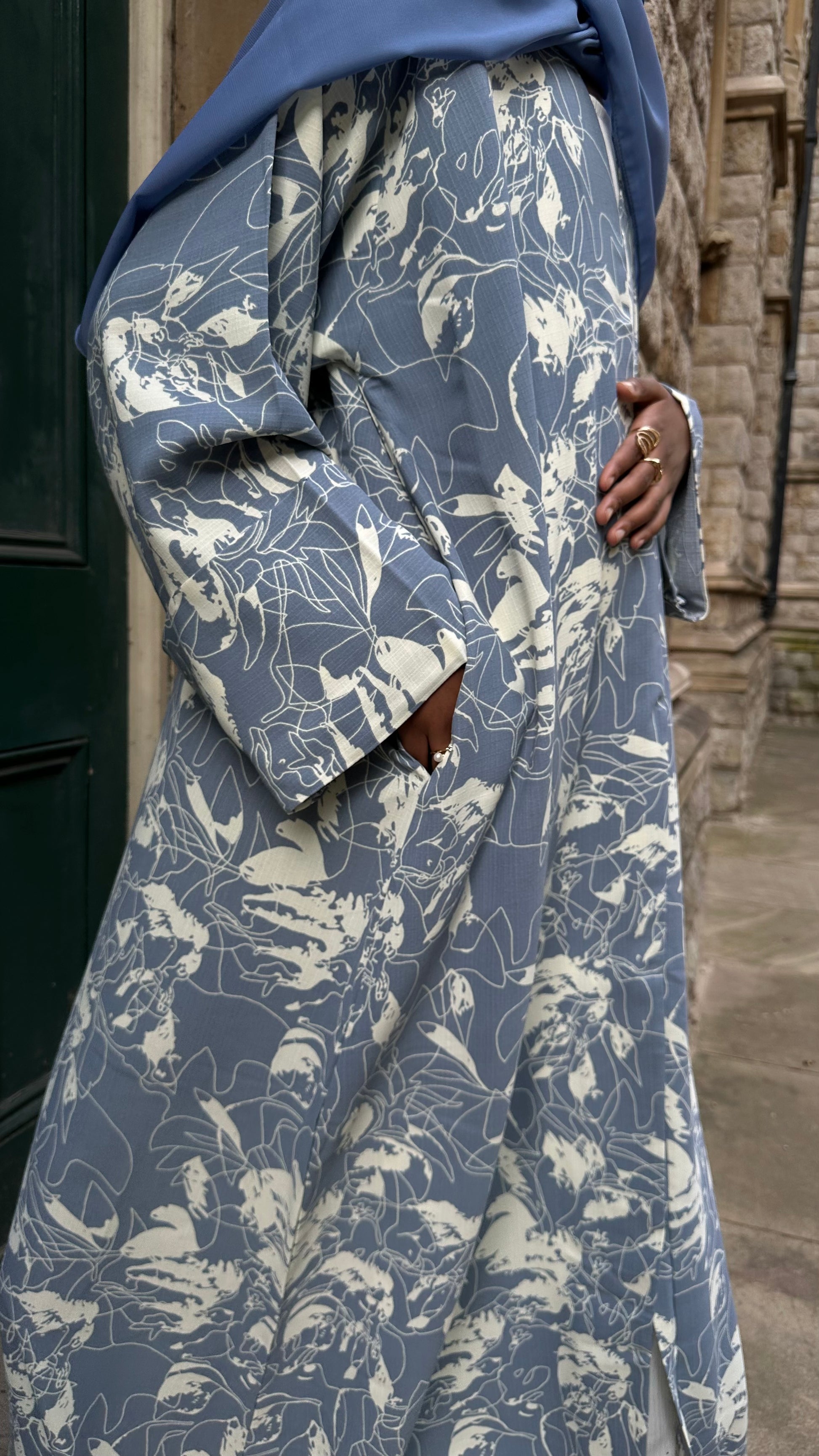Softly structured and endlessly versatile, this dusty blue open kimono abaya is your understated summer statement. The muted blue hue pairs beautifully with ivory abstract floral detailing, creating a balanced blend of calm and charm. Designed with folded sleeves, hidden side pockets, and front buttons, it transitions seamlessly from open layering to a closed, polished look.Complete with a complementary maxi scarf, this piece delivers refined modesty with a modern edge.