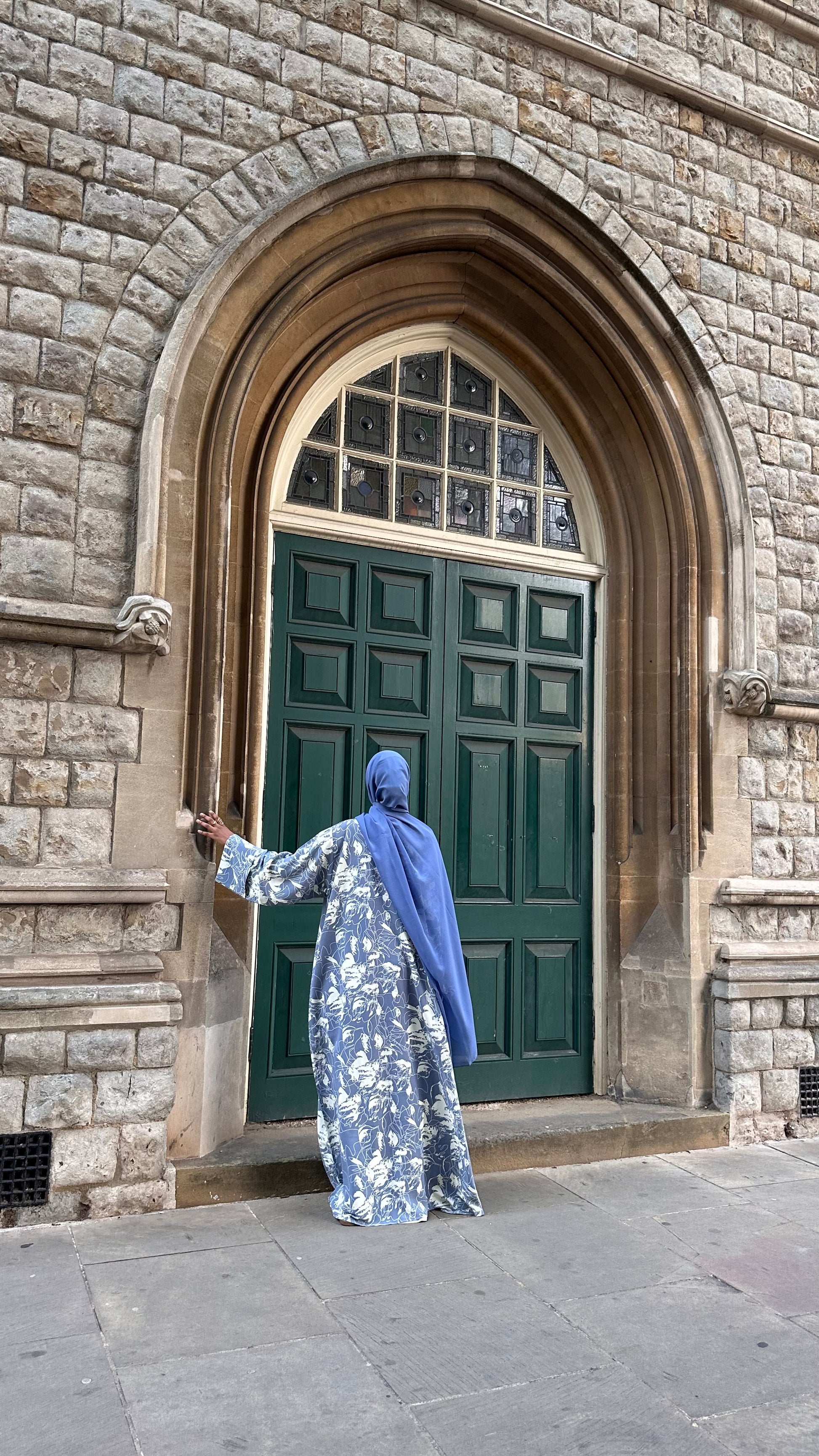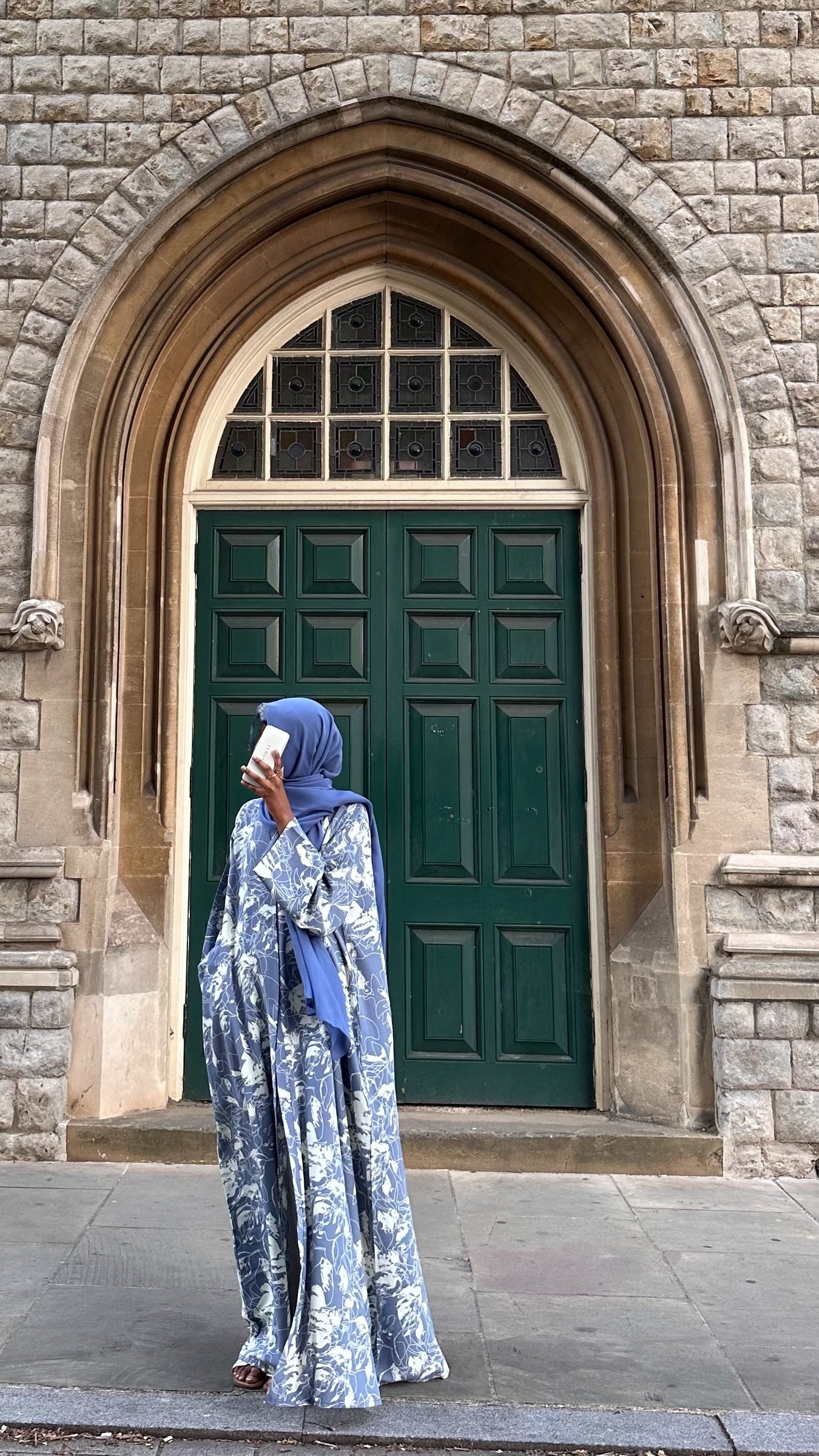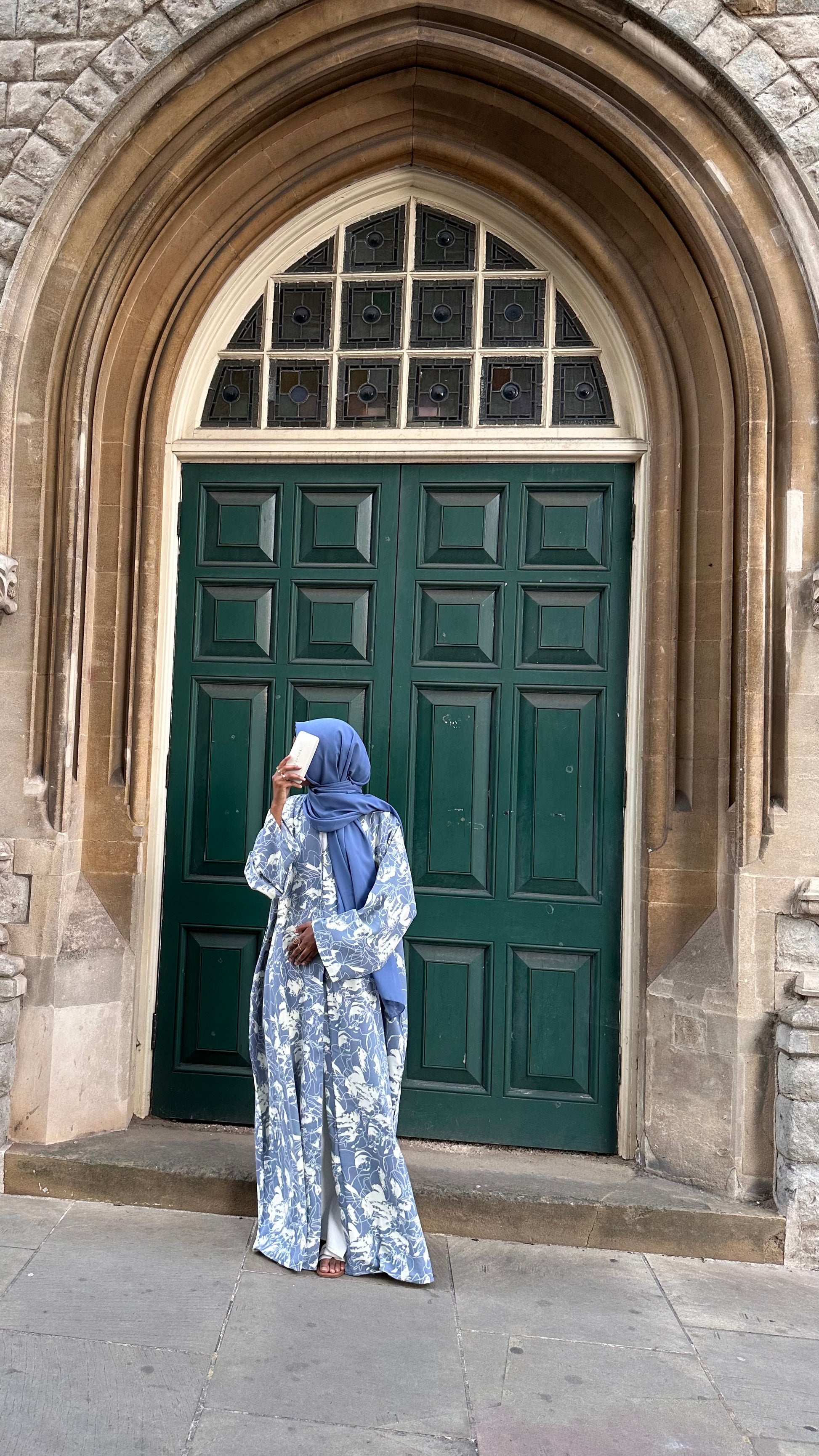 Softly structured and endlessly versatile, this dusty blue open kimono abaya is your understated summer statement. The muted blue hue pairs beautifully with ivory abstract floral detailing, creating a balanced blend of calm and charm. Designed with folded sleeves, hidden side pockets, and front buttons, it transitions seamlessly from open layering to a closed, polished look.Complete with a complementary maxi scarf, this piece delivers refined modesty with a modern edge.