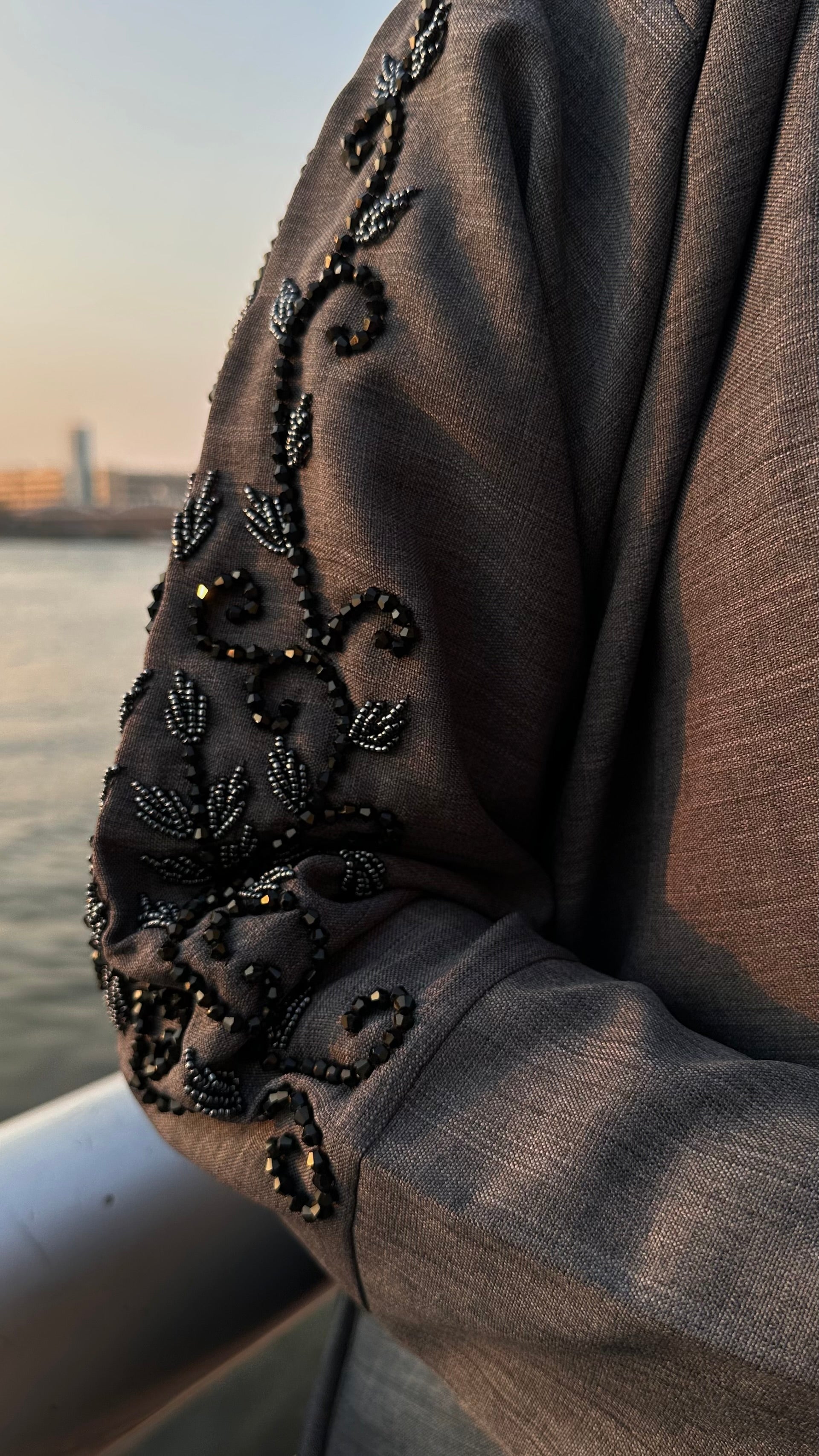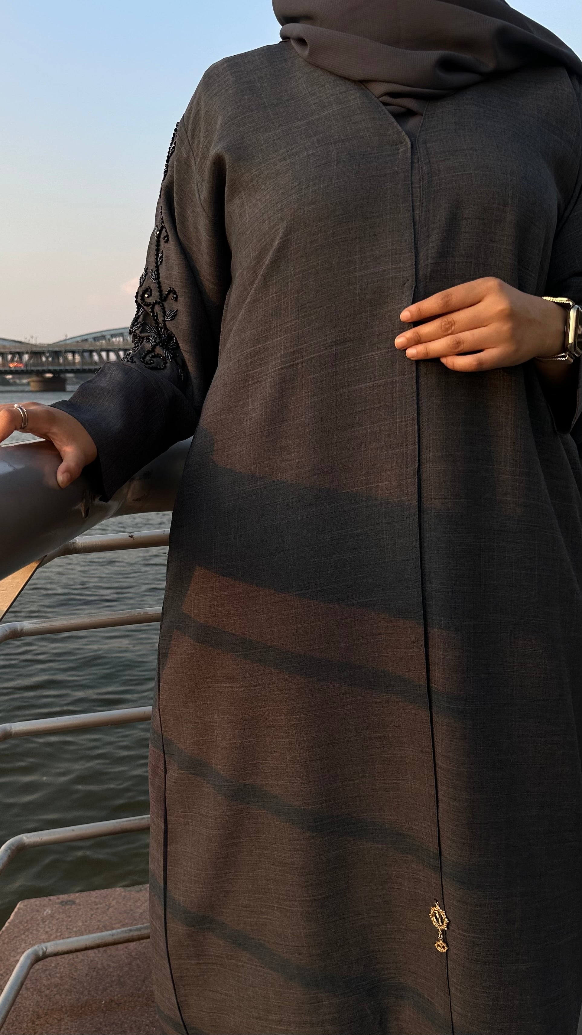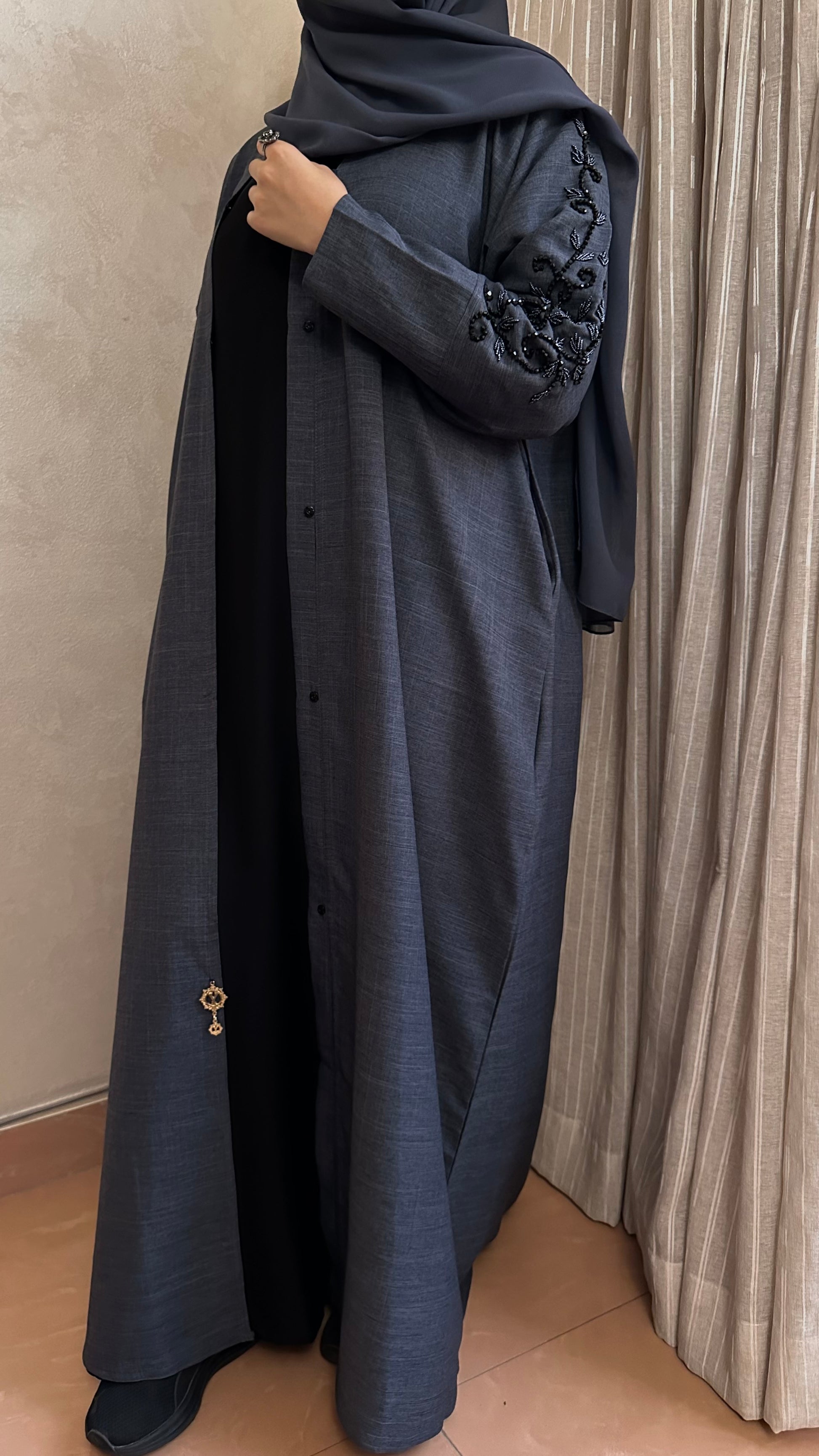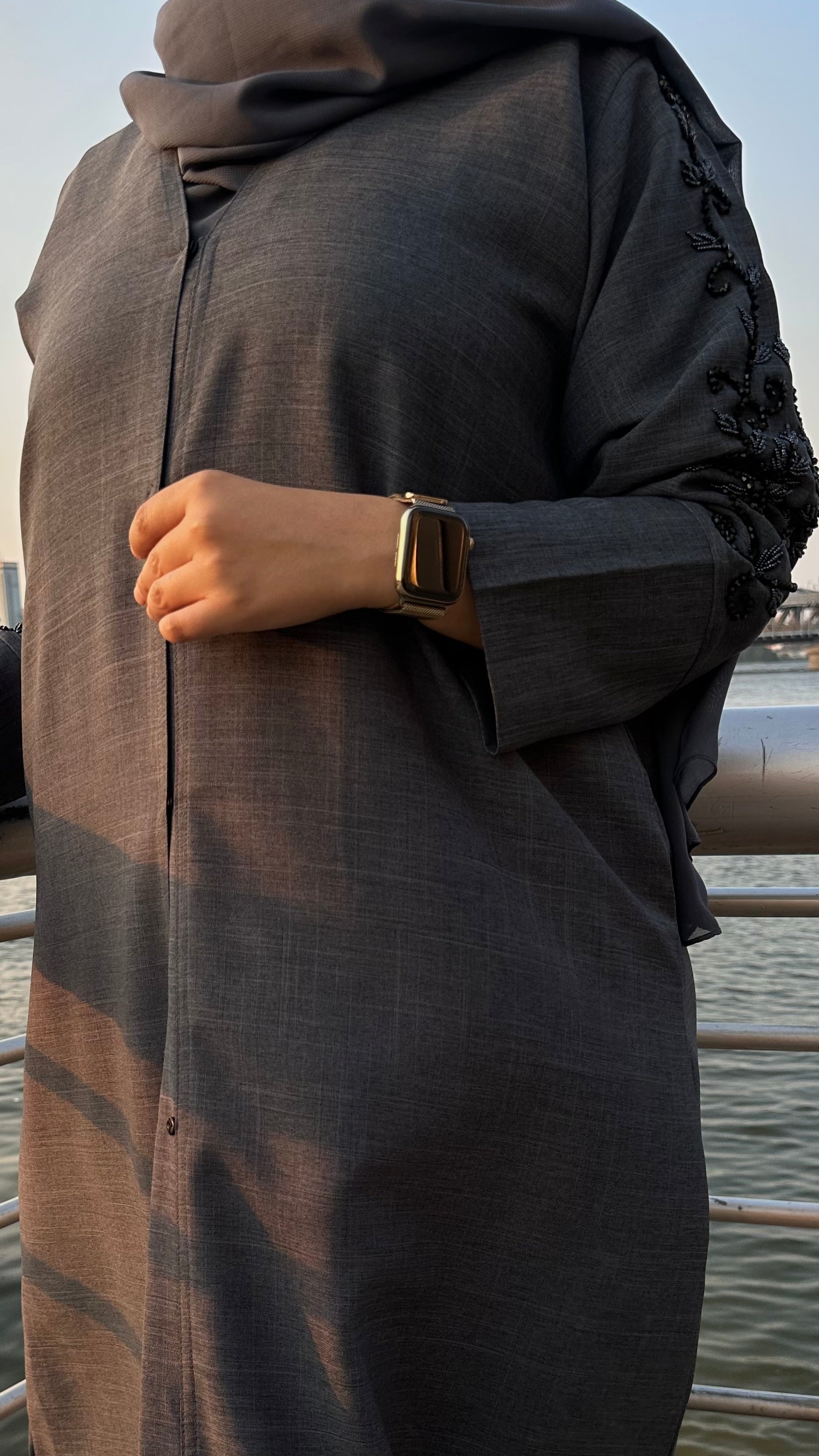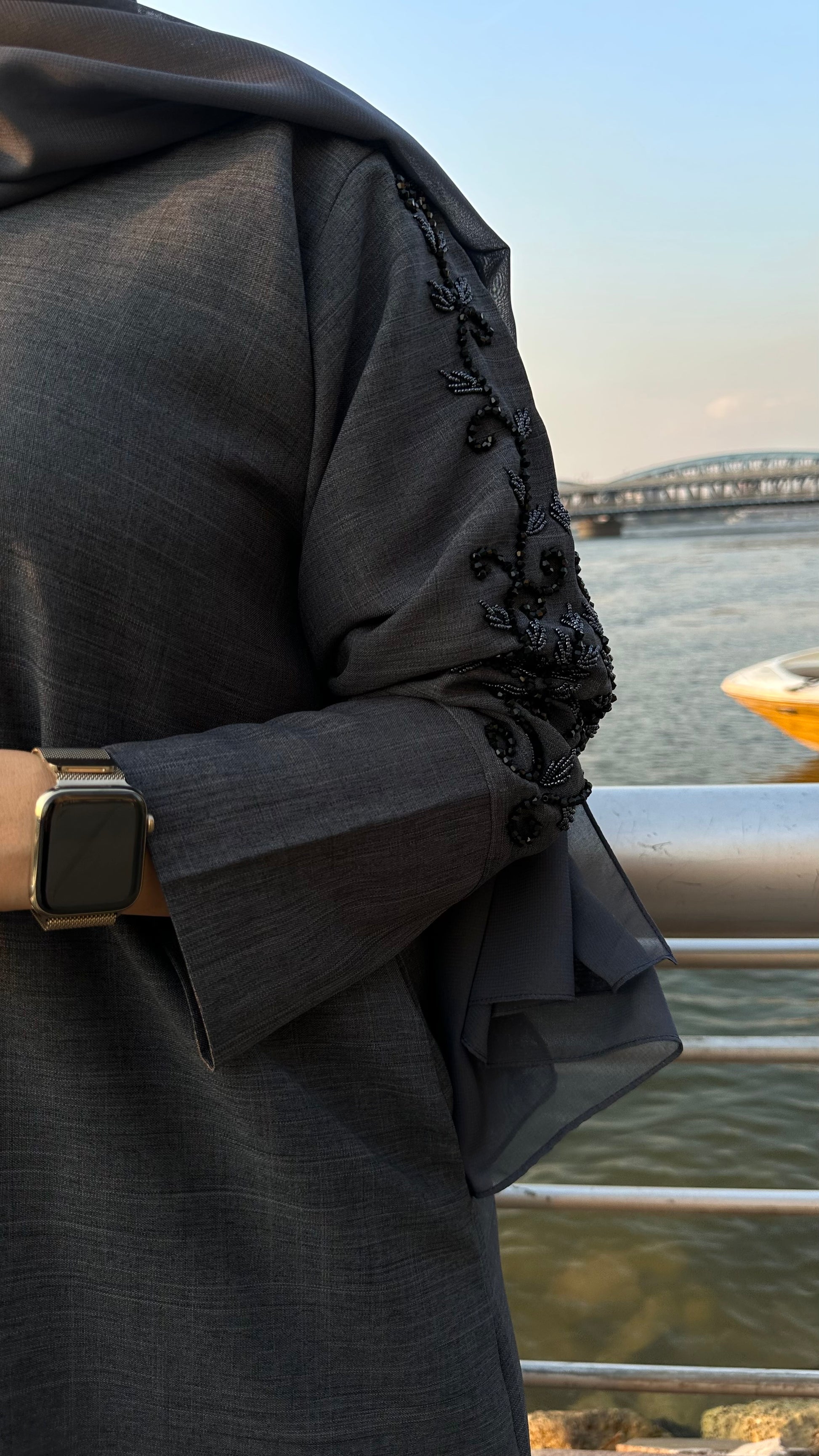 Embrace effortless elegance with this beautifully crafted grey linen abaya, designed for both style and comfort. The abaya features a full button down front and two side pockets, blending practicality with chic design. Intricate beadwork on the sleeves adds a subtle touch of luxury, elevating the natural texture of the linen fabric. Paired with a soft, generously sized grey scarf, this abaya creates a complete, refined look.