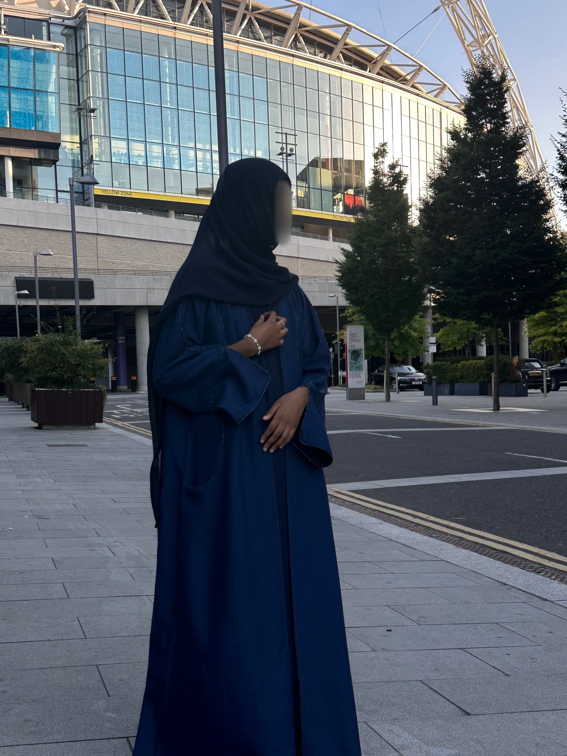 This beautiful blue open linen abaya is designed to be both elegant and practical. It features detailed embellishments that add a touch of sophistication and two deep, stylish pockets for convenience. The abaya comes with a soft, embellished maxi scarf that completes the look, making it perfect for any occasion.