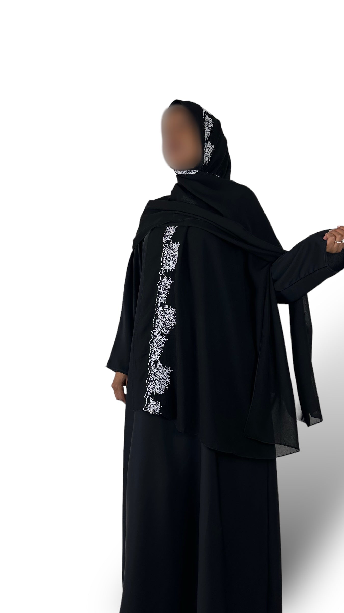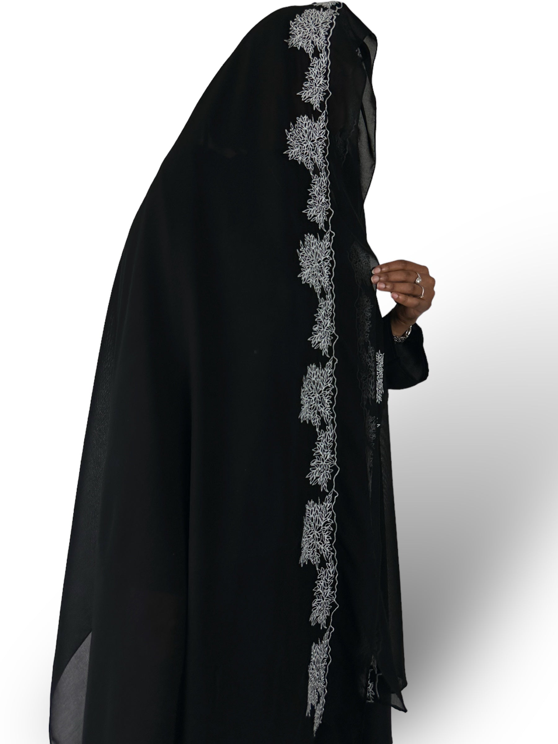Elevate your style with this gorgeous black maxi scarf adorned with delicate white floral embroidery, perfect for wearing as a headscarf. Crafted from soft fabric, it exudes elegance and charm, adding sophistication to any ensemble. Its versatile design allows for effortless styling, making it a must have accessory for any occasion.