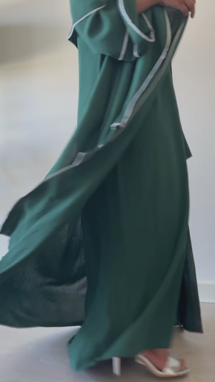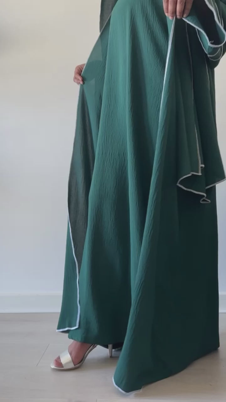 Emerald abaya is the best summer abaya set. It comes with a matching maxi scarf and a slip dress. This abaya set is soft, lightweight and flowy.