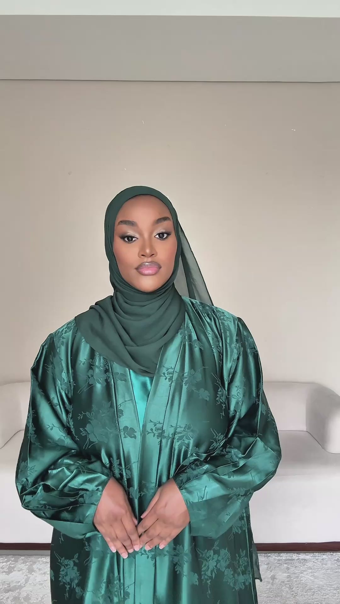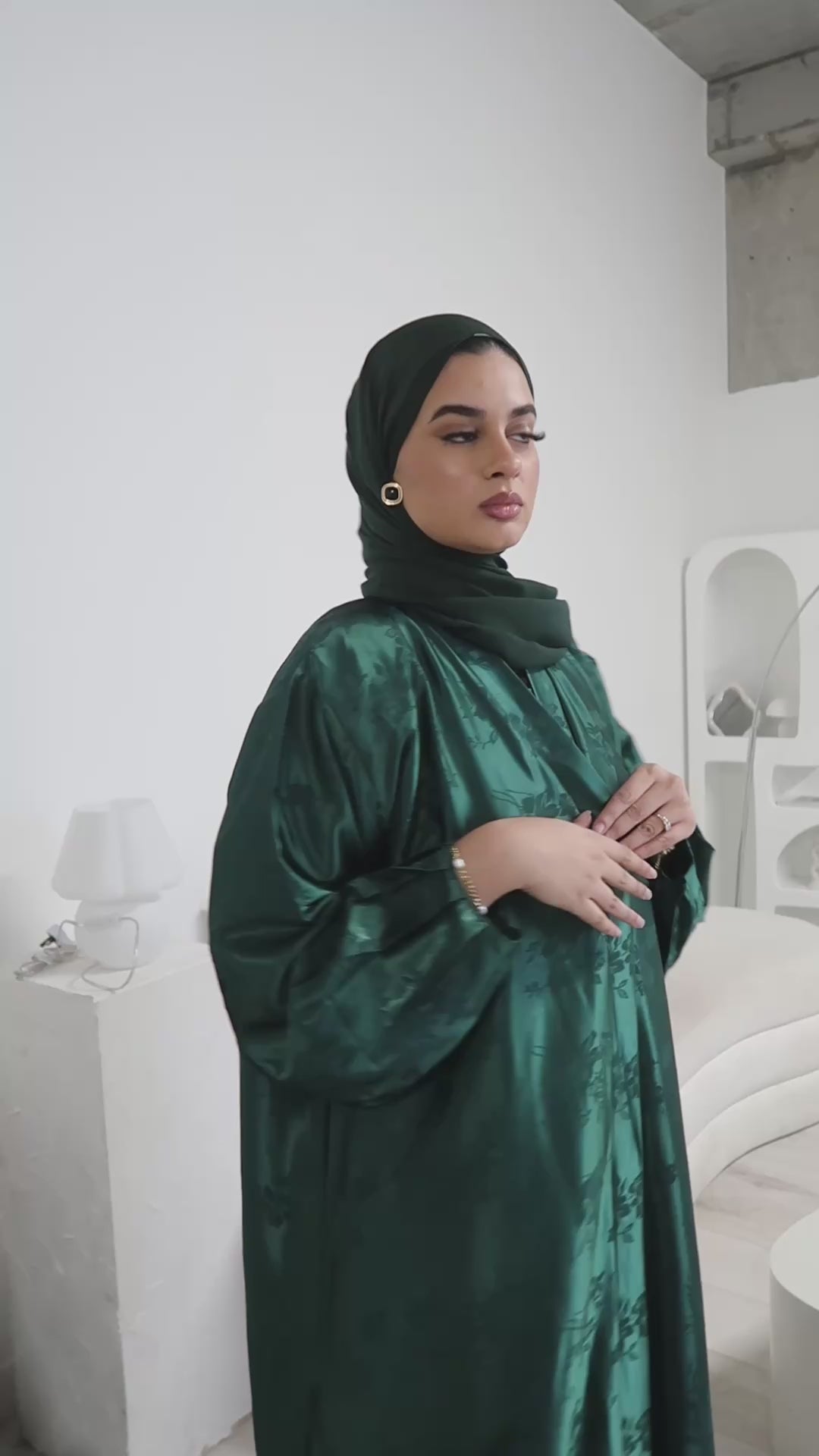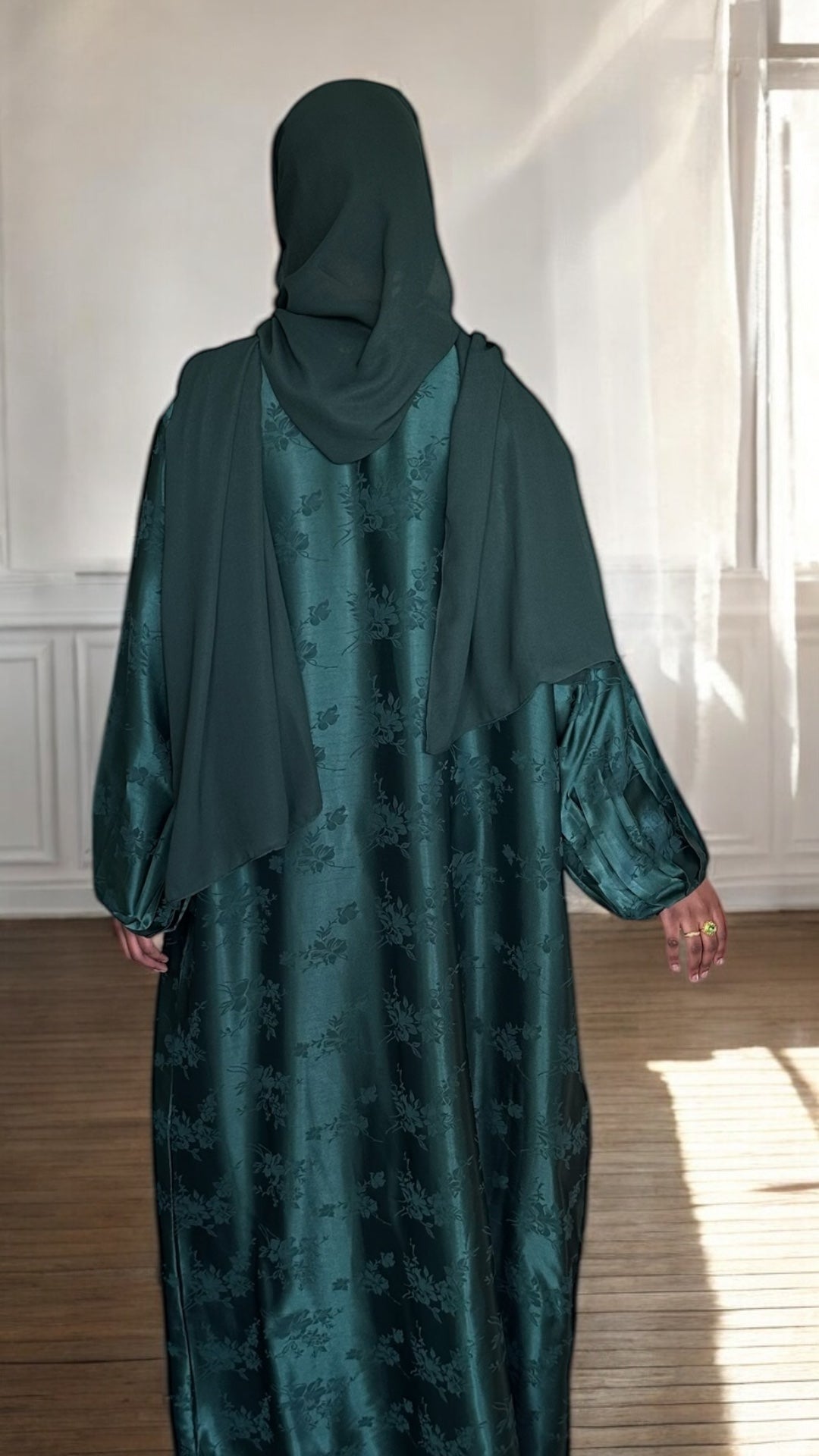 A beautifully designed floral green open abaya, crafted from soft, silky jacquard, exudes sophistication and timeless elegance. The delicate pleated cuffs add a refined touch, while the luxurious texture enhances its graceful appeal, making it a perfect choice for any occasion. Paired with a premium satin silk full dress and a matching maxi scarf, this abaya offers an effortlessly elegant and polished look.