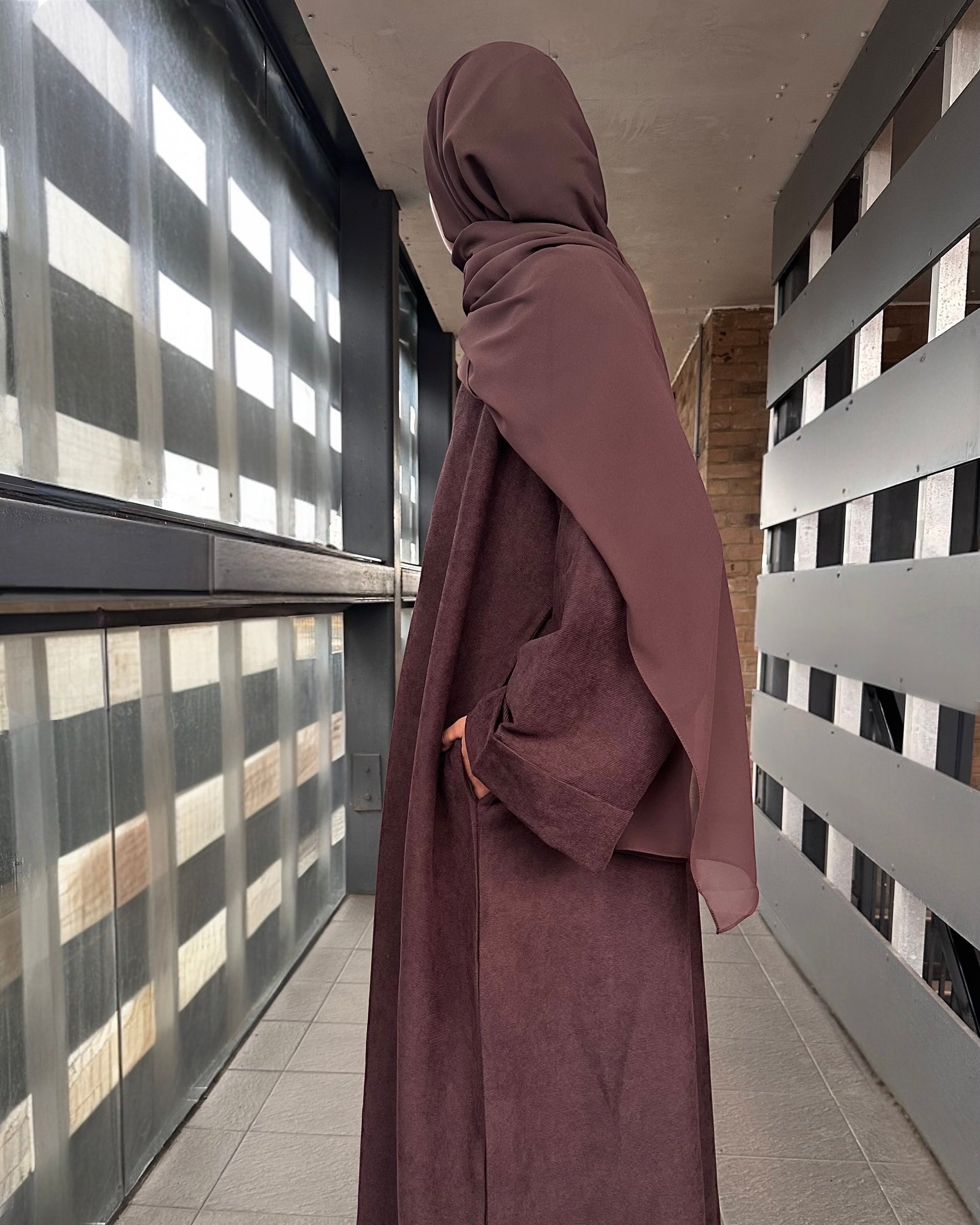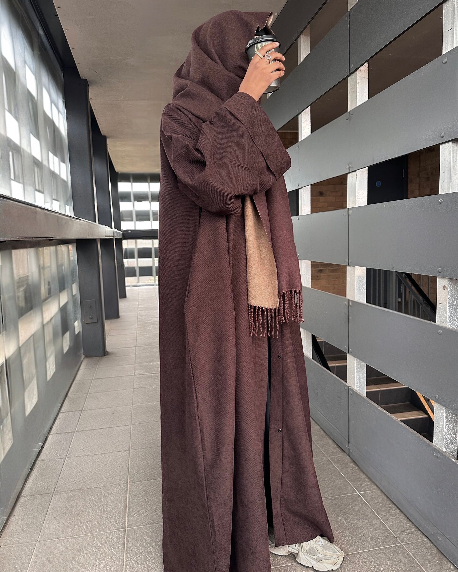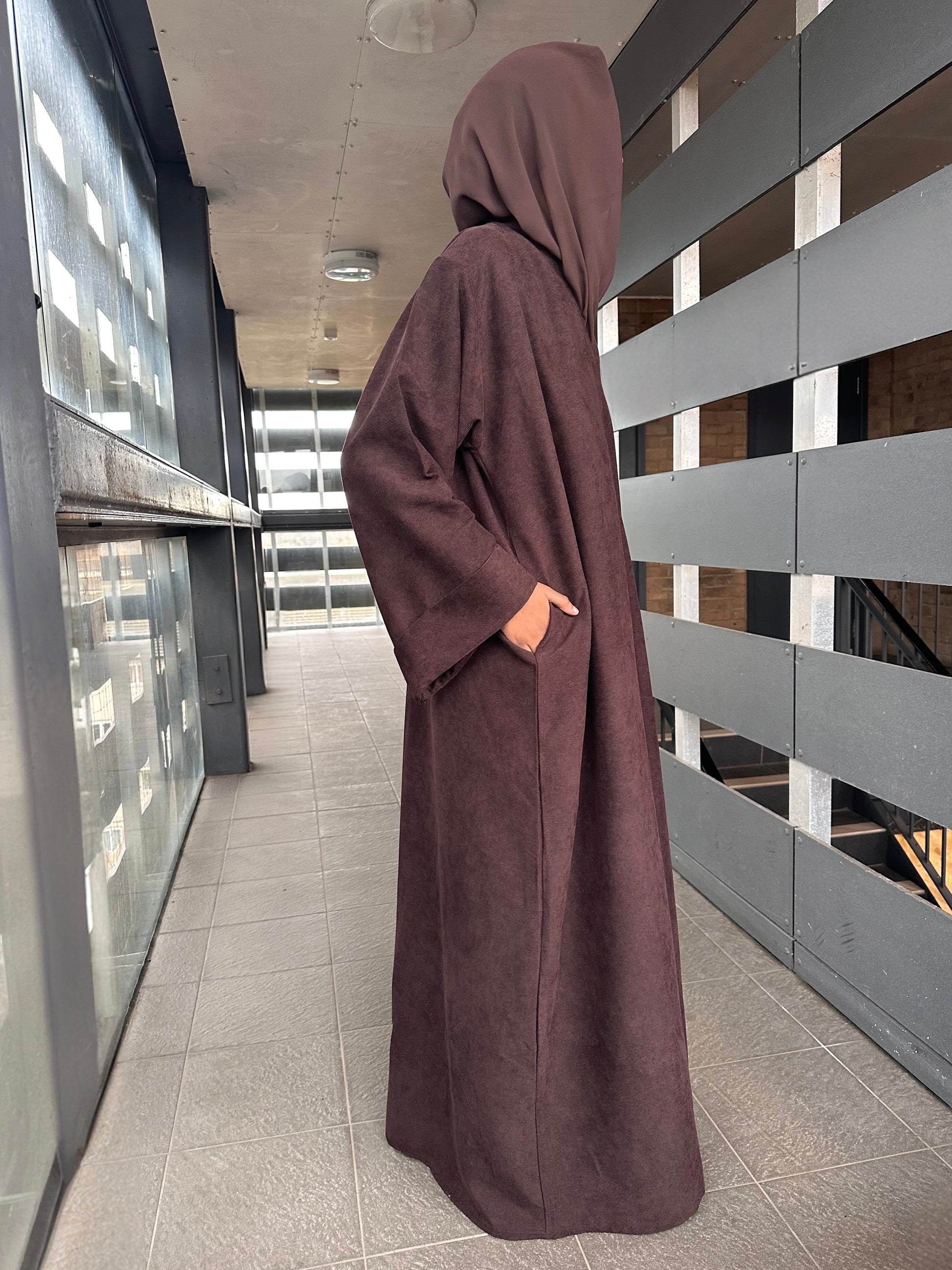 This open corduroy abaya comes in a rich espresso brown and features two convenient side pockets. Crafted for warmth and durability, it offers an effortlessly stylish choice for cooler seasons, bringing sophistication to autumn and winter wardrobes. Designed with wide sleeves and a folded cuff for added elegance, it is complemented by a generously sized matching scarf to complete the refined look.