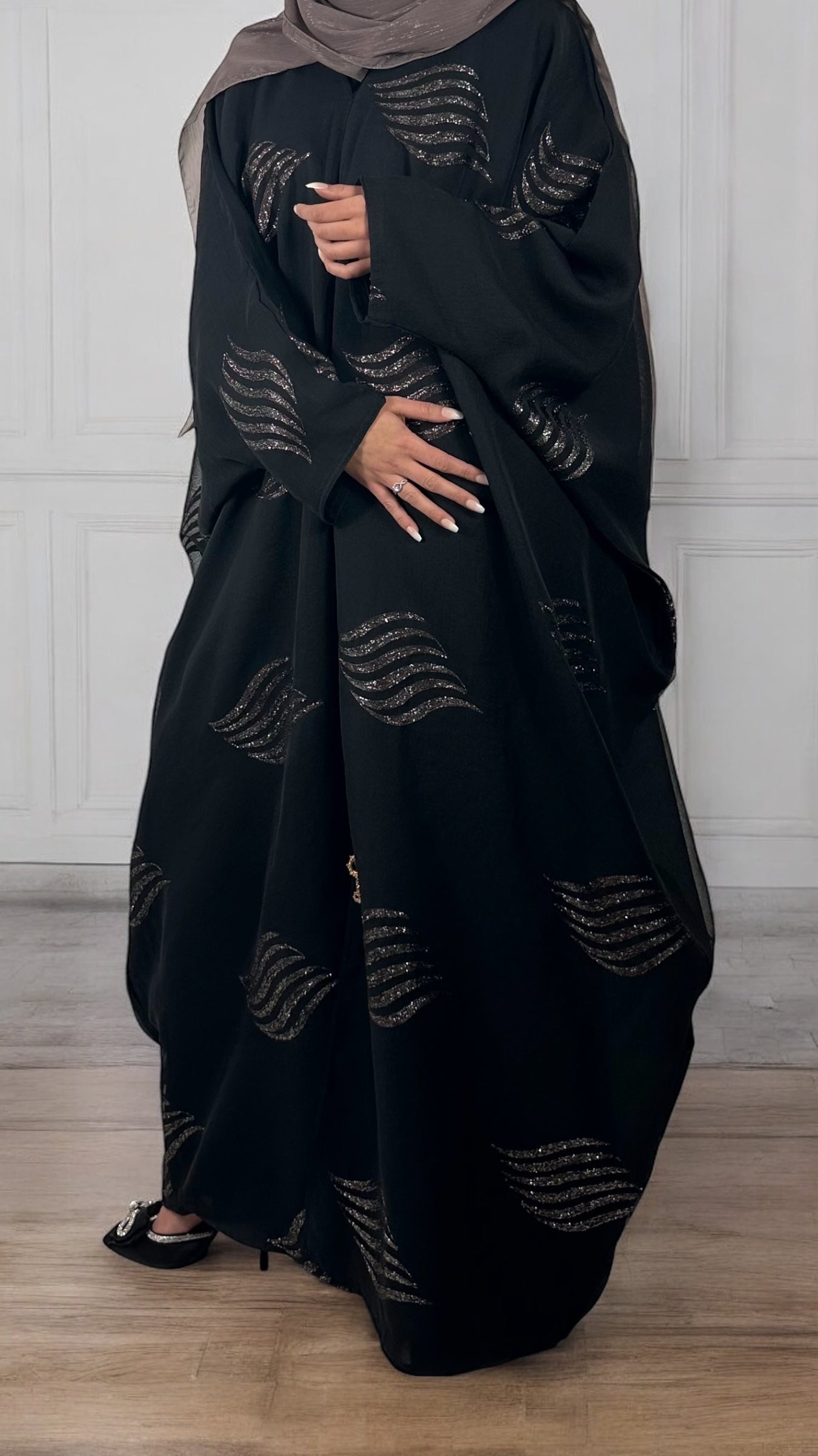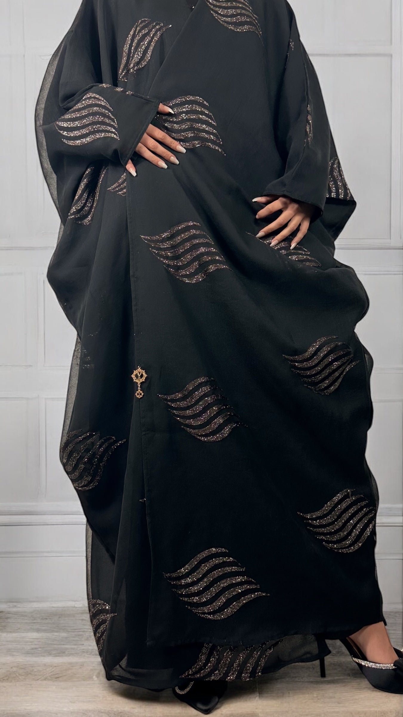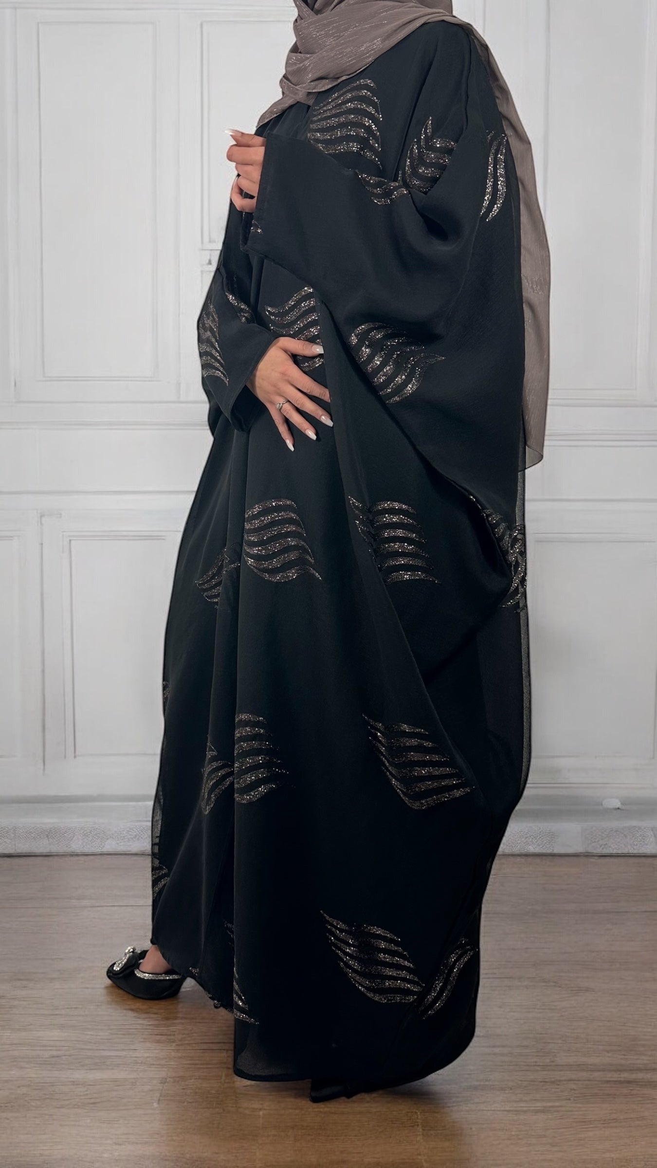 Introducing our exquisite oversized open abaya, meticulously crafted from special linen and adorned with delicate metallic embroidery that subtly glows. Designed for those unforgettable moments where you seek to make a statement, this abaya features a soft luxury chiffon underlining for added comfort and flowing elegance, making it perfect for evening wear. Complete your ensemble with the included large soft shimmer scarf for the ultimate finishing touch. Versatile in size and style, this abaya is tailored to complement every special woman, ensuring it becomes a cherished addition to your wardrobe.
