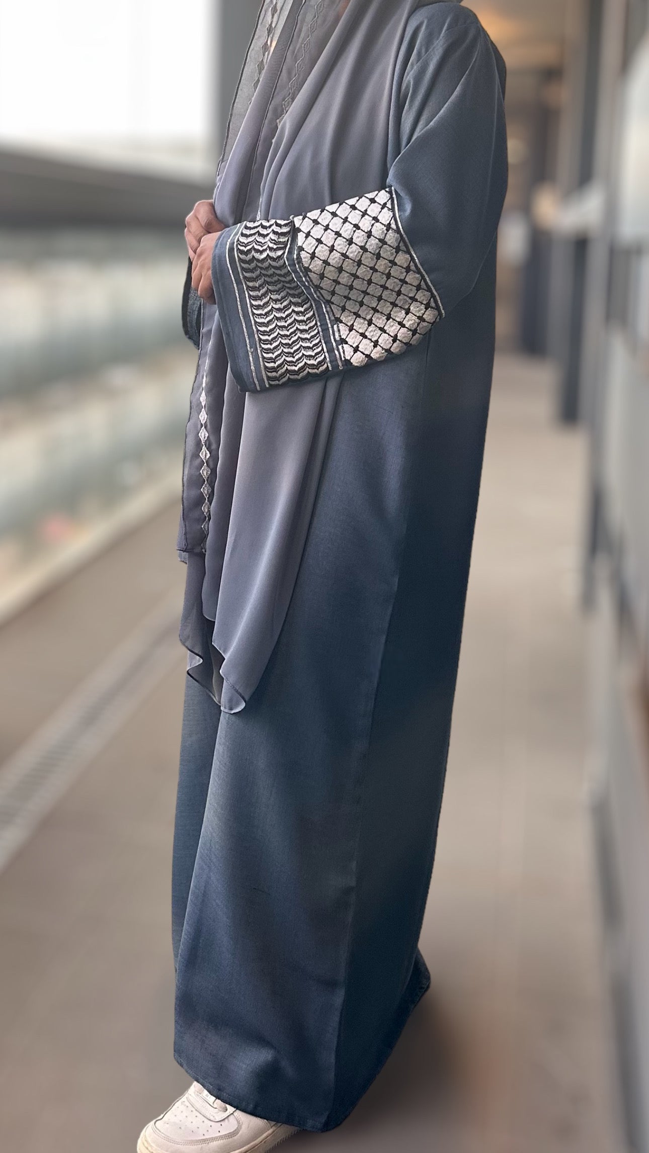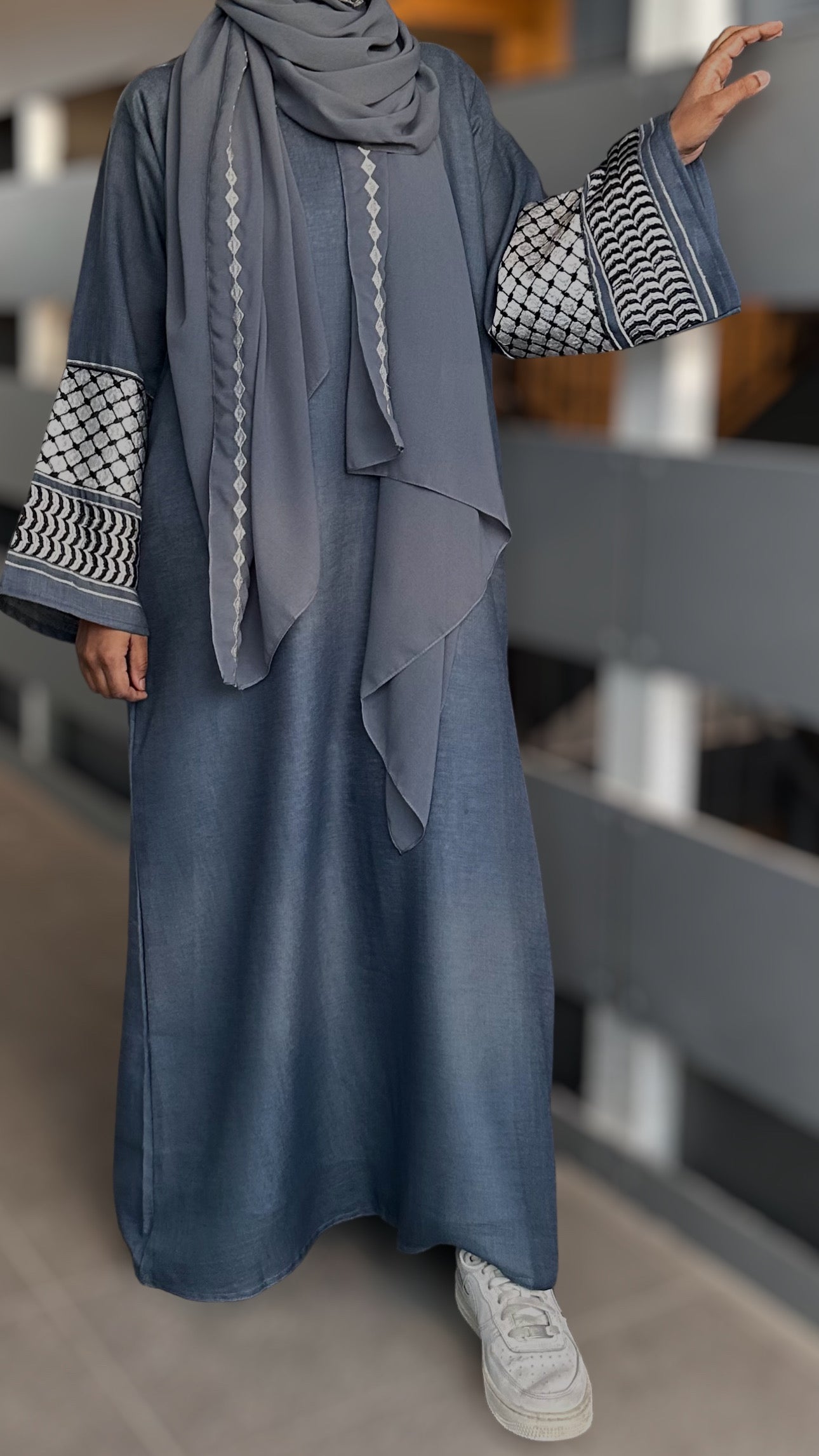 Falasteen abaya is crafted from organic linen, this intricately embroidered abaya is a closed design. Comes with a generously sized, delicately embroidered scarf, this abaya is a must have for every girl.