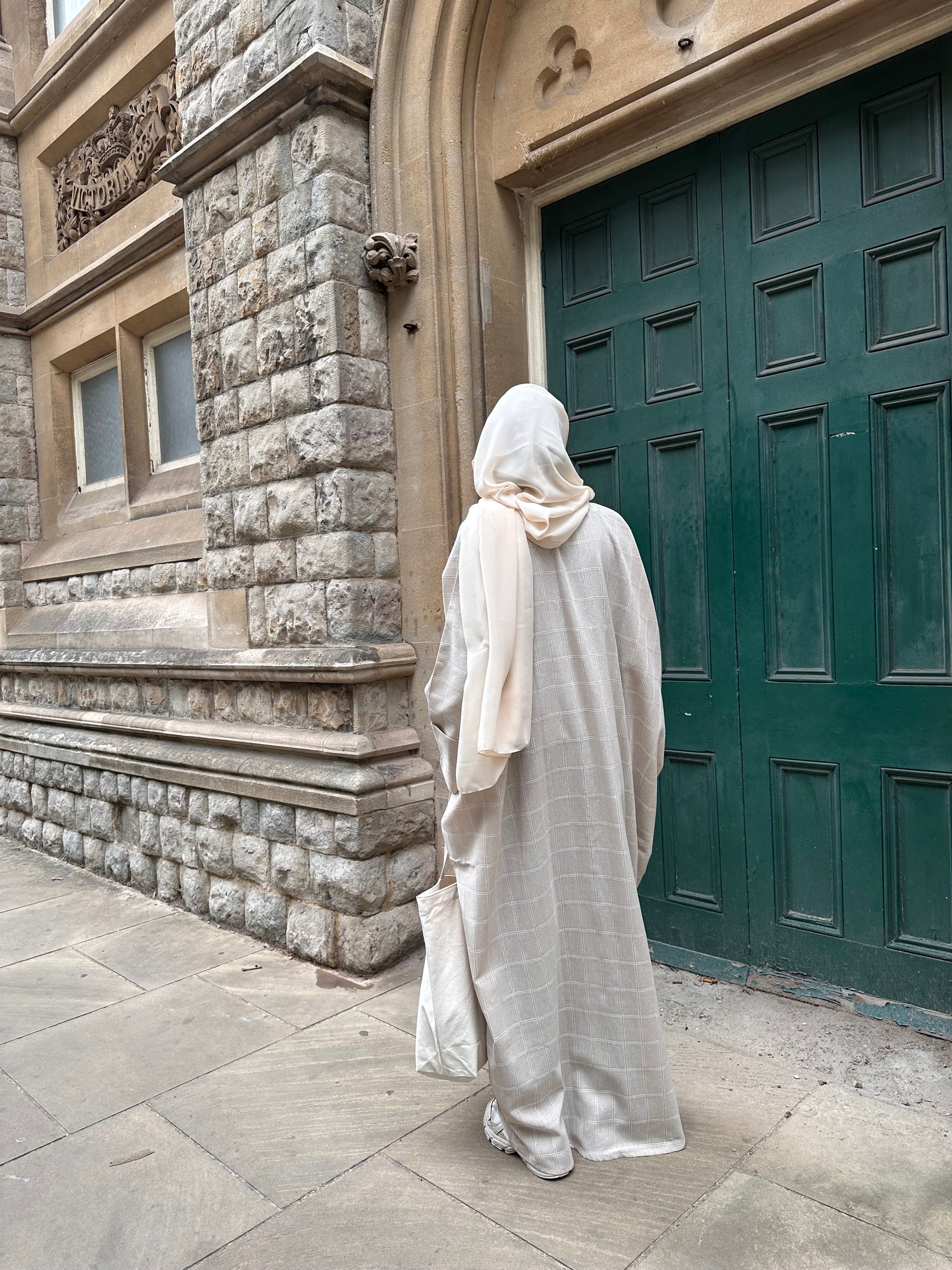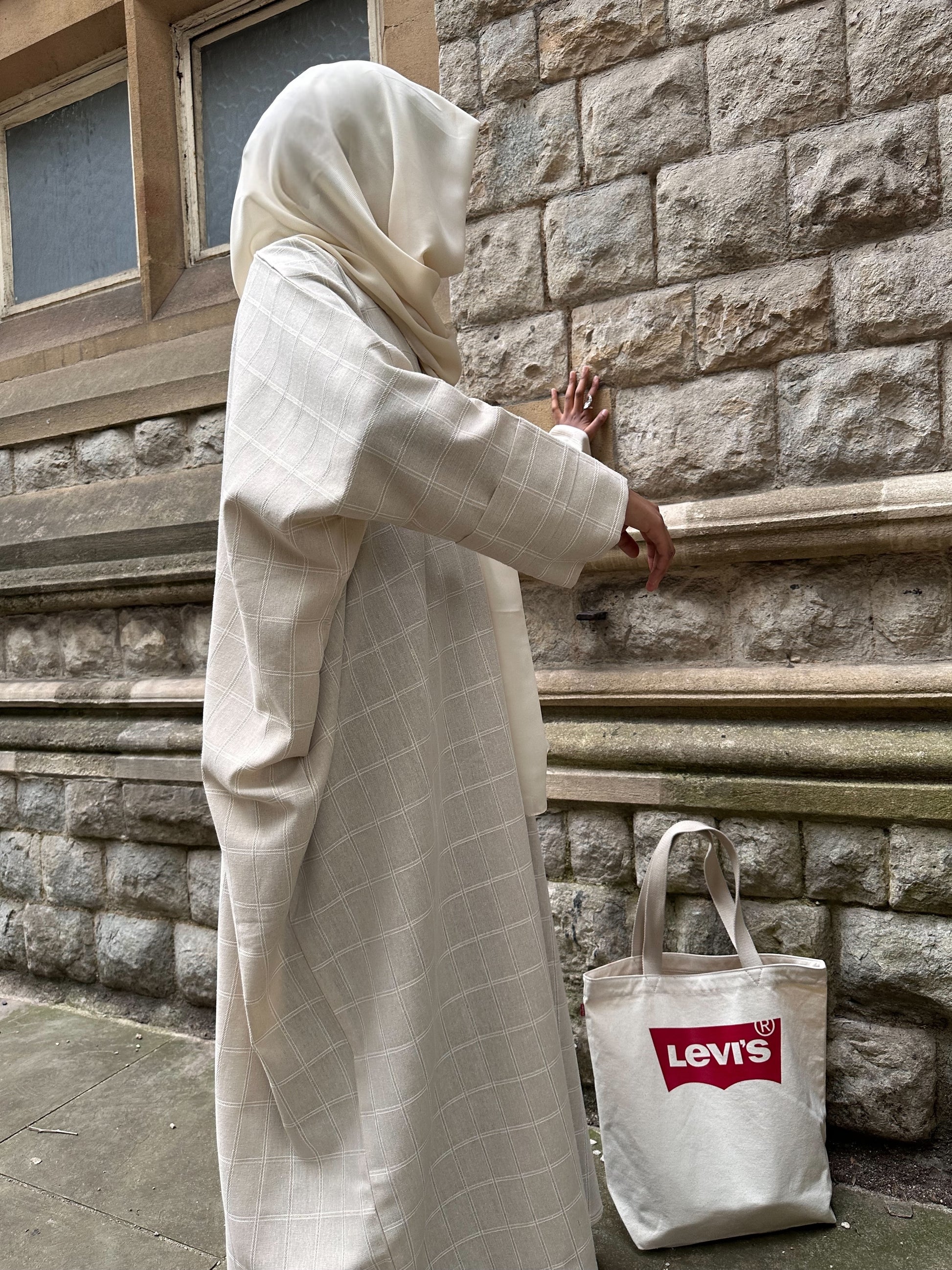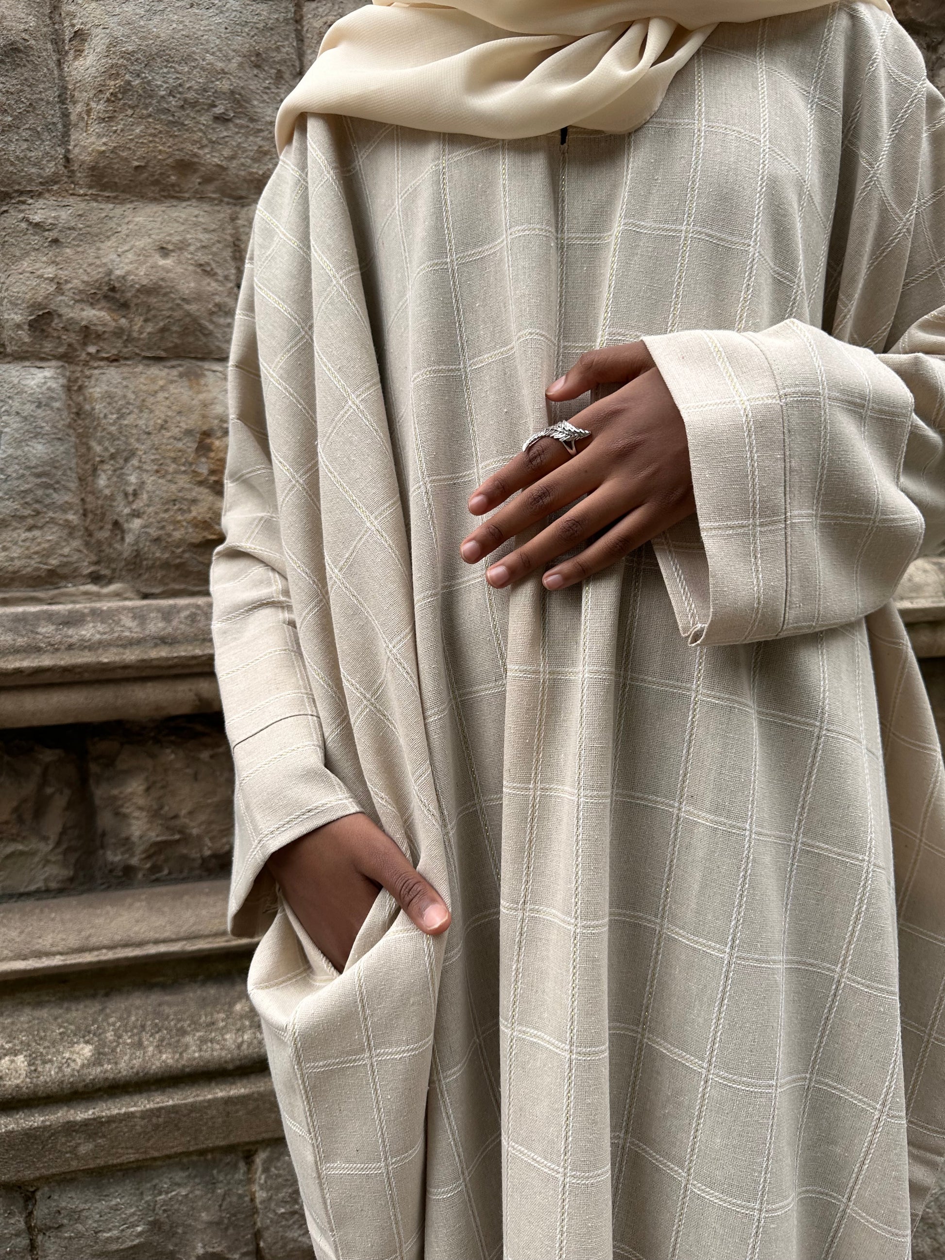 This closed abaya is crafted from natural beige linen, featuring a subtle gold thread windowpane pattern that adds a refined touch of luxury. Designed with classic folded sleeves and practical deep side pockets, it combines timeless elegance with everyday functionality. Complete the look with the soft, flowing maxi scarf for a comfortable and sophisticated outfit perfect for both daily wear and occasions.