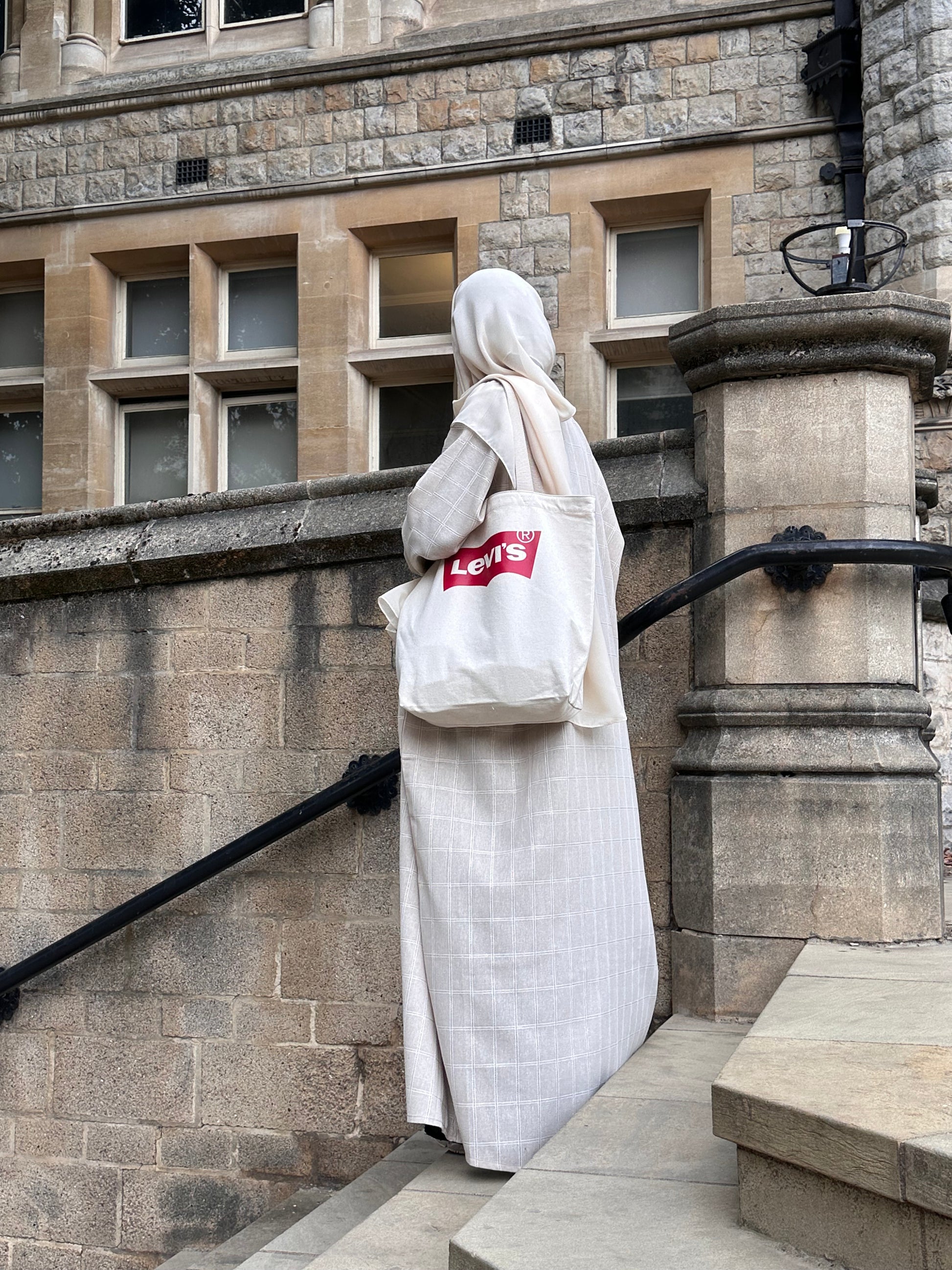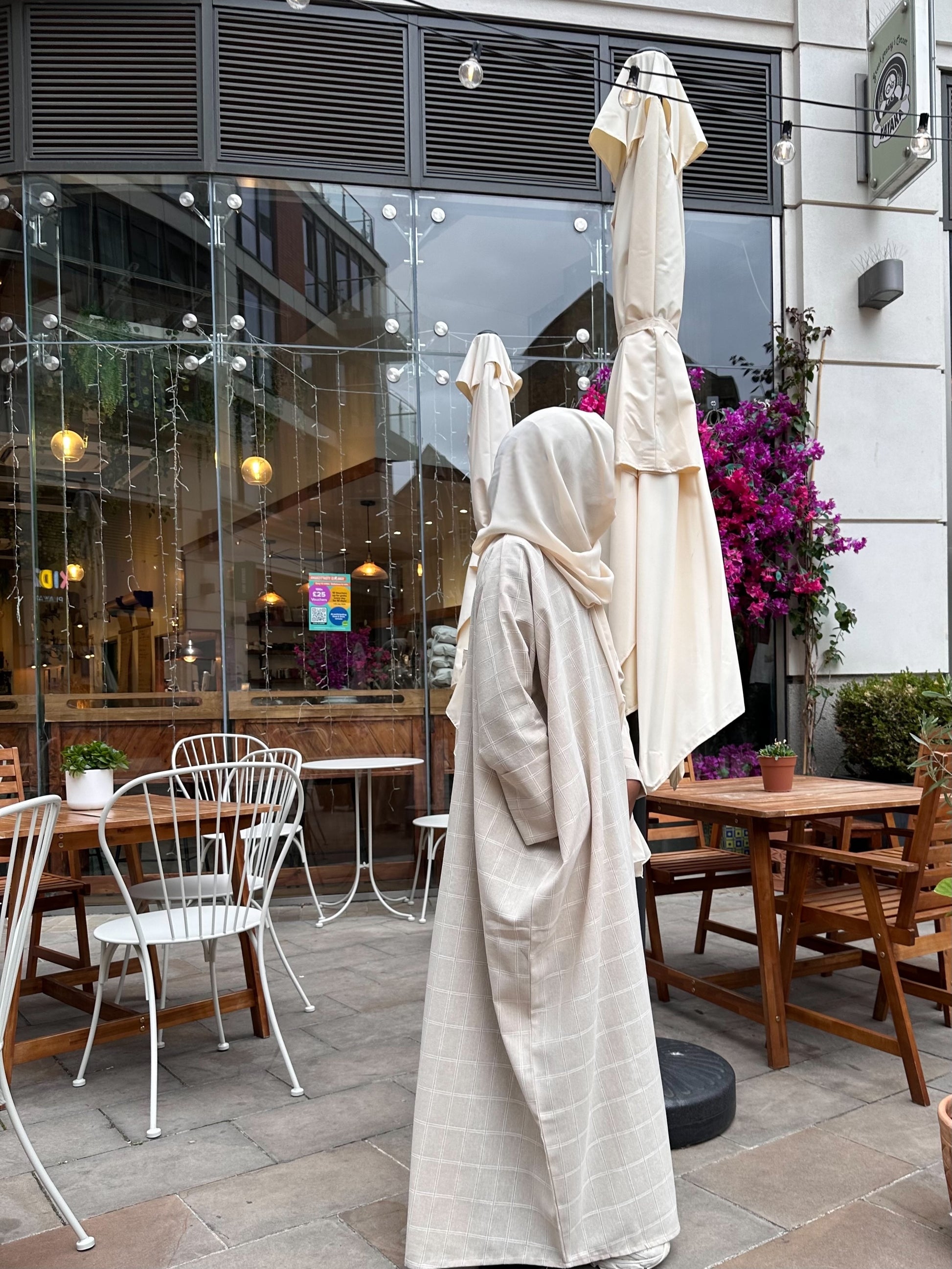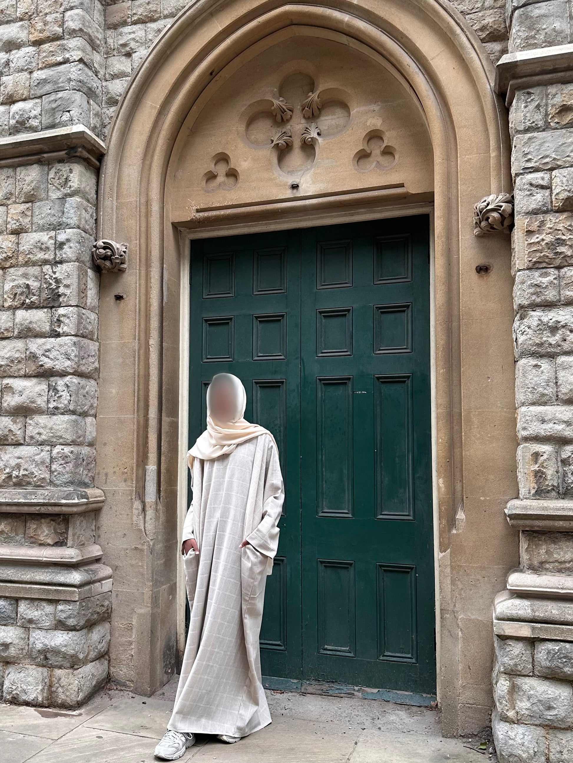 This closed abaya is crafted from natural beige linen, featuring a subtle gold thread windowpane pattern that adds a refined touch of luxury. Designed with classic folded sleeves and practical deep side pockets, it combines timeless elegance with everyday functionality. Complete the look with the soft, flowing maxi scarf for a comfortable and sophisticated outfit perfect for both daily wear and occasions.