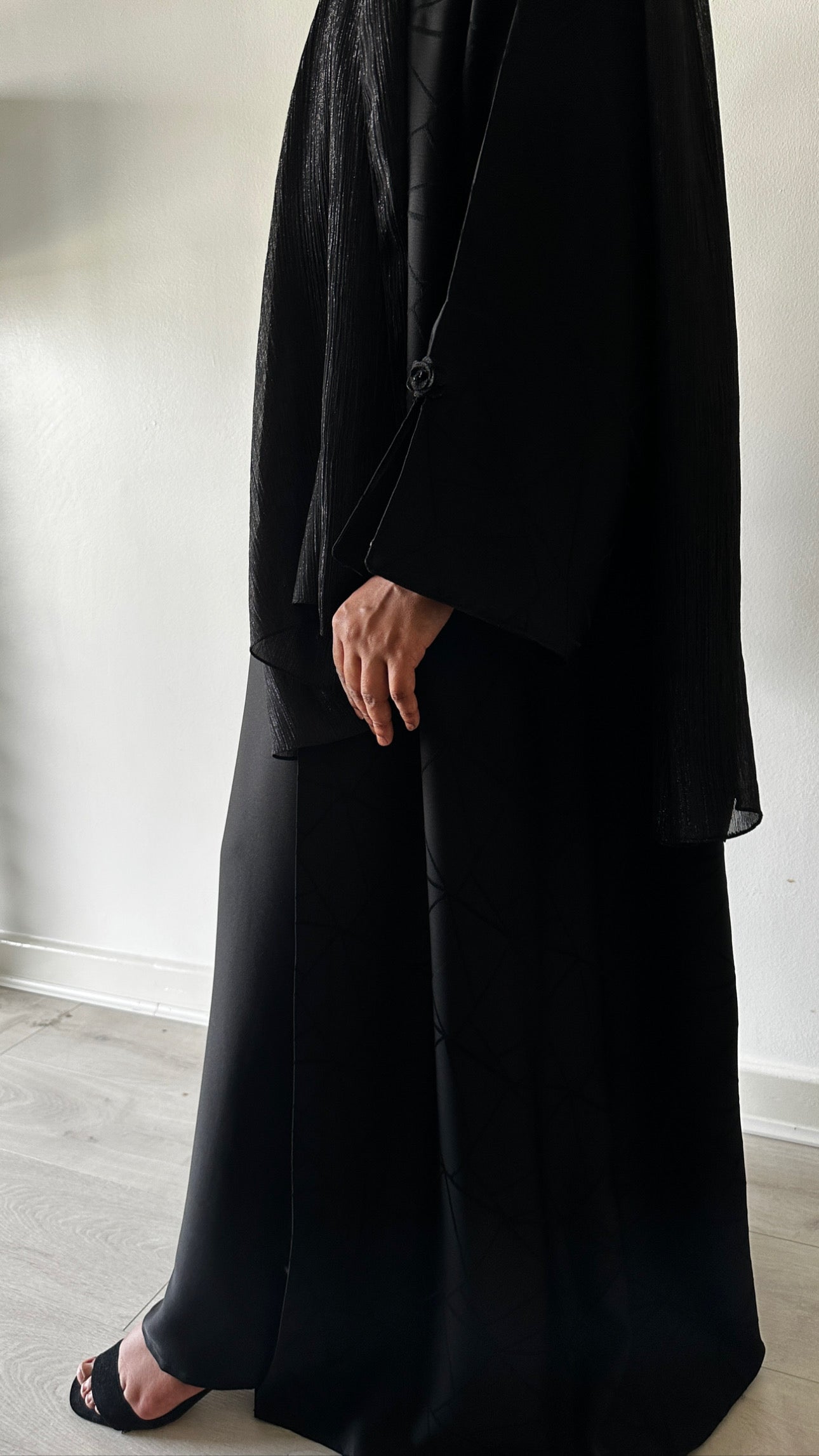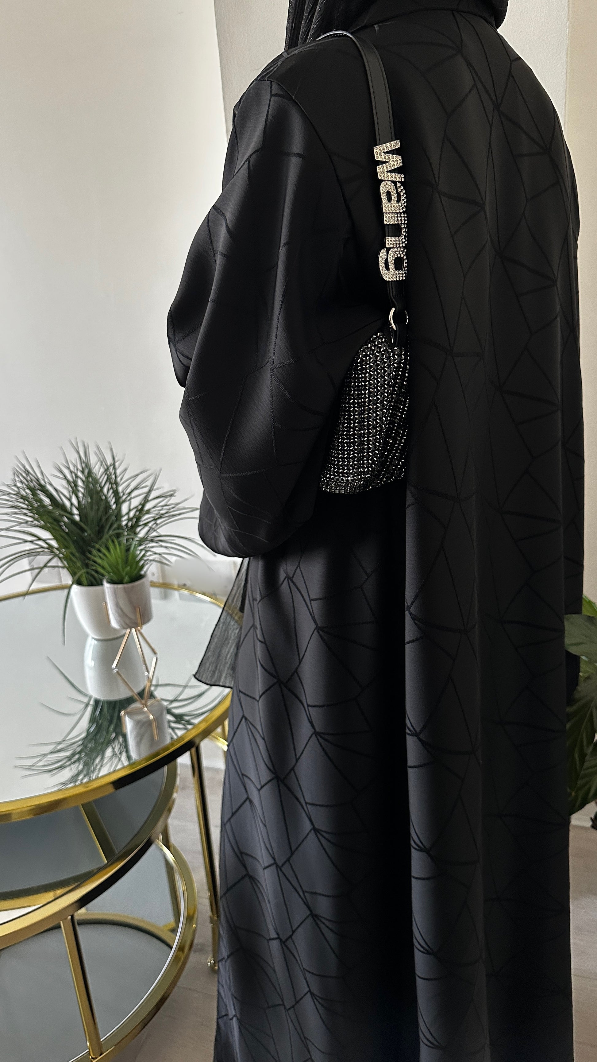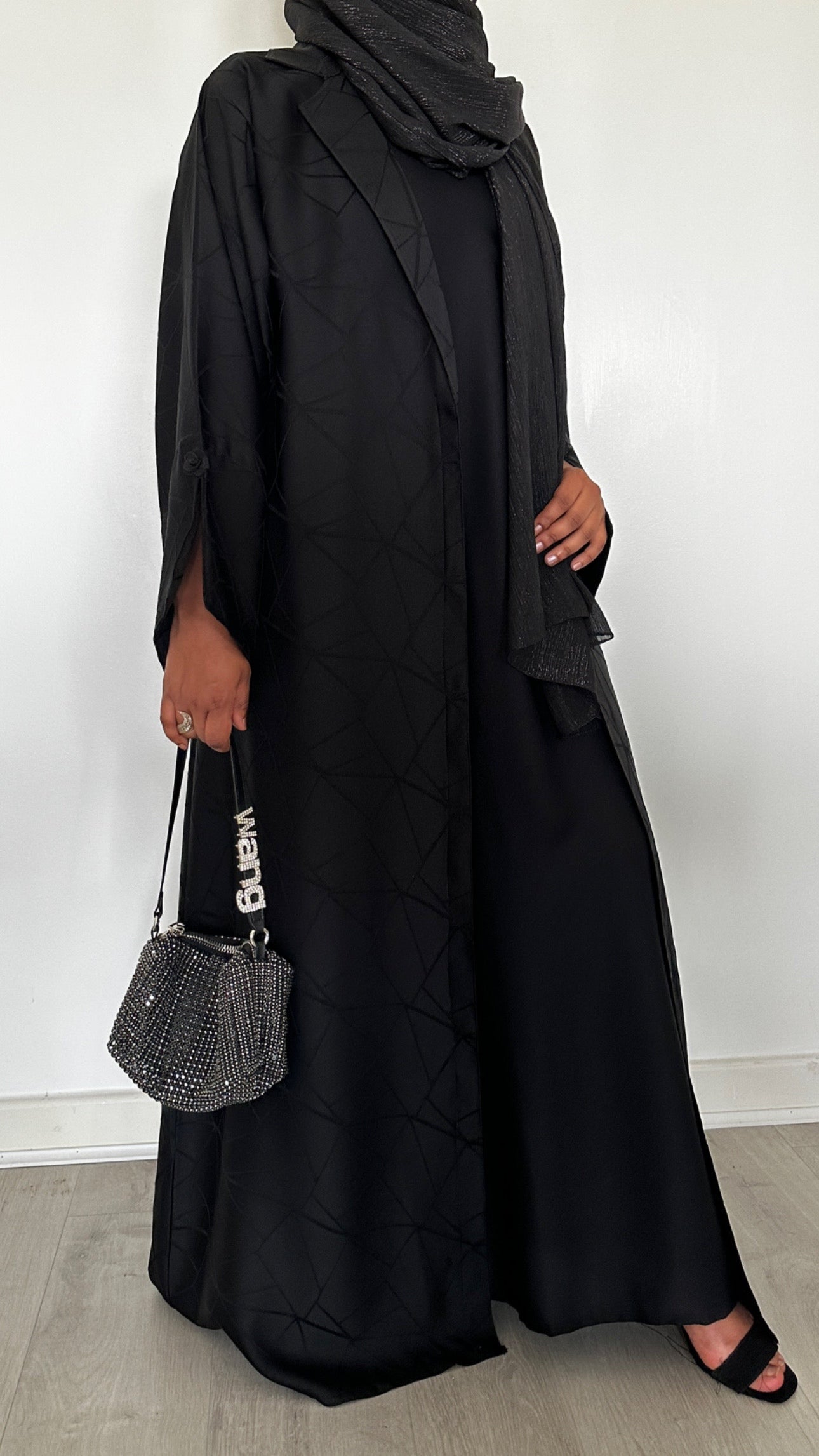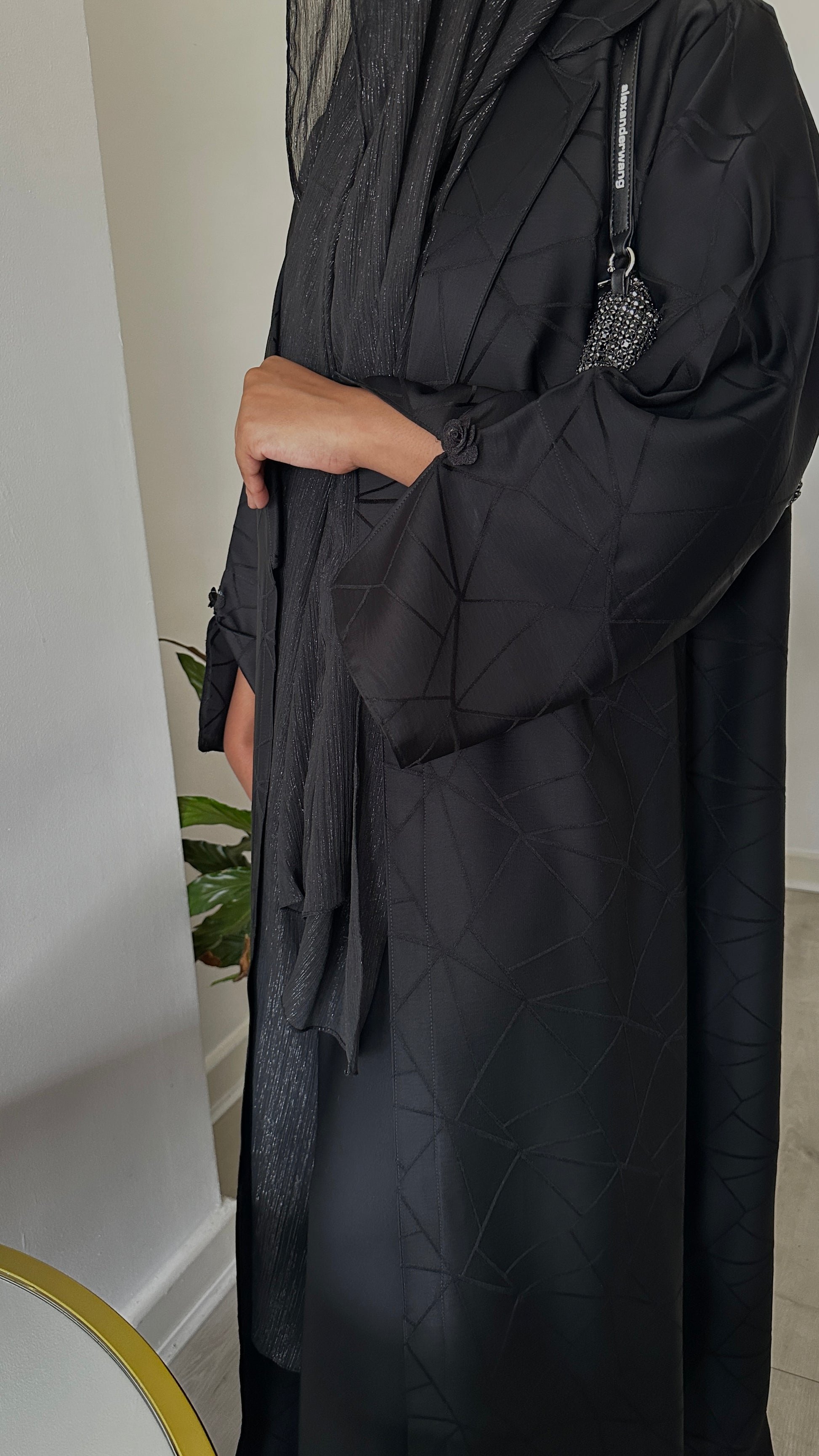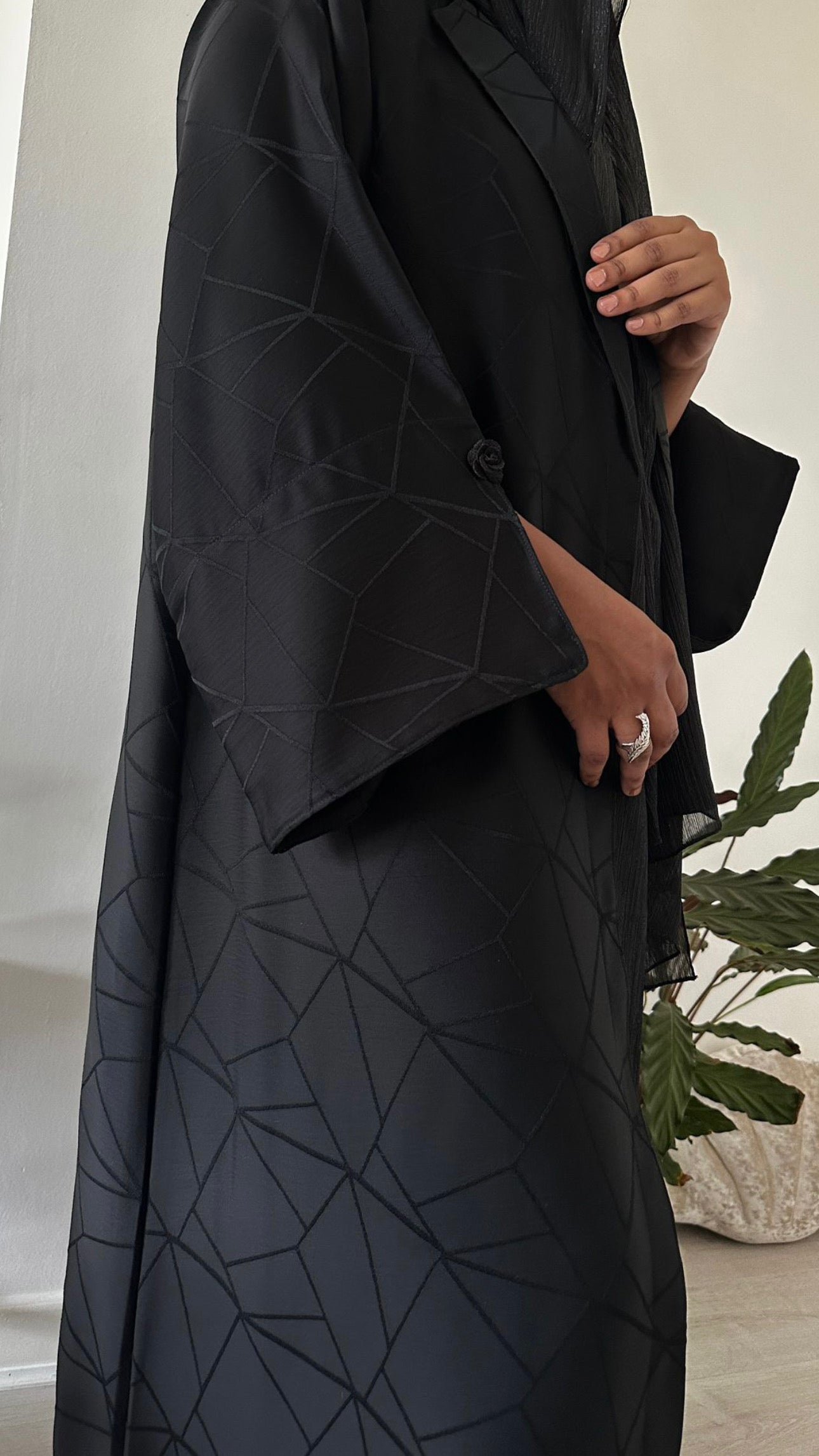 Houfiya is a timeless jacquard abaya with collar and the sleeves are open with a miniature flower detail.