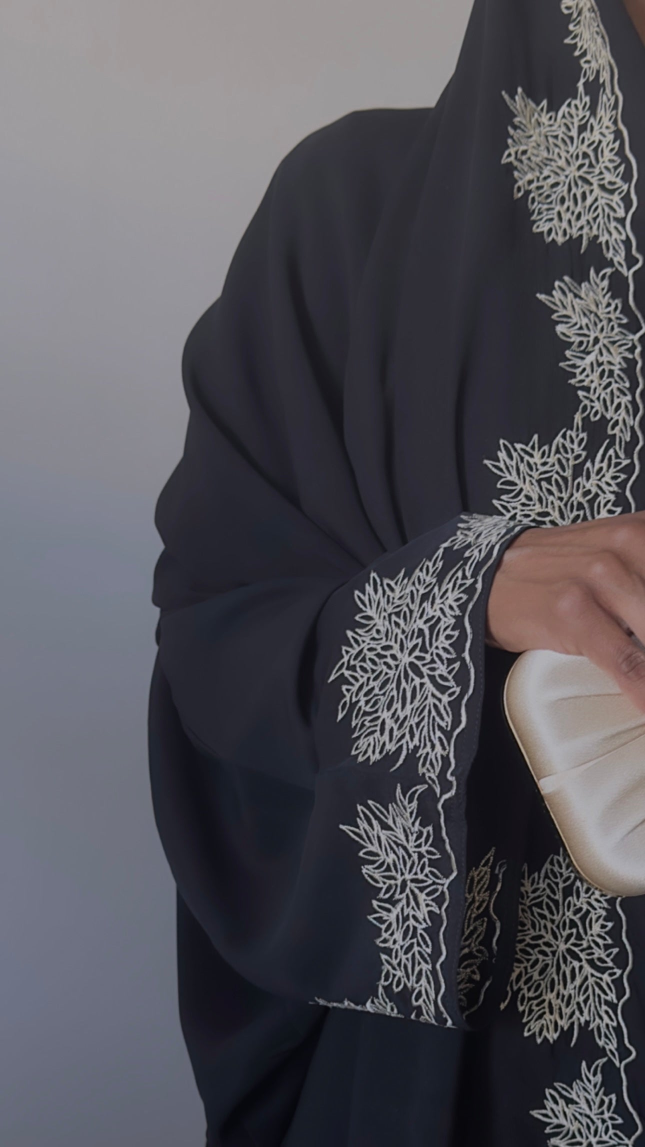 Jamila is a stunning ivory embroidered abaya with a matching embroidered large scarf. Jamila abaya is very soft and lightweight made from premium nada material.