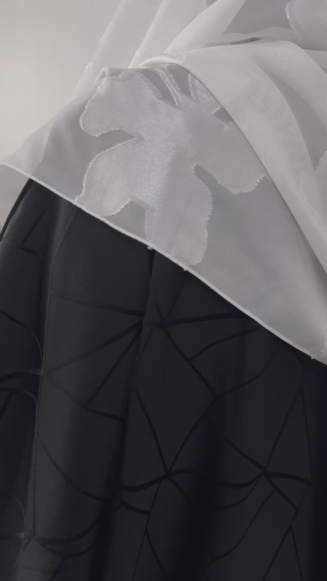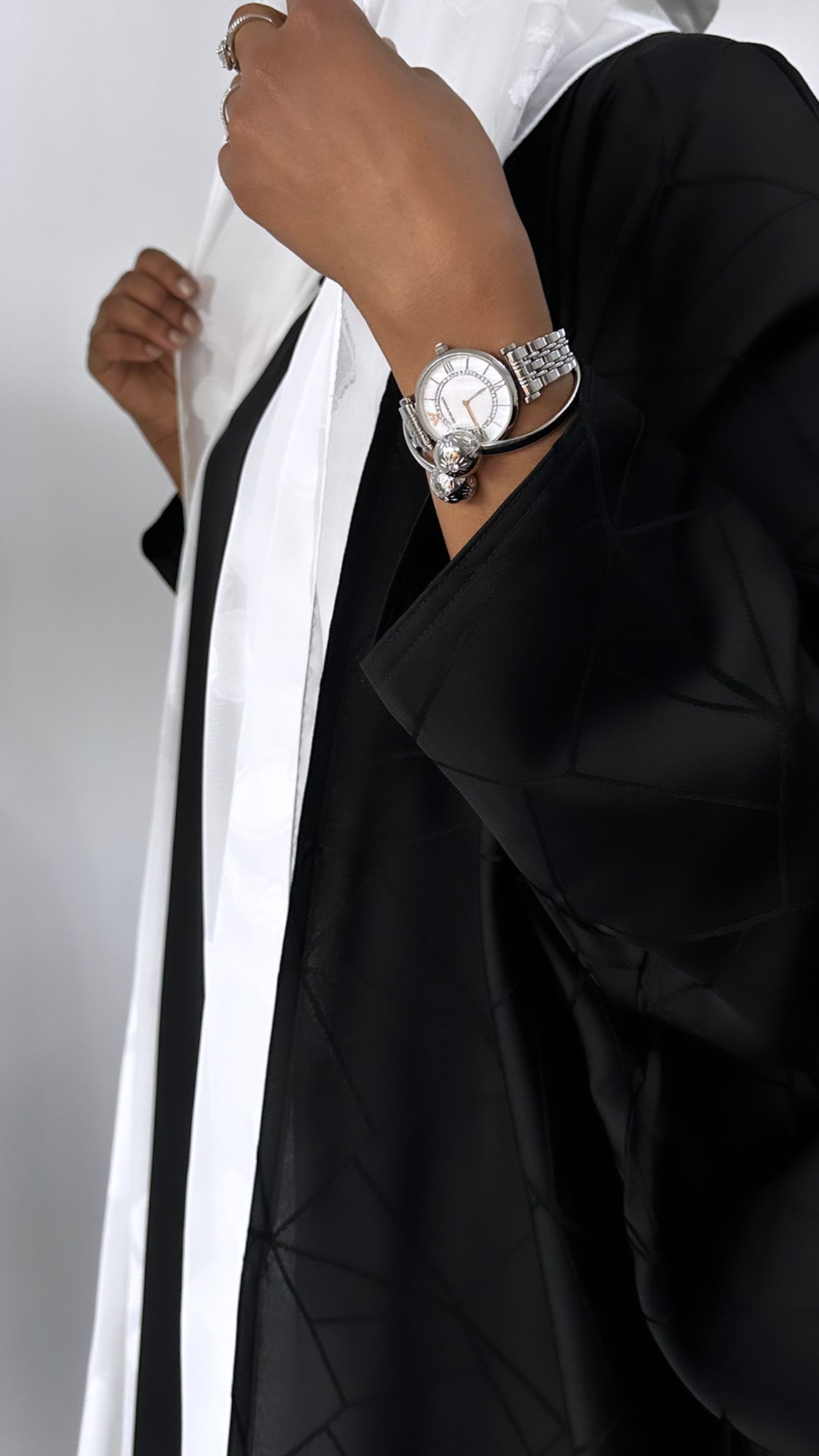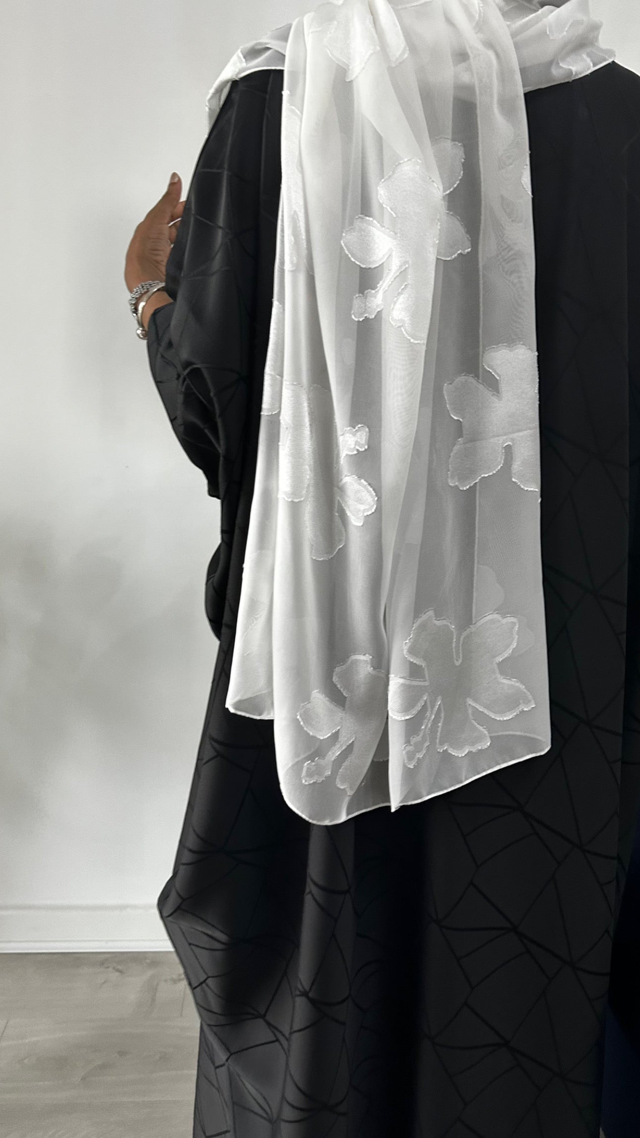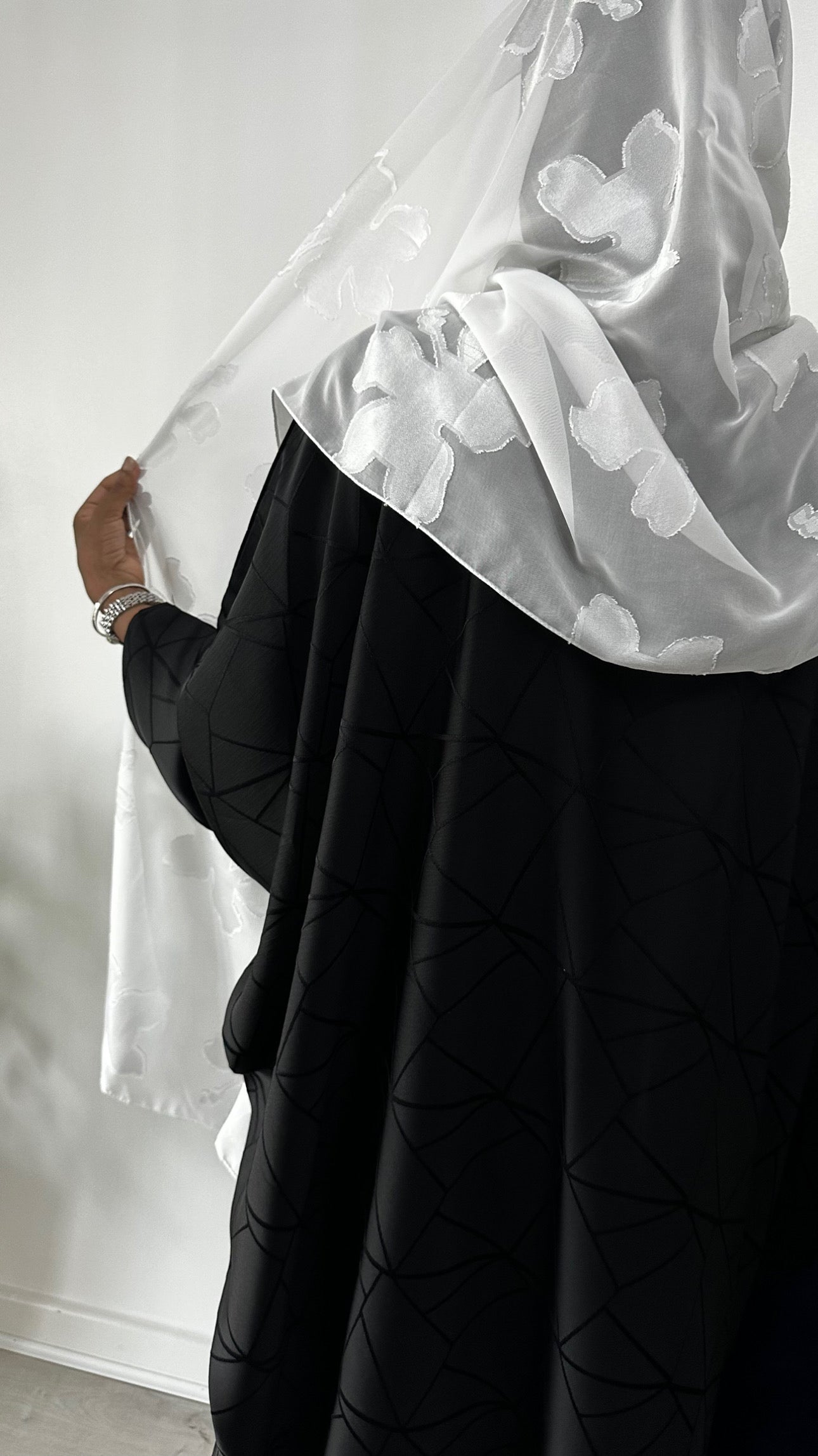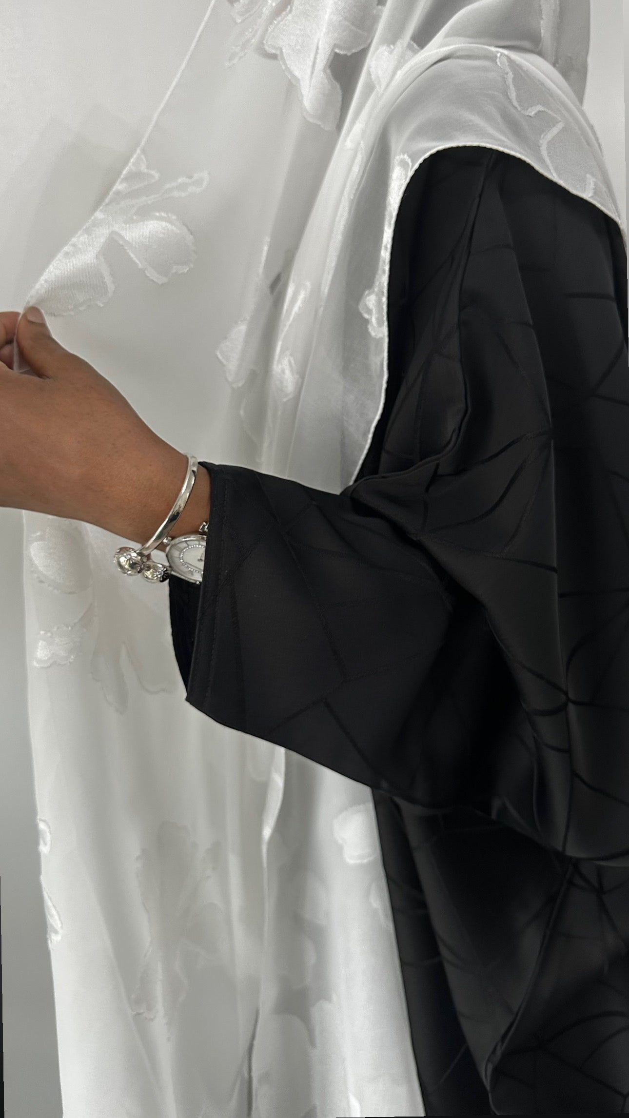 A matte black batwing abaya with intricate designs tailored for you, it comes with a featherlight scarf in a faint leaf pattern, this abaya is made of a premium jacquard material.