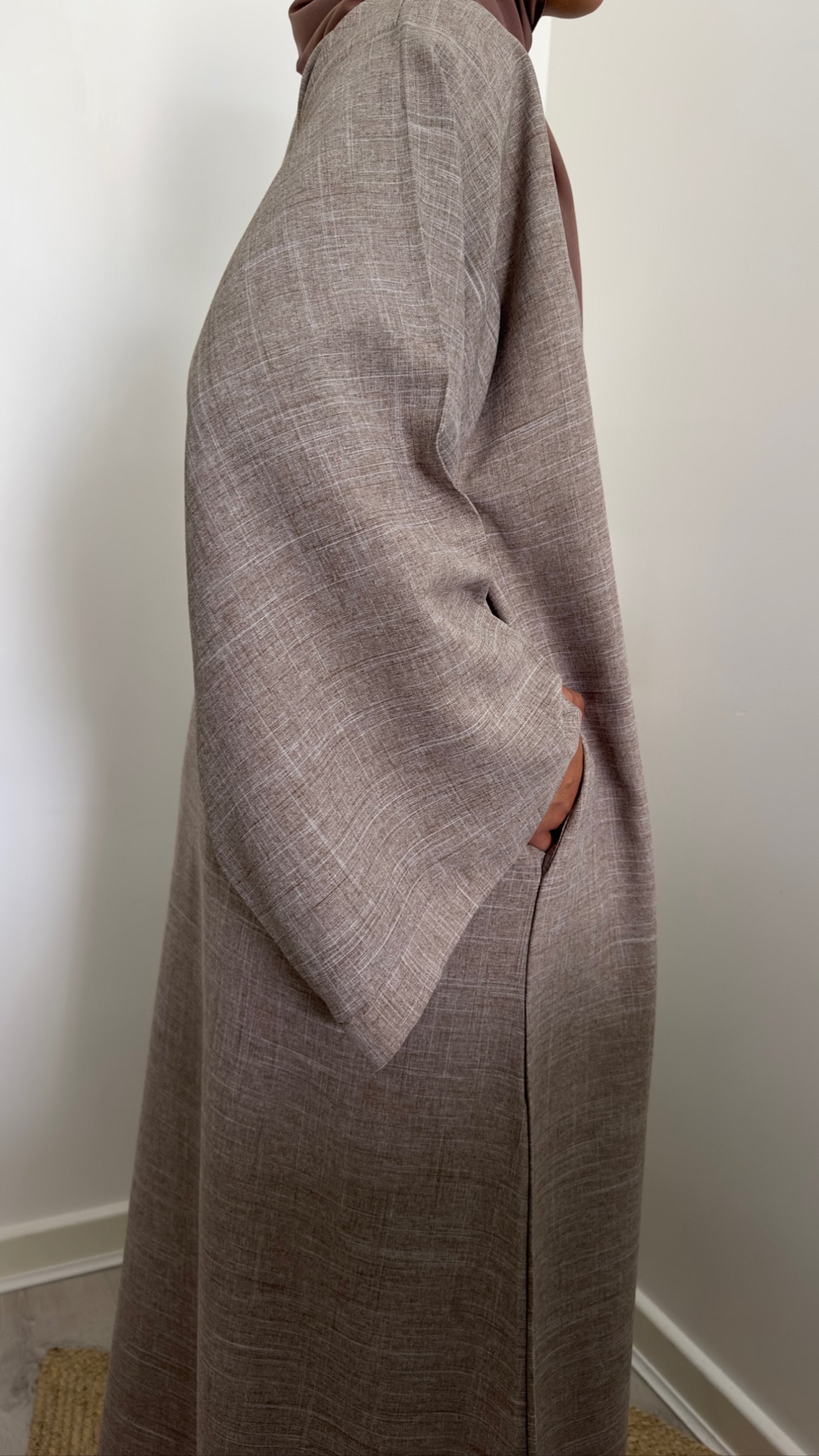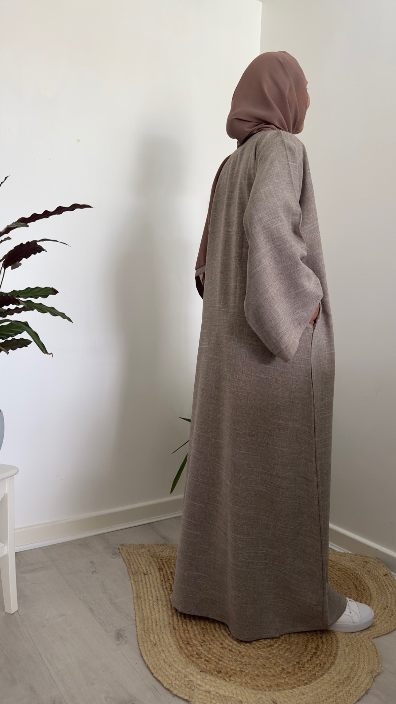 Maira is an open linen blend abaya that can be closed up with buttons. The abaya comes with a complementary scarf that pairs with the abayas that’s a deep mauve shade with brownish undertones. The Maira abaya can be worn in all seasons. Abaya comes in loose fitting.