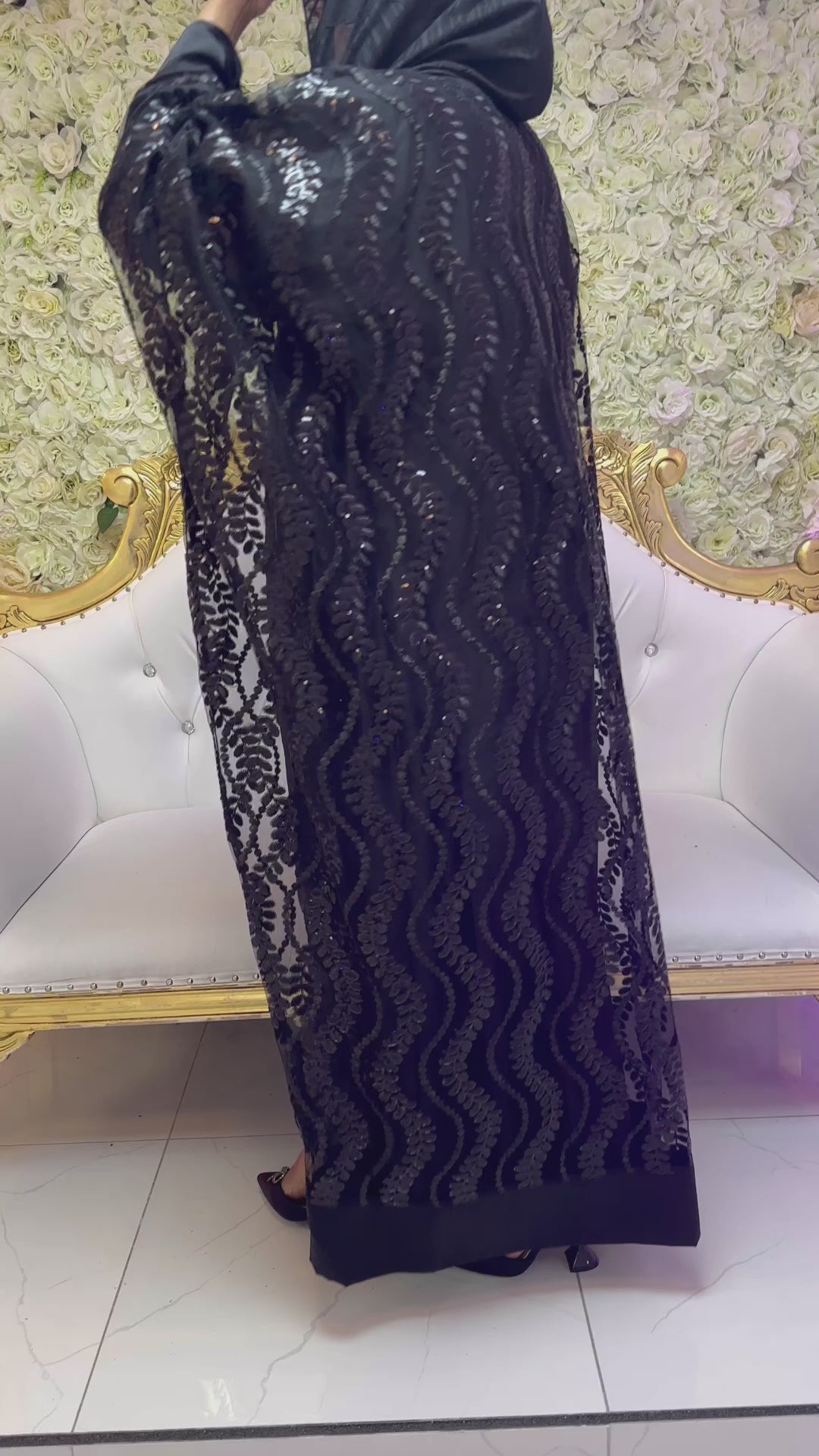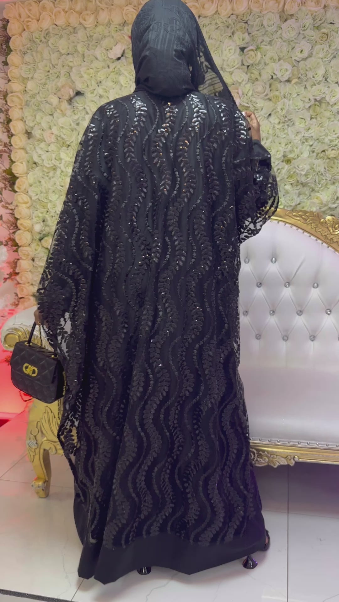 Discover timeless elegance with this exquisite, oversized sheer black abaya, embellished with delicate embroidery and sparkling sequins. This piece includes a full sleeved dress made from luxurious Italian silk, highlighted by intricate details on the cuffs, hem, and front of the abaya. Complemented by a refined and stylish scarf, this abaya is perfect for any special occasion, ensuring you make a lasting impression wherever you go.