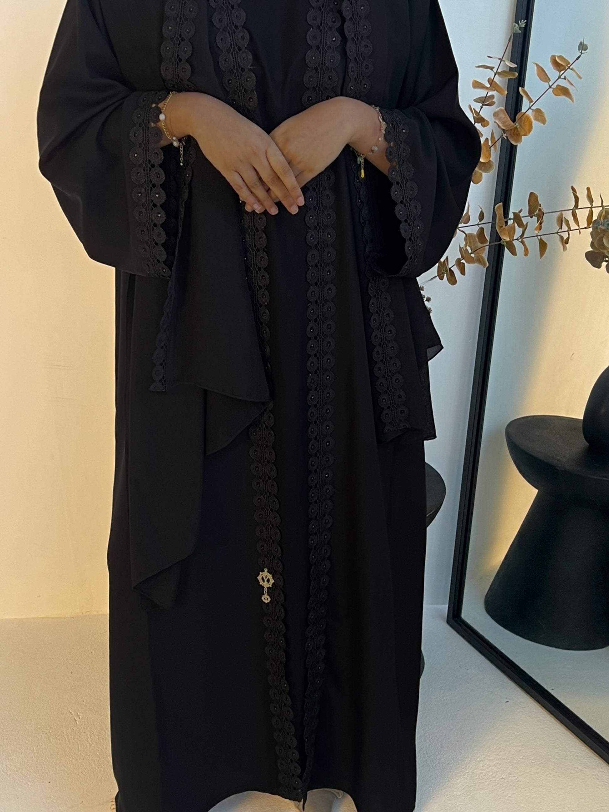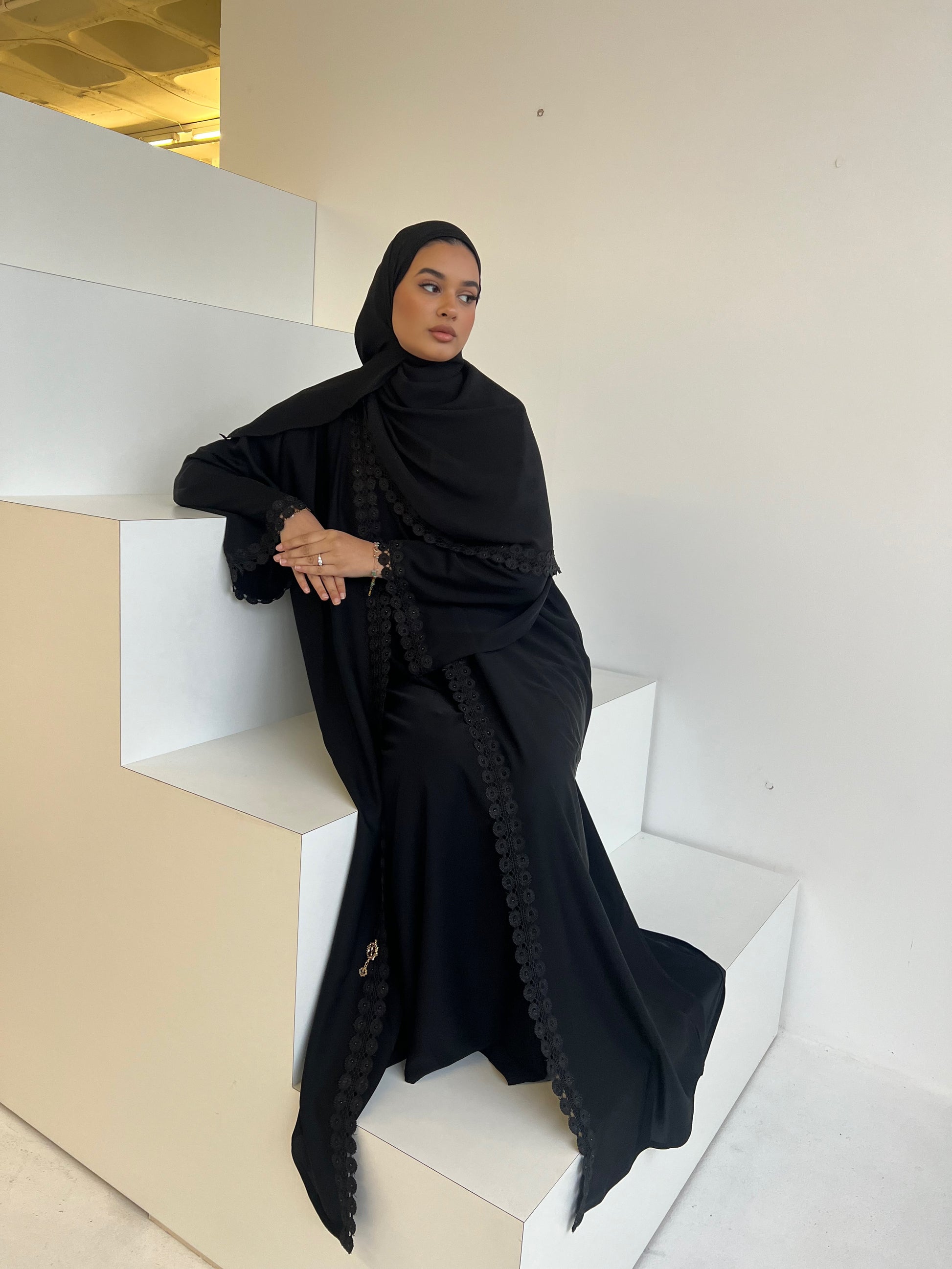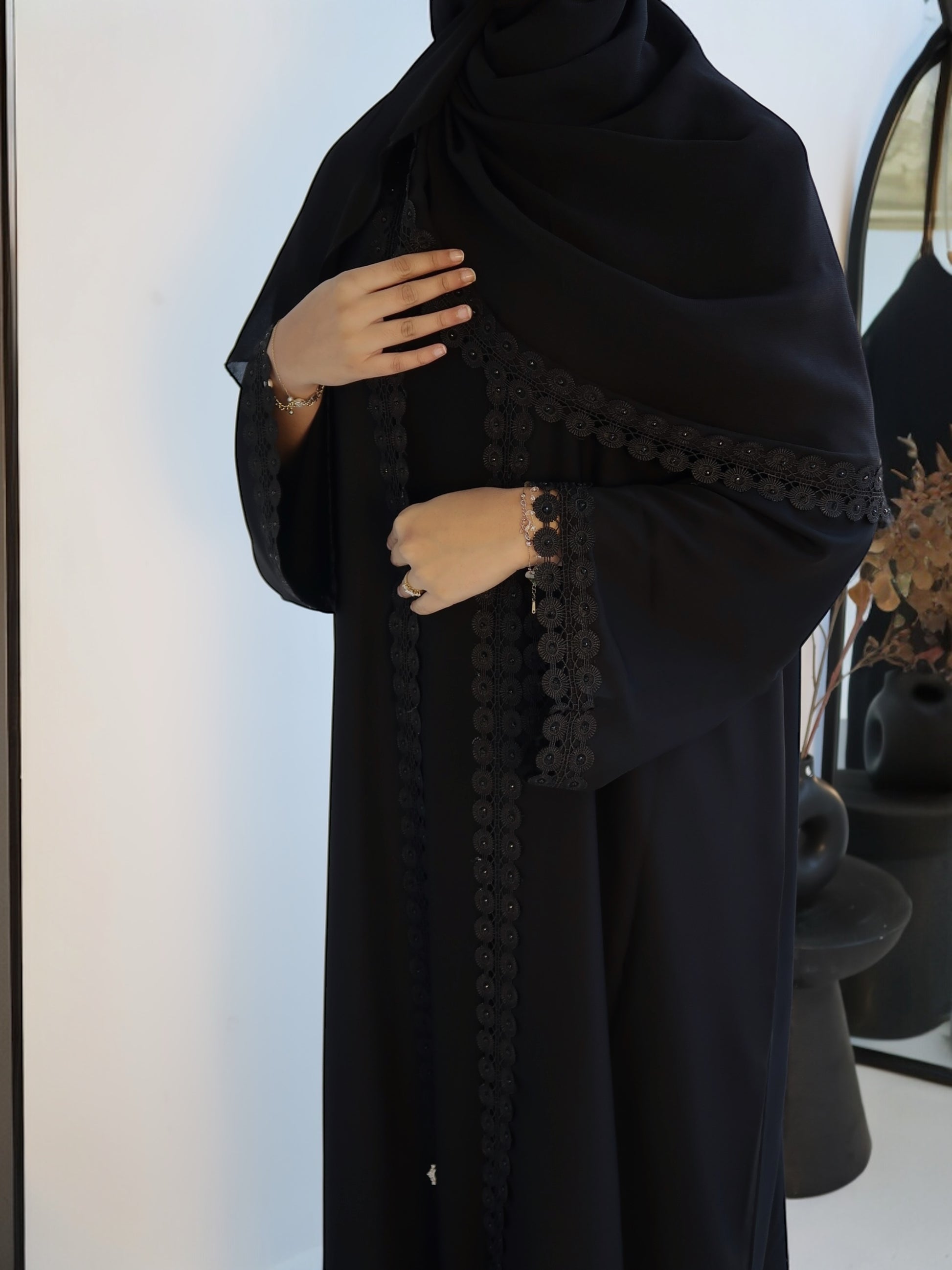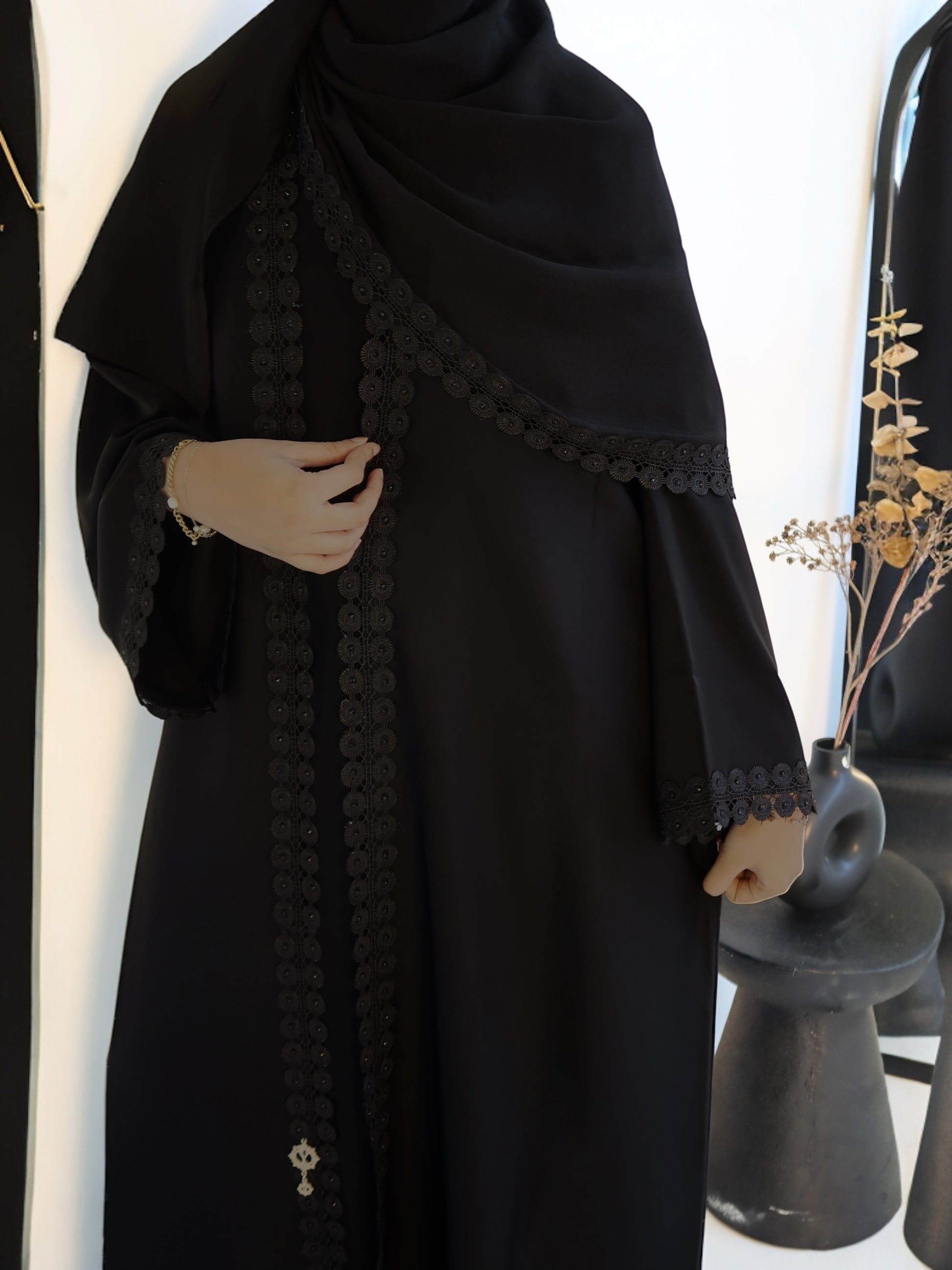 Elegant and timeless, this black abaya set is crafted from premium nada fabric for a luxurious feel. The abaya and matching scarf are beautifully adorned with crystal rhinestone embellished lace, adding a refined touch of sparkle. A perfect blend of classic sophistication and modern elegance, this set requires no additional accessories to complete the look, making it ideal for any occasion.