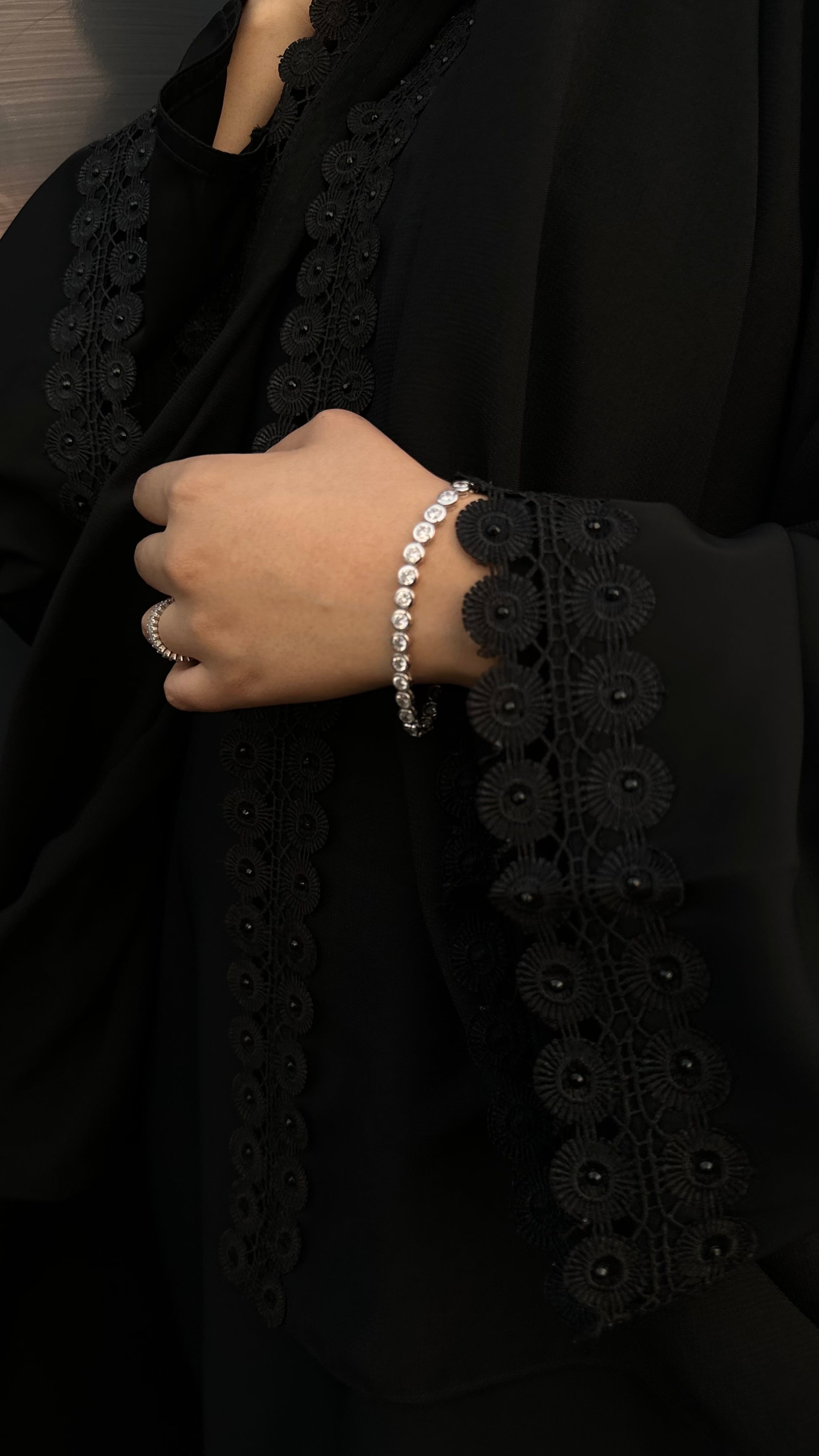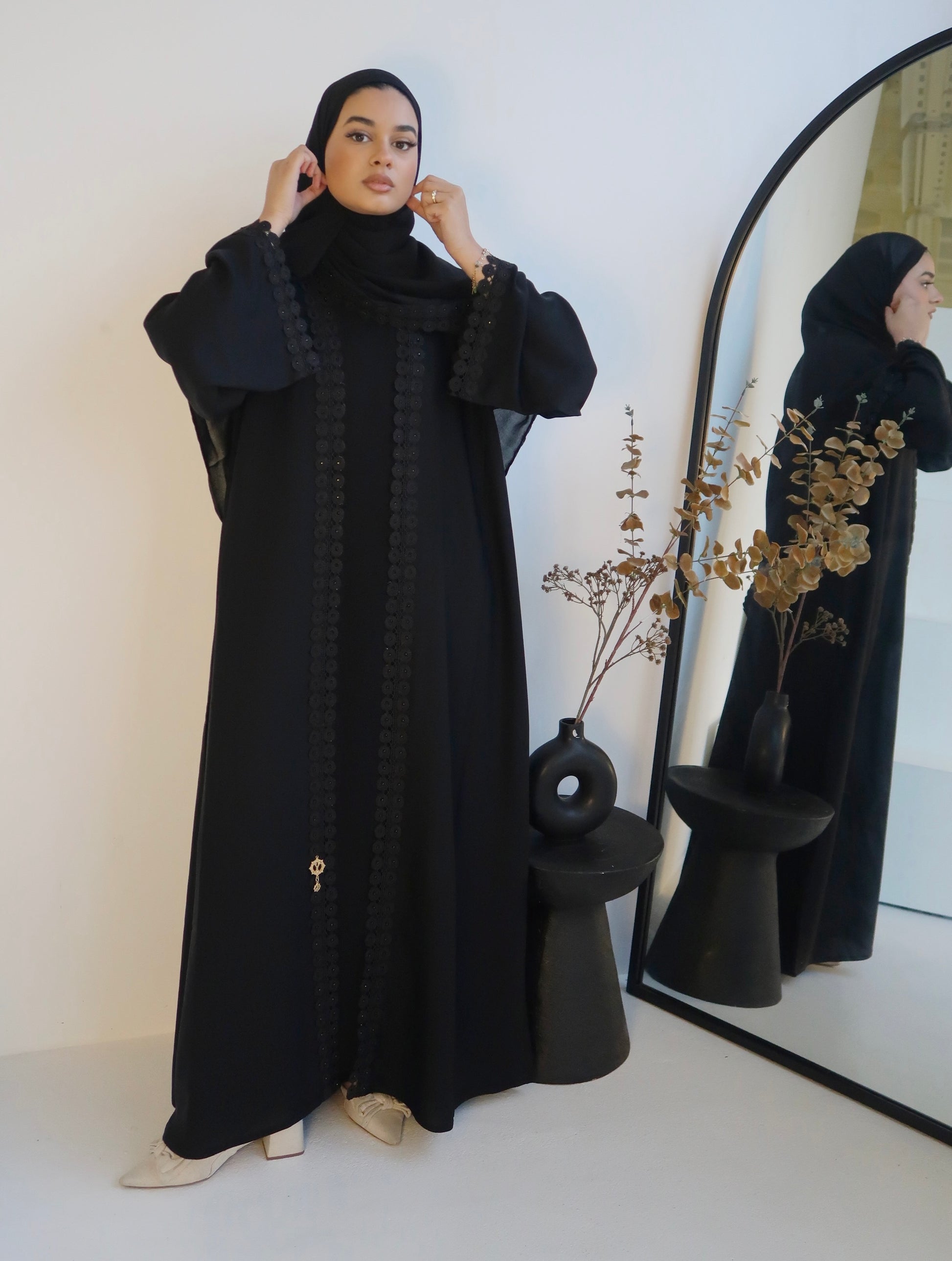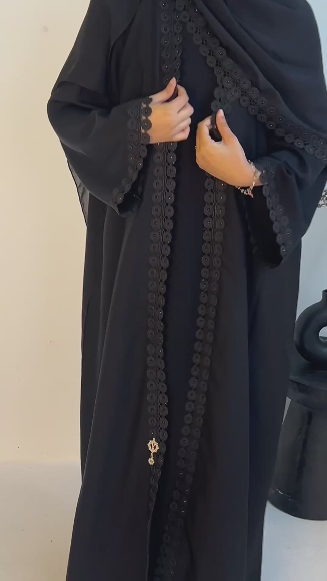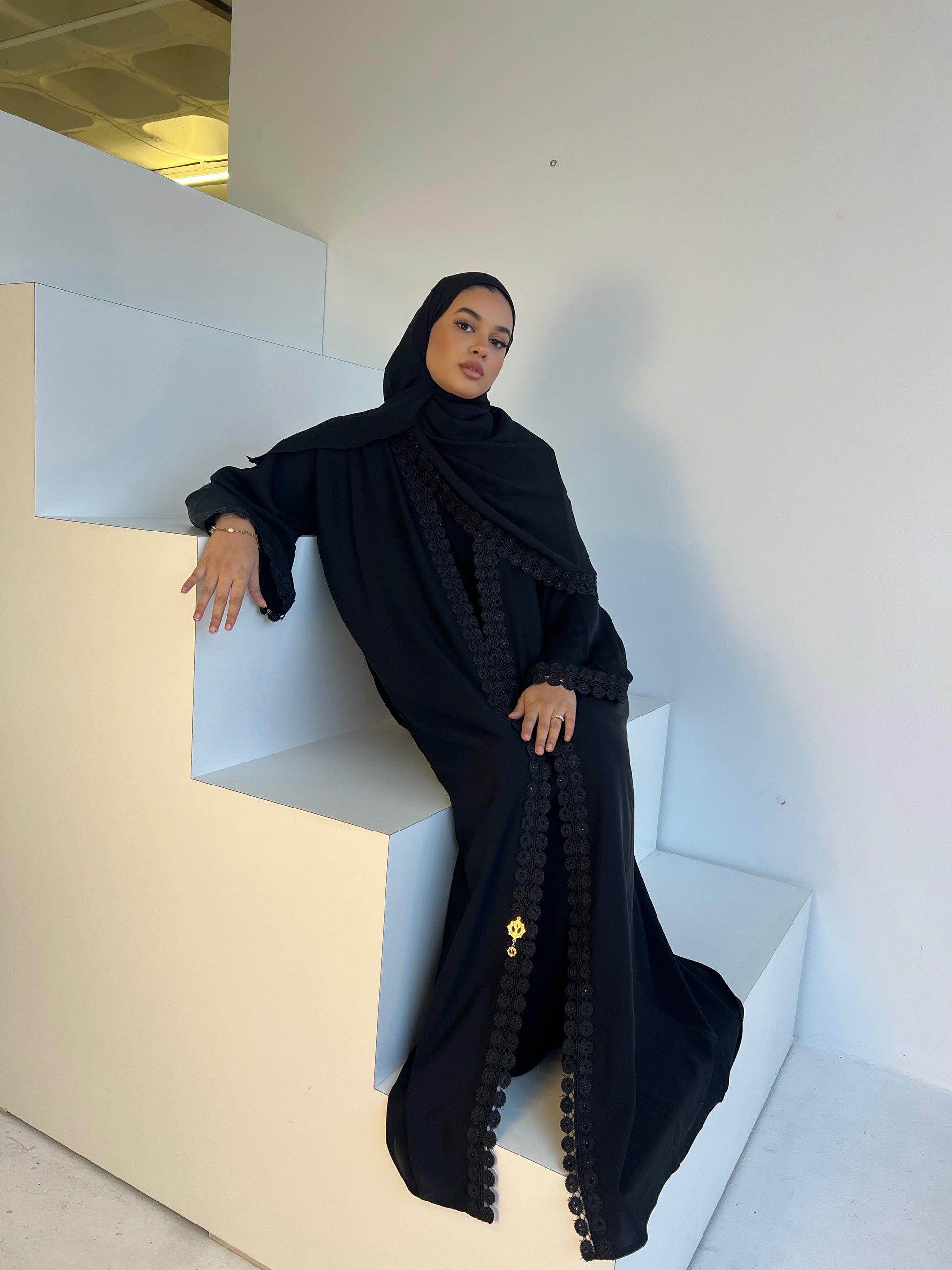 Elegant and timeless, this black abaya set is crafted from premium nada fabric for a luxurious feel. The abaya and matching scarf are beautifully adorned with crystal rhinestone embellished lace, adding a refined touch of sparkle. A perfect blend of classic sophistication and modern elegance, this set requires no additional accessories to complete the look, making it ideal for any occasion.