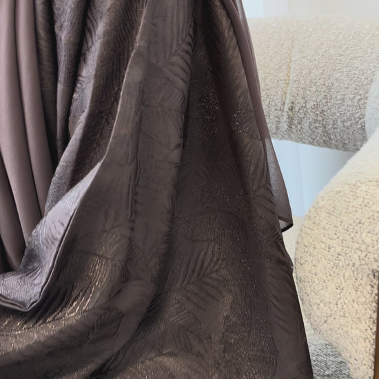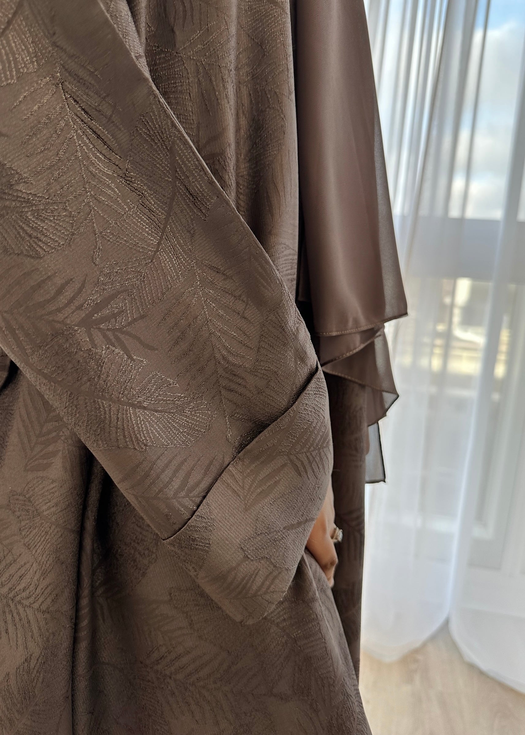 Designed with a focus on texture and refined detail, this jacquard abaya features a defined botanical leaf pattern woven into the fabric, creating depth and understated elegance. The soft Mocha Taupe tone enhances the richness of the design, while the oversized closed silhouette offers a graceful, flowing fit. Finished with beautifully folded cuffs for a polished and elevated look.