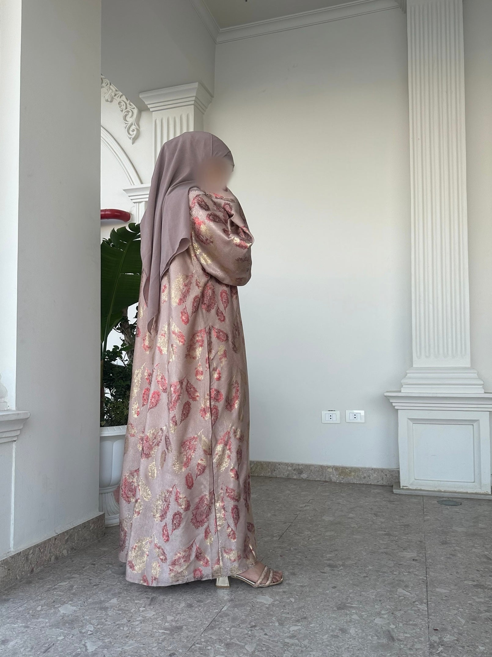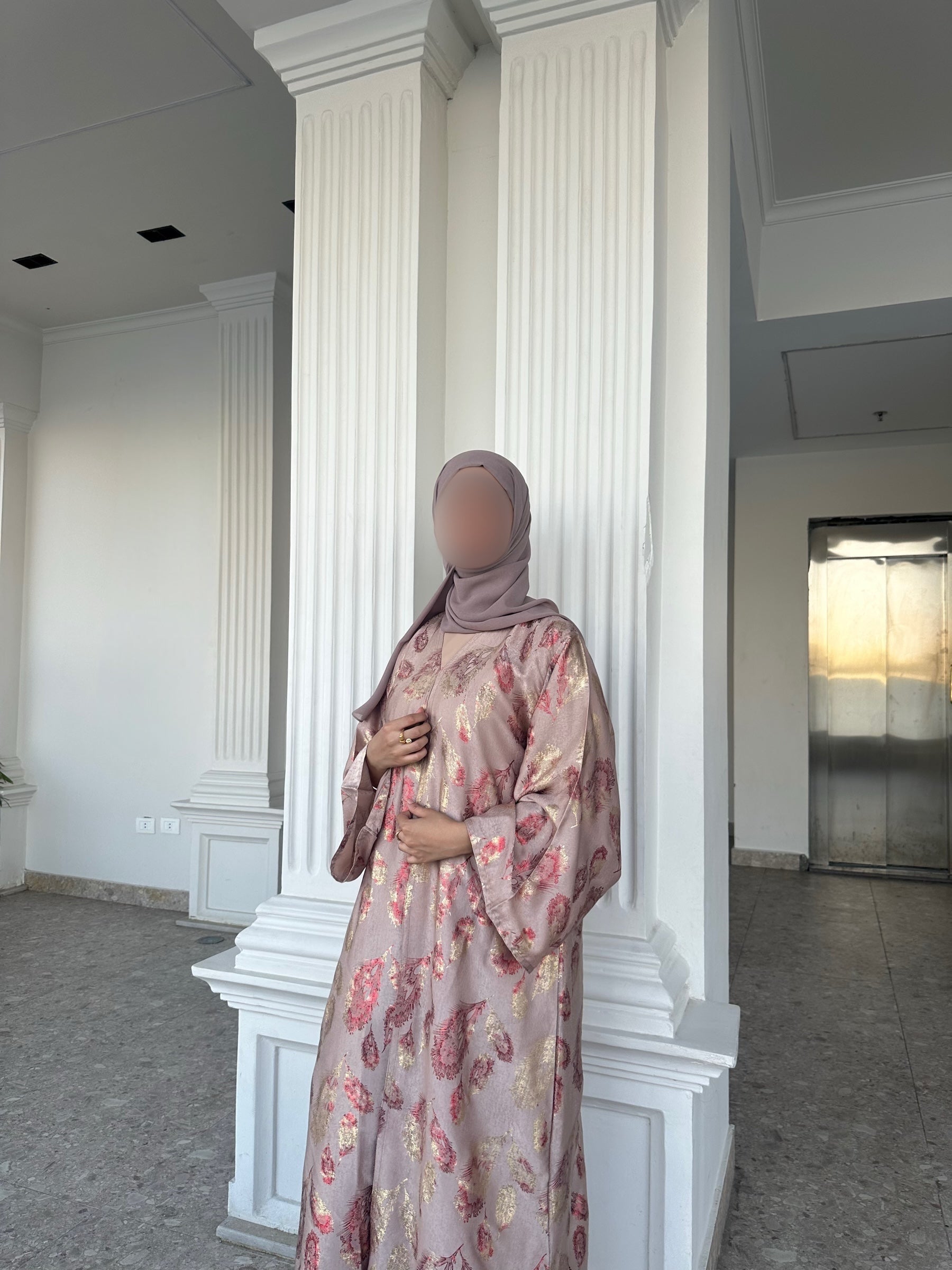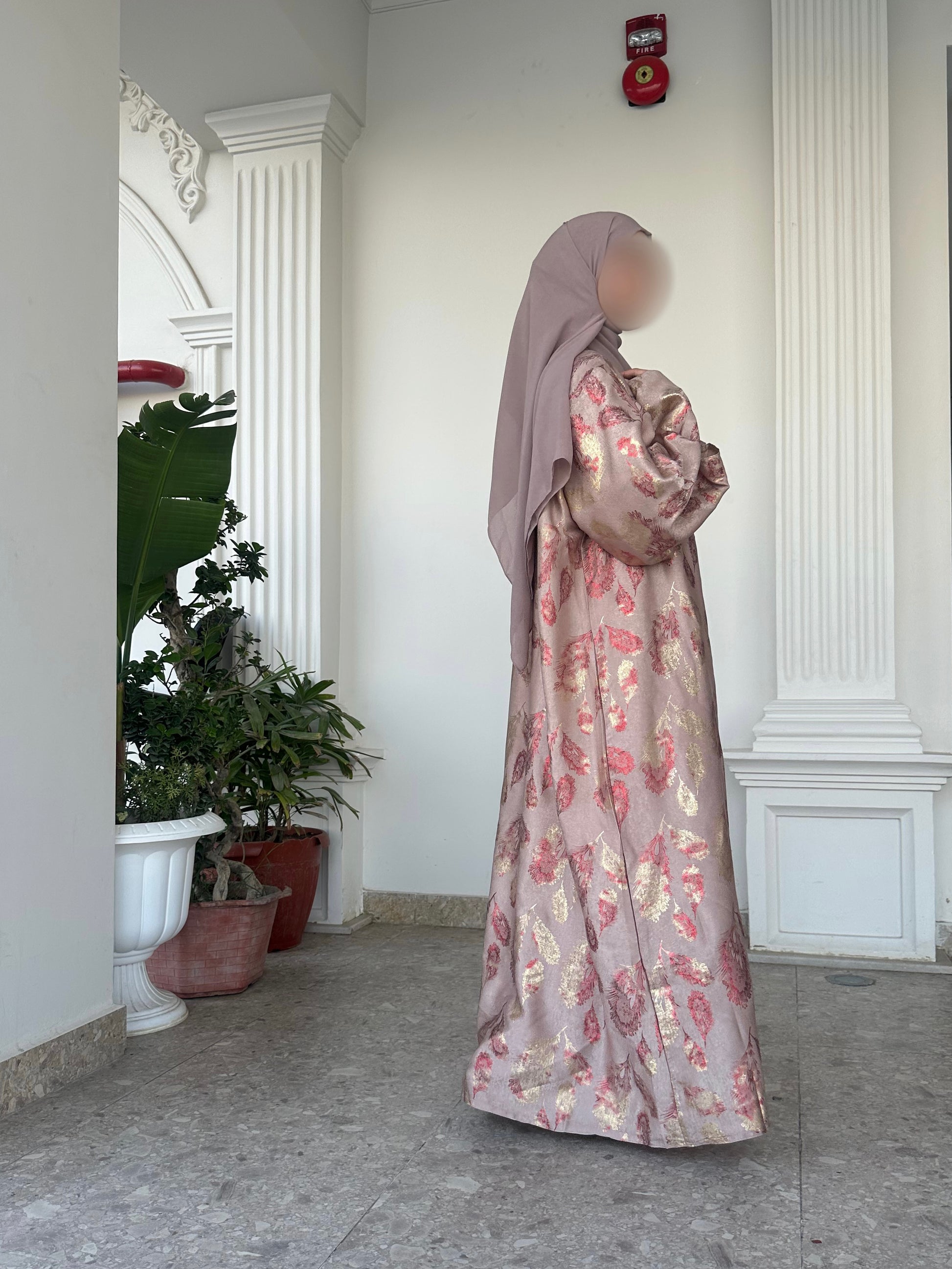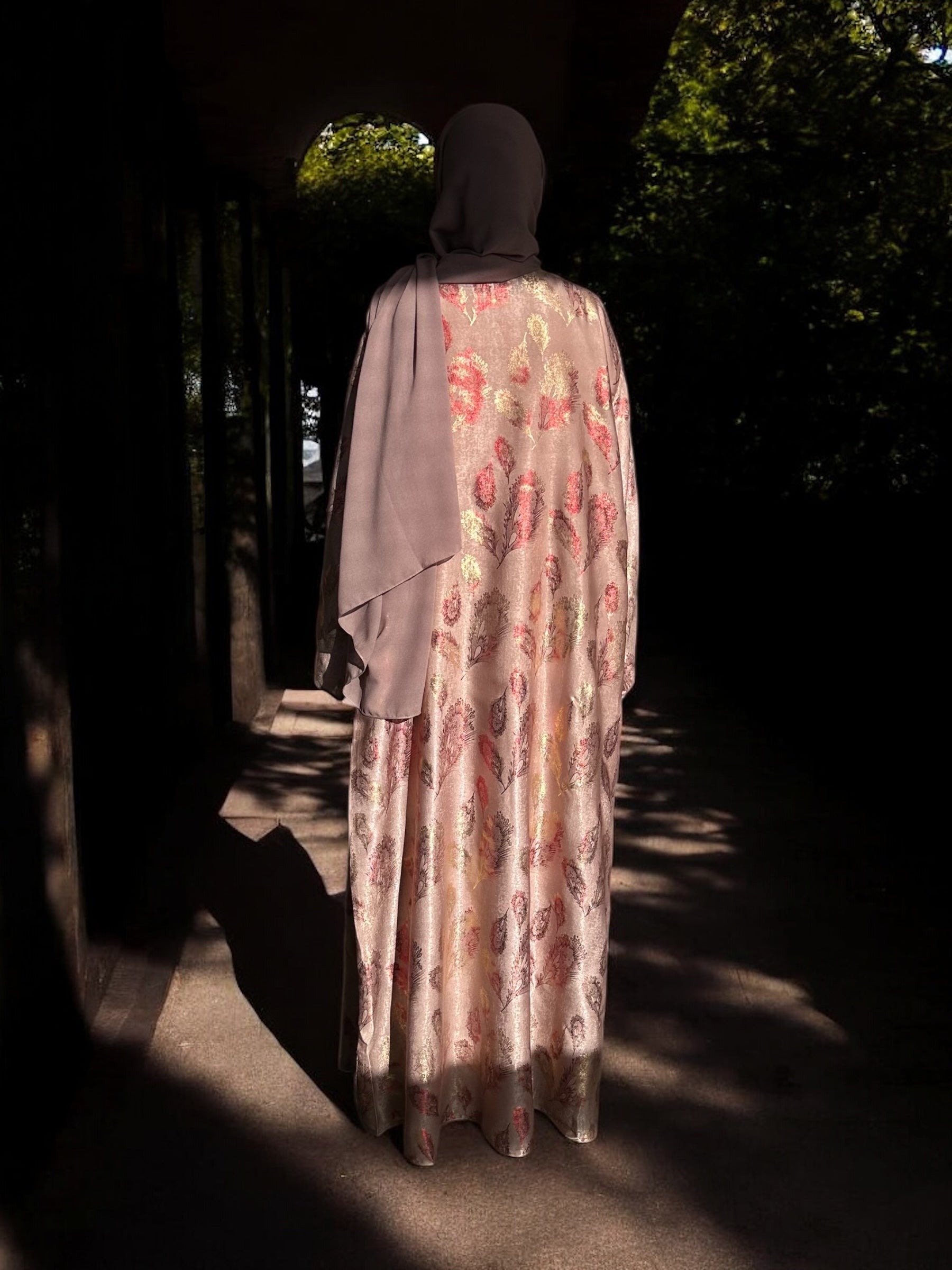 Step into elegance with this stunning three-piece abaya set, designed for special occasions. Crafted from a soft, silky fabric, the outer abaya features a subtle sheen and a delicate leaf-pattern motif in shades of blush, mauve, and soft gold. The drape flows effortlessly, exuding grace with every step.