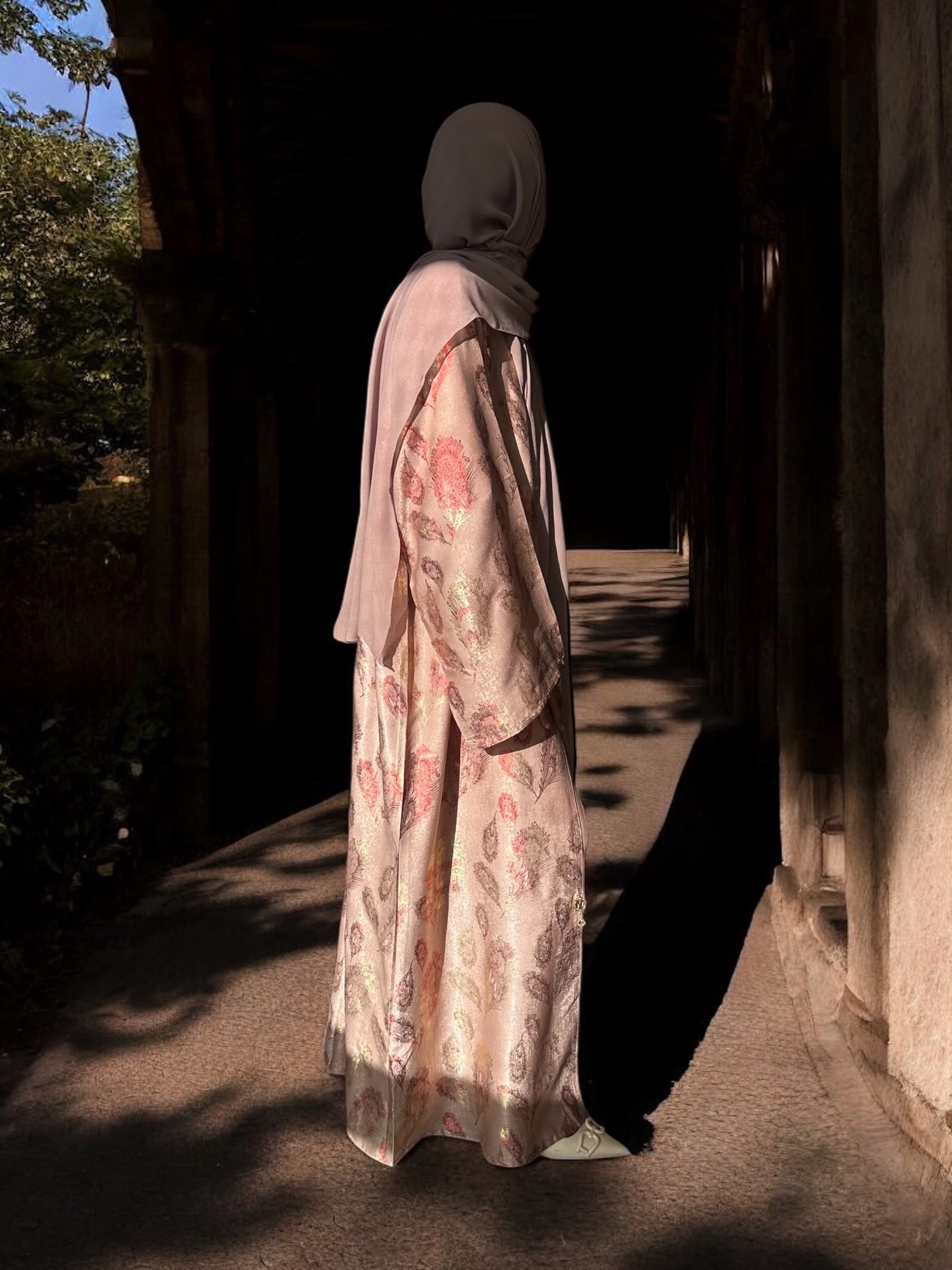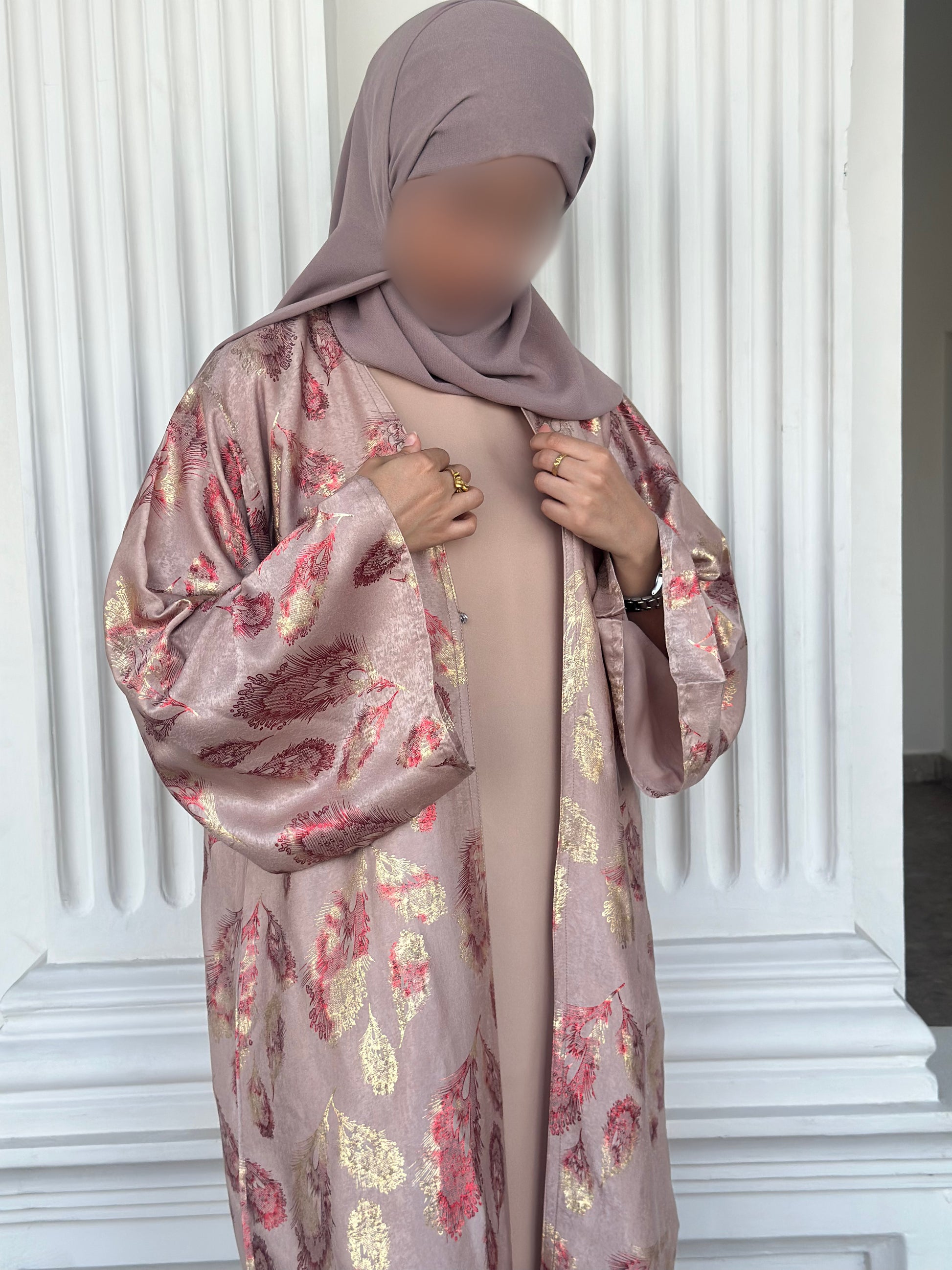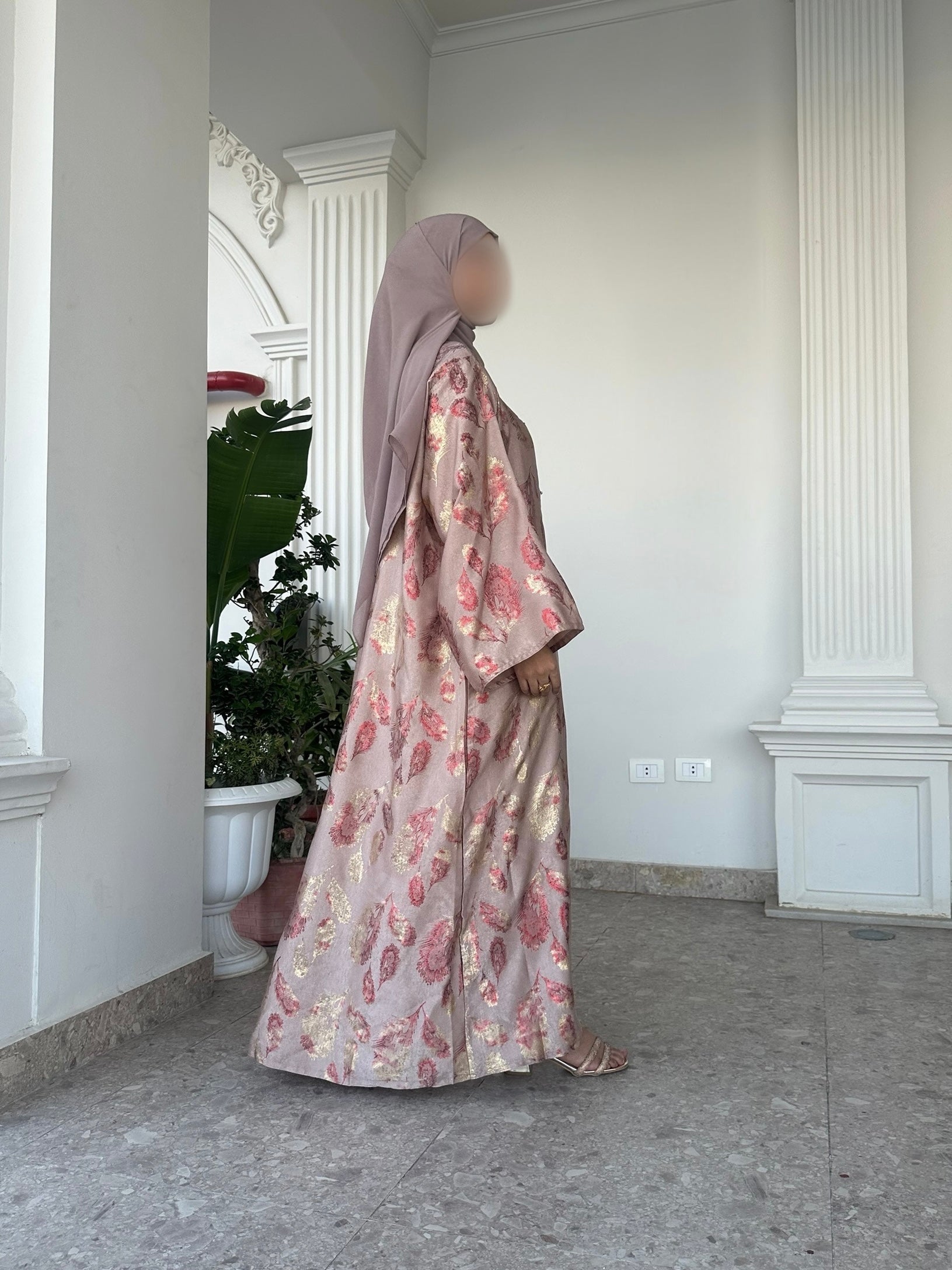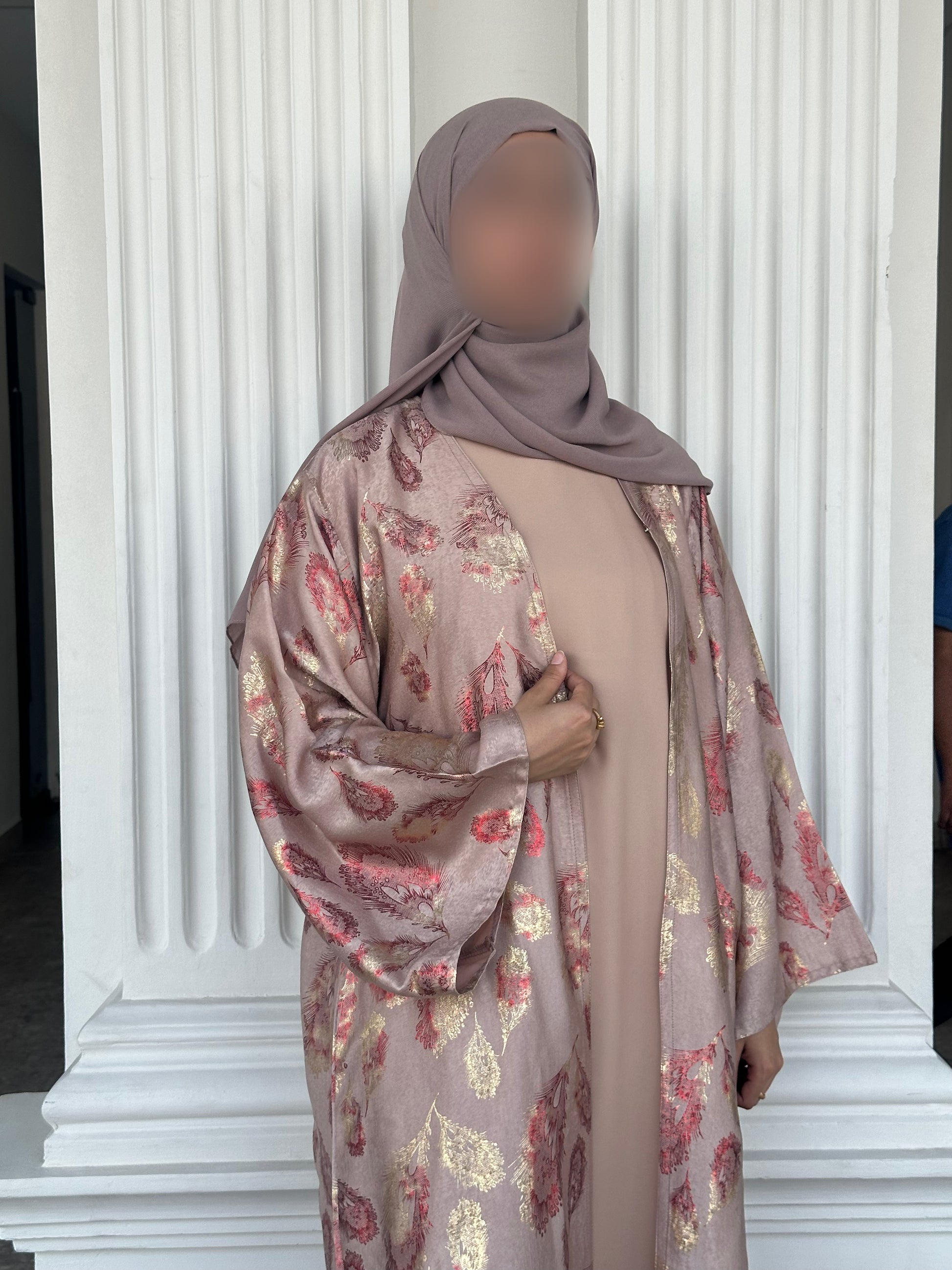 Step into elegance with this stunning three-piece abaya set, designed for special occasions. Crafted from a soft, silky fabric, the outer abaya features a subtle sheen and a delicate leaf-pattern motif in shades of blush, mauve, and soft gold. The drape flows effortlessly, exuding grace with every step.