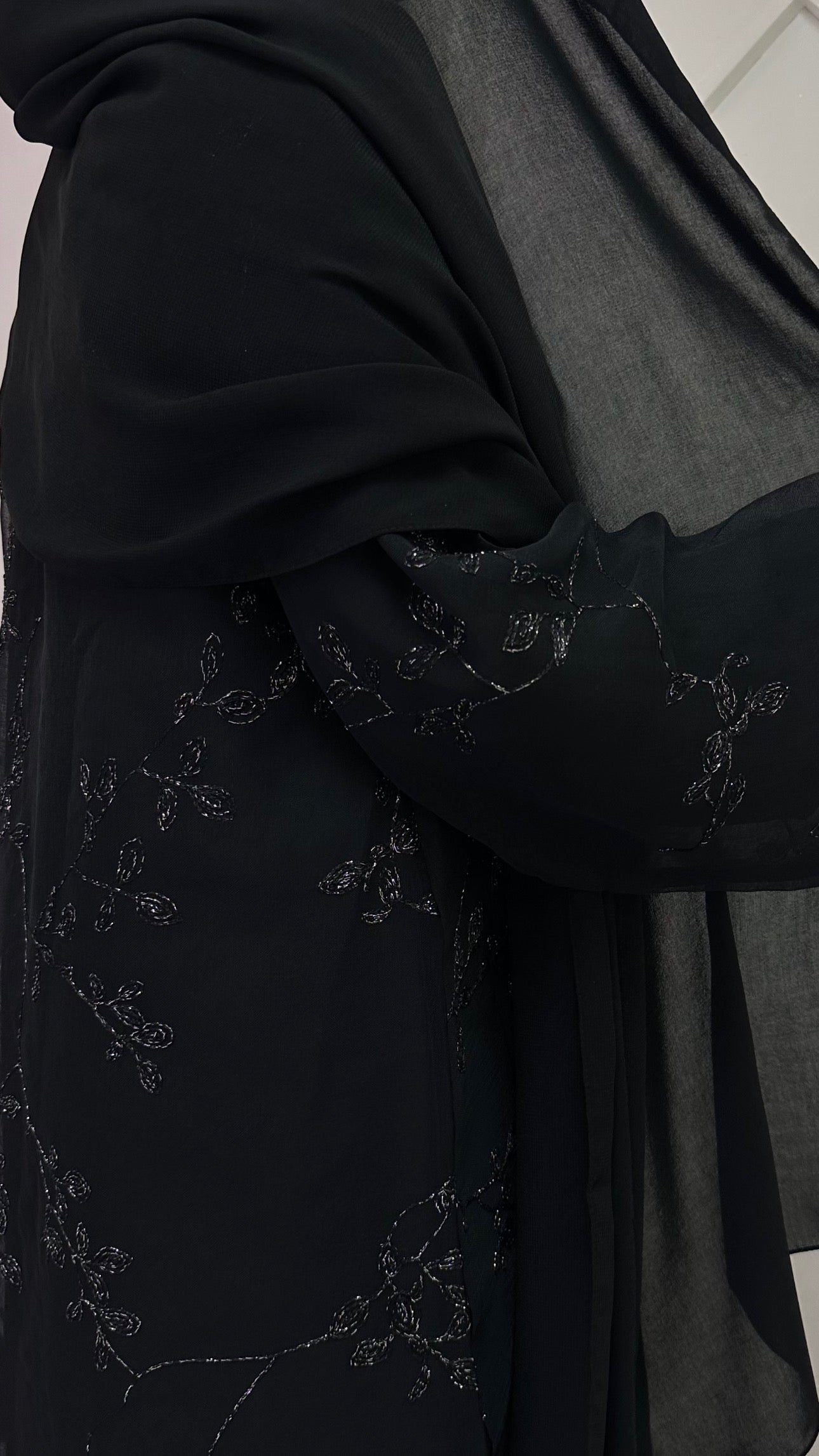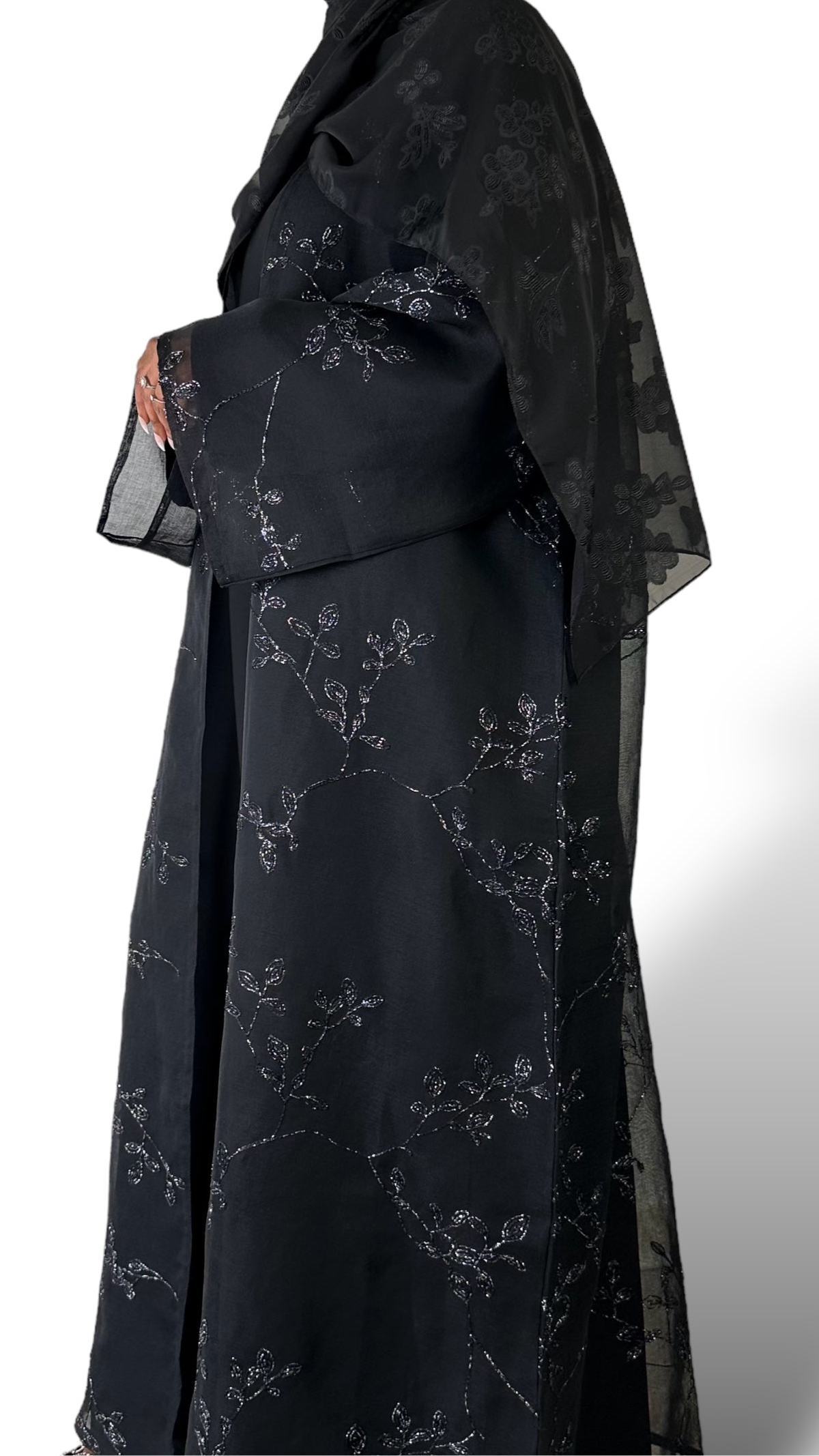 The Mystique Elegance Abaya is a symbol of enduring elegance and sophistication. Crafted from stunning sheer linen and adorned with exquisite silver metallic floral embroidery, it is perfect for those memorable evenings or special occasions. Complete your look with the included full sleeved nada dress and large soft black plain scarf, providing a touch of opulence to your ensemble.