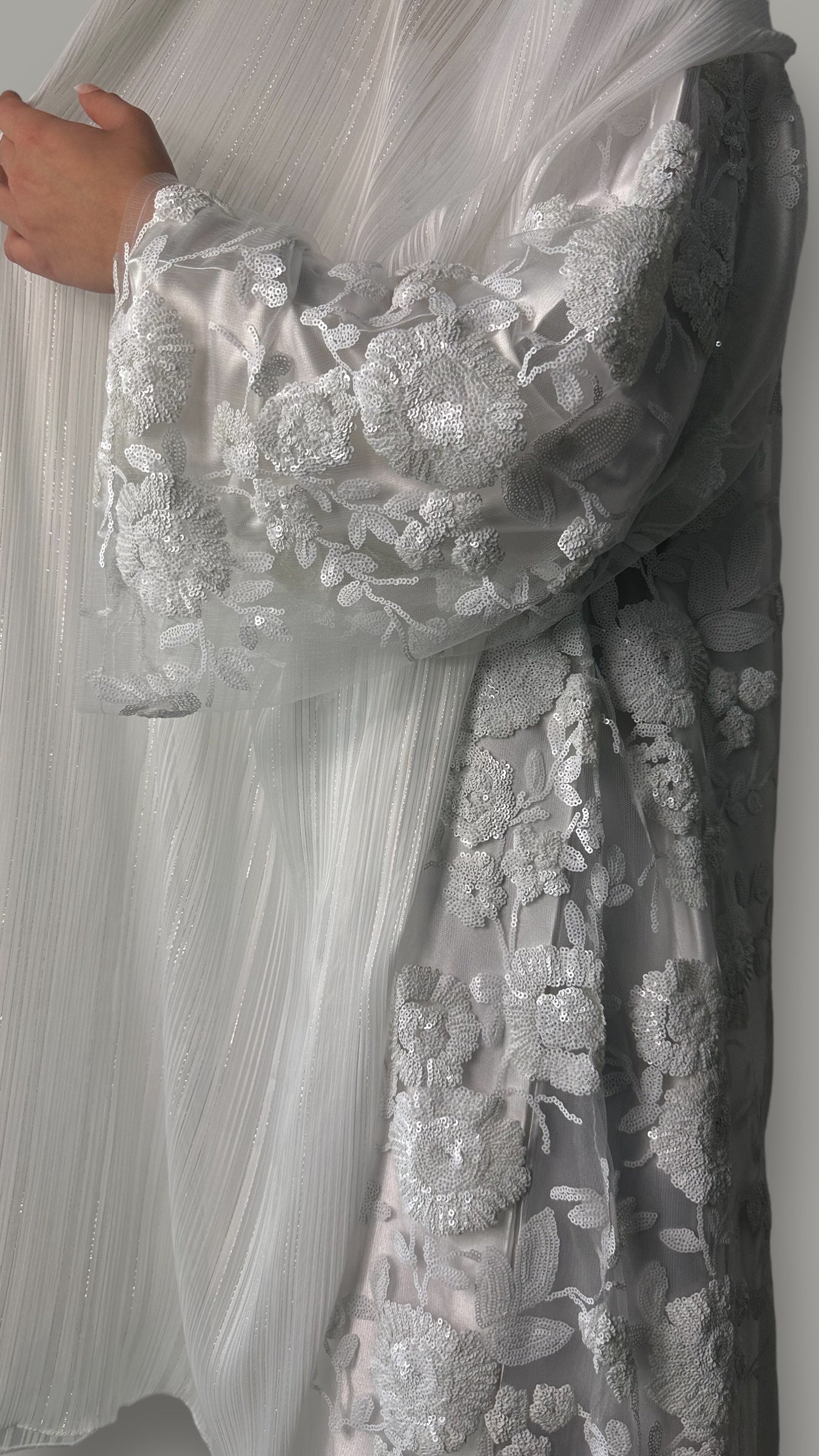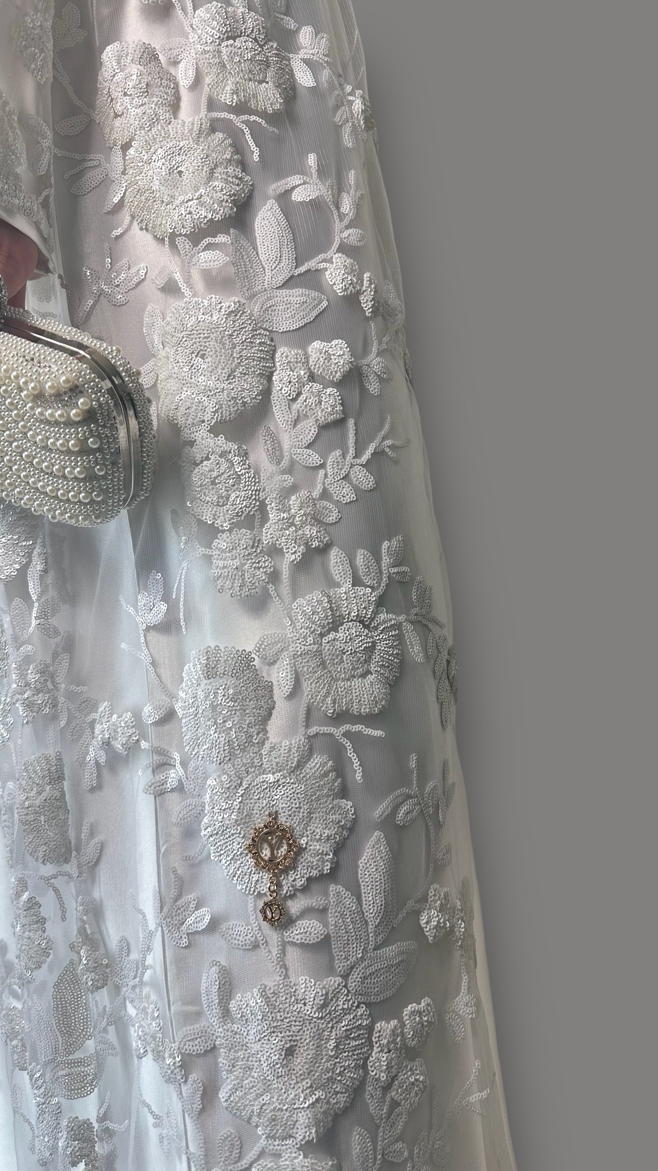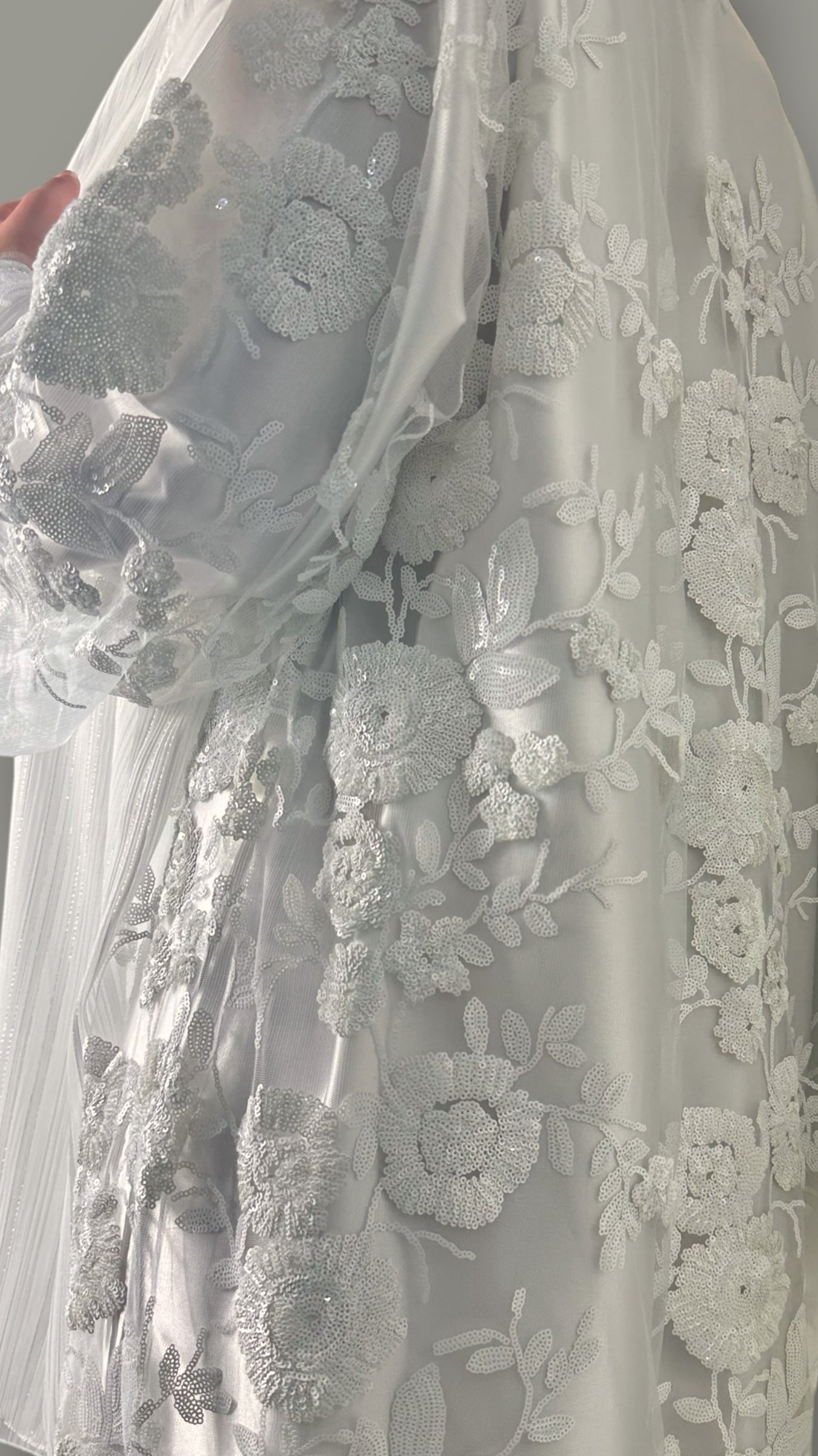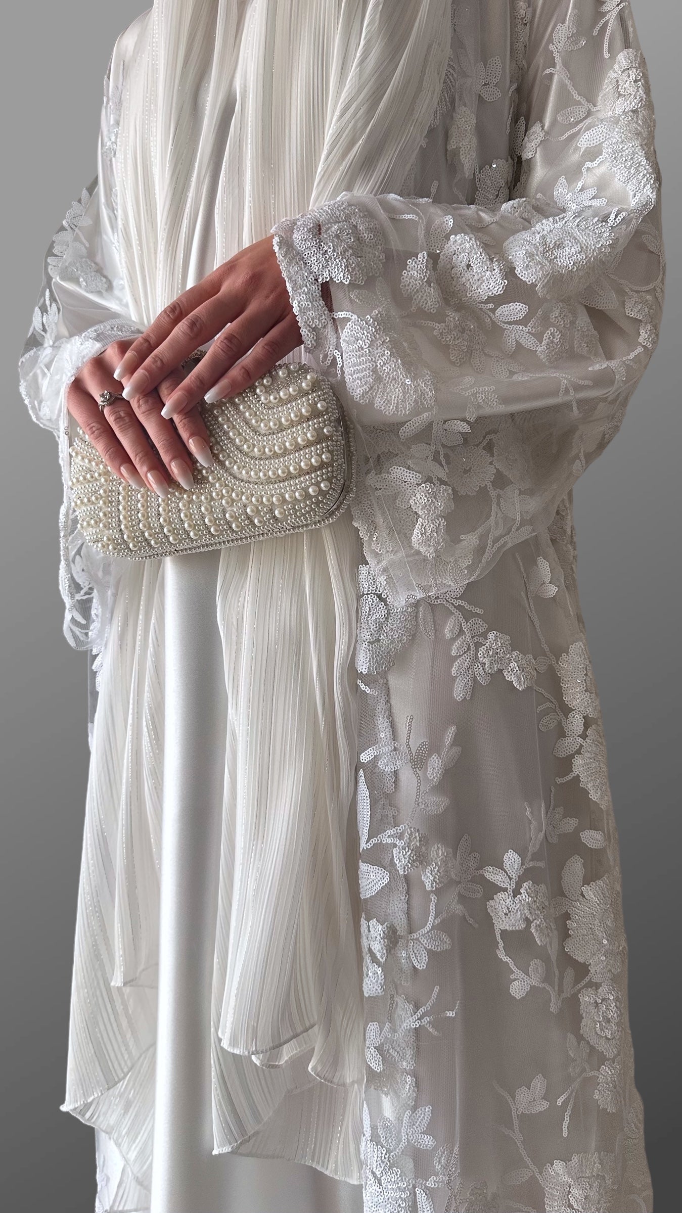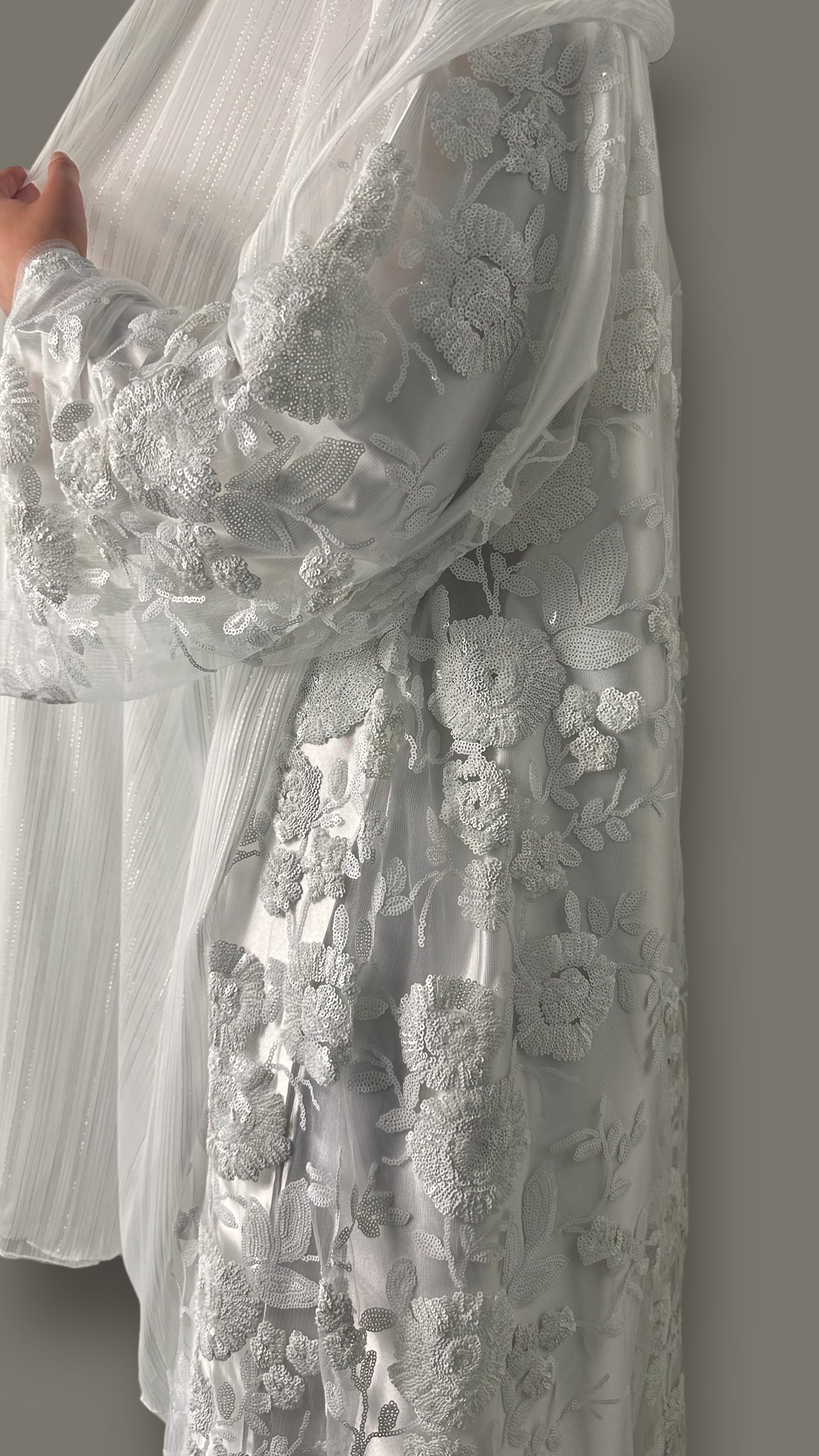 Elevate your elegance with Noura, a masterpiece designed for bridal or special occasions. Crafted from ethereal white sequined floral, this exquisite abaya captivates with its enchanting allure. The sheer silhouette exudes sophistication, complemented by a long white sleeved dress in luxurious Italian silk. Complete the ensemble with a large, stunning white scarf, provided as a complementary addition, ensuring a premium feel. Make an indelible impression and cherish unforgettable moments in this truly remarkable attire.