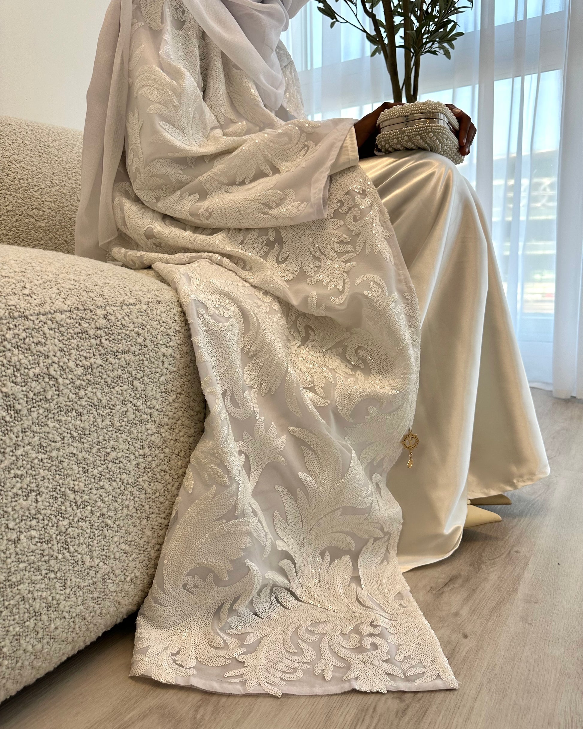 An elegant three-piece abaya set designed for special occasions. The open sheer abaya features a delicate floral pattern with a subtle shimmer and is fully lined for comfort and coverage. Paired with a smooth satin silk inner dress and finished with a shimmery scarf, this set offers timeless sophistication with effortless grace.