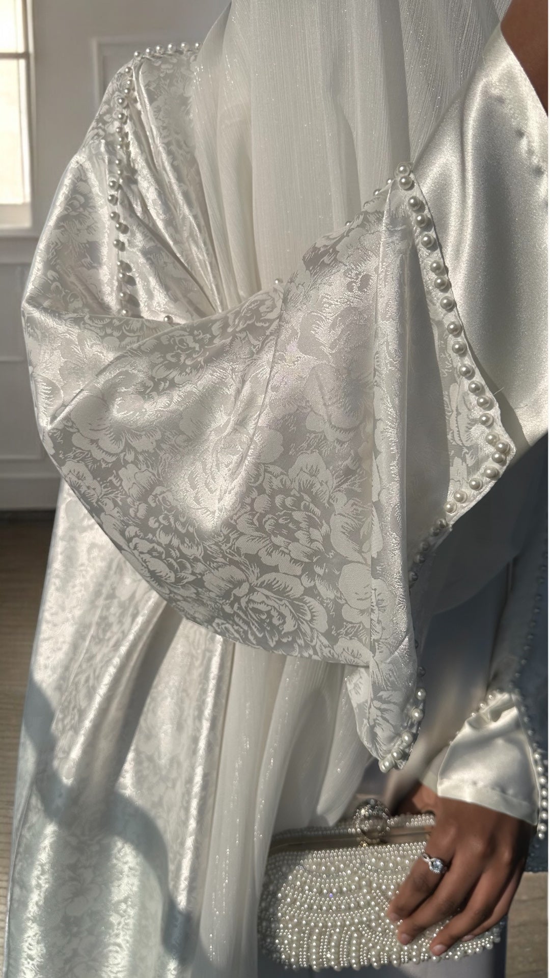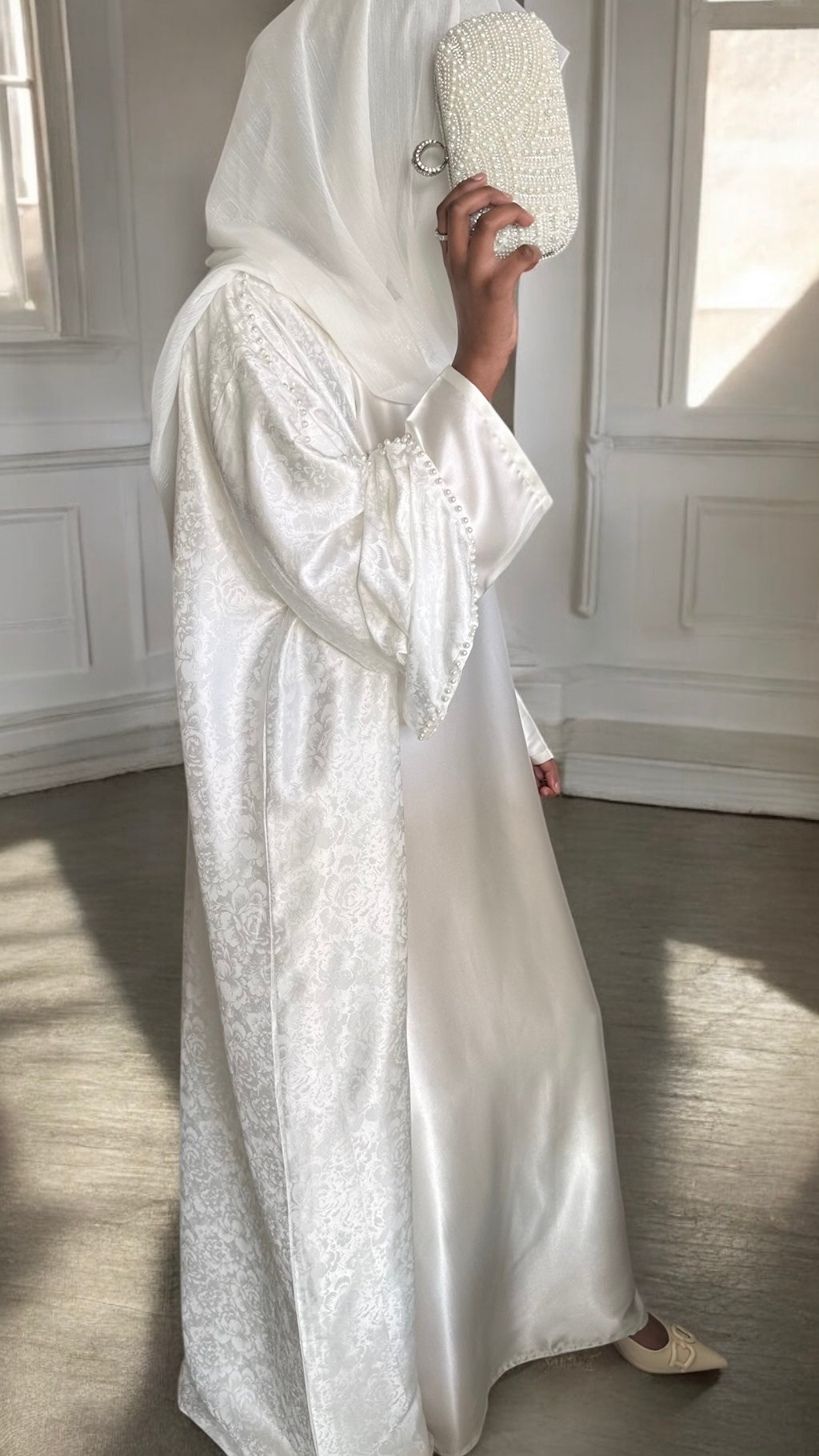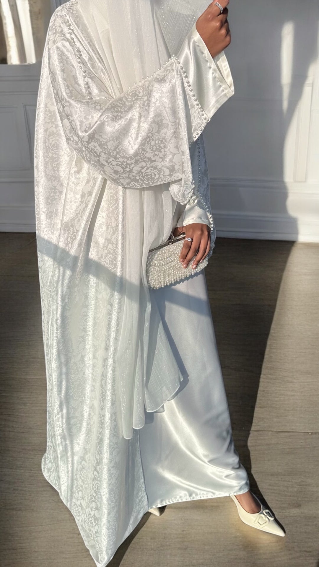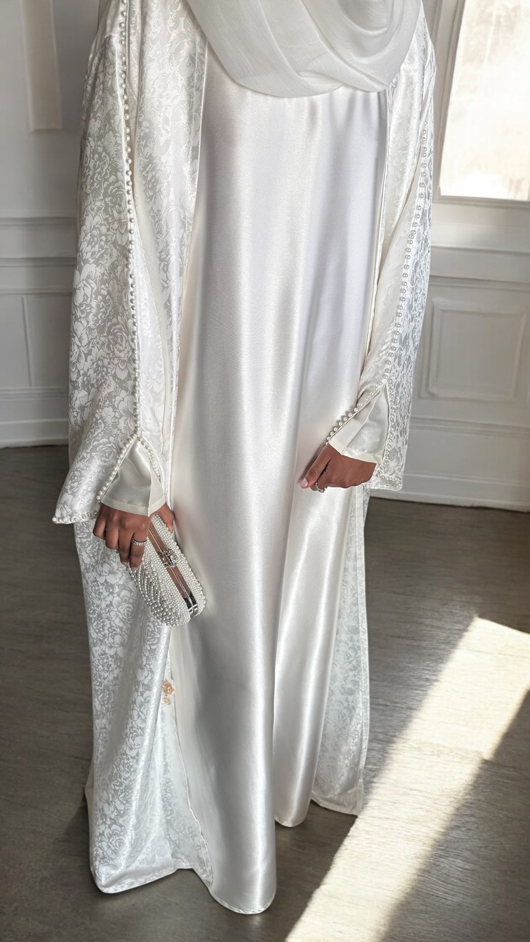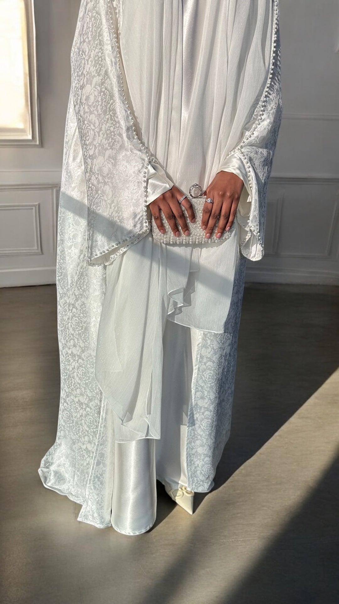 Elegance and grace come to life in this exquisite floral ivory open abaya, crafted from sumptuous silky jacquard. Designed for those who appreciate timeless sophistication, its ethereal beauty is elevated by delicately adorned sleeves, featuring lustrous ivory pearls and an elegant slit detail. The rich, textured fabric drapes effortlessly, creating a look of refined luxury. Paired with a flowing satin silk full dress and a soft shimmer ivory maxi scarf, this ensemble exudes effortless glamour perfect for making a lasting impression at any special occasion.