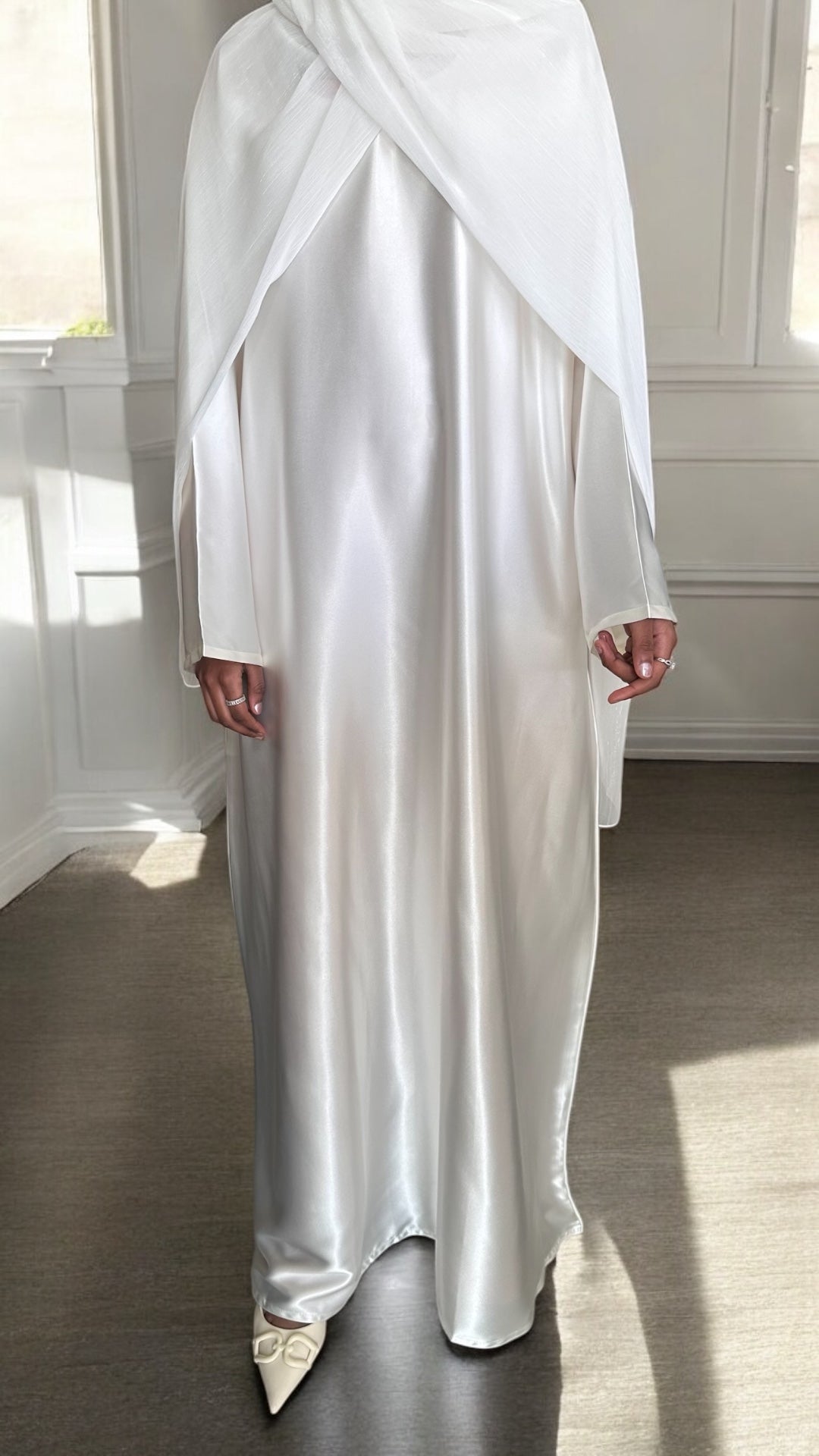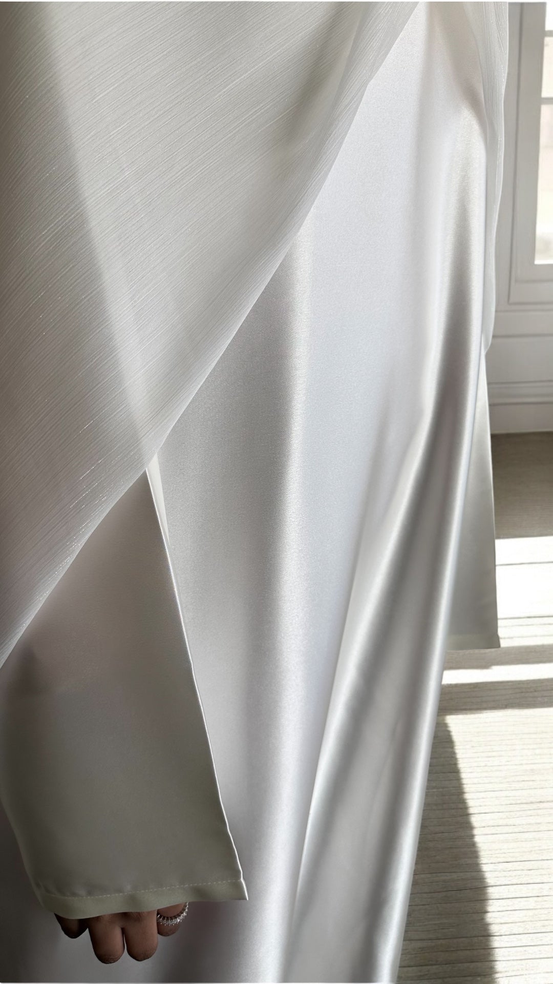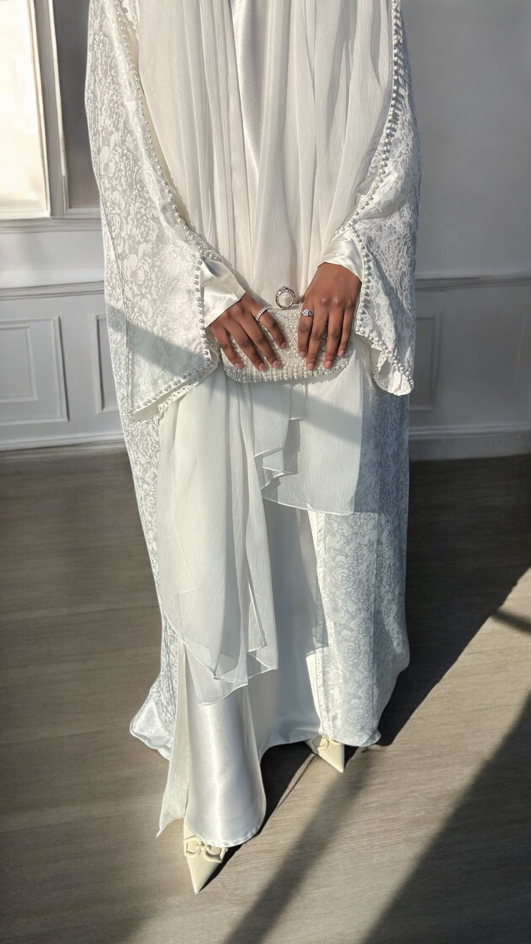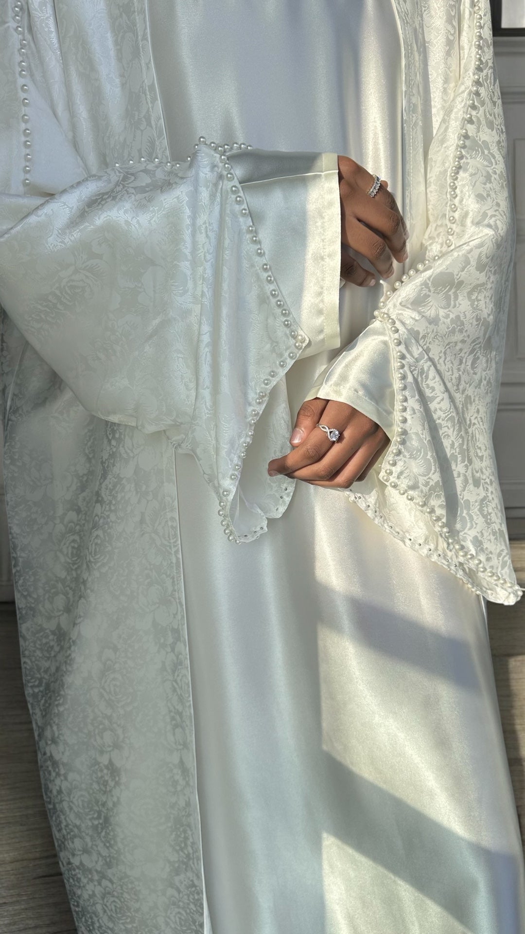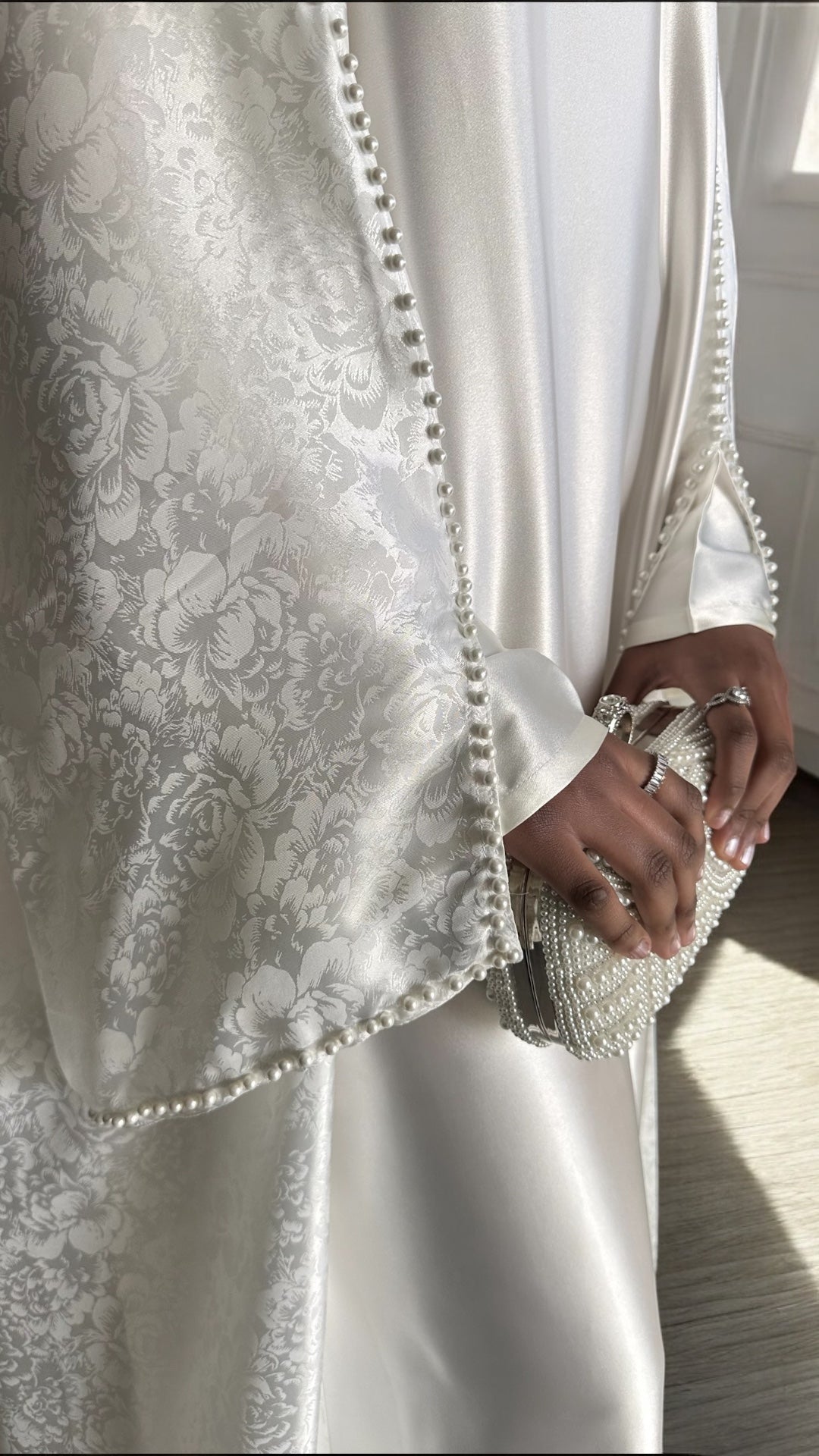 Elegance and grace come to life in this exquisite floral ivory open abaya, crafted from sumptuous silky jacquard. Designed for those who appreciate timeless sophistication, its ethereal beauty is elevated by delicately adorned sleeves, featuring lustrous ivory pearls and an elegant slit detail. The rich, textured fabric drapes effortlessly, creating a look of refined luxury. Paired with a flowing satin silk full dress and a soft shimmer ivory maxi scarf, this ensemble exudes effortless glamour perfect for making a lasting impression at any special occasion.
