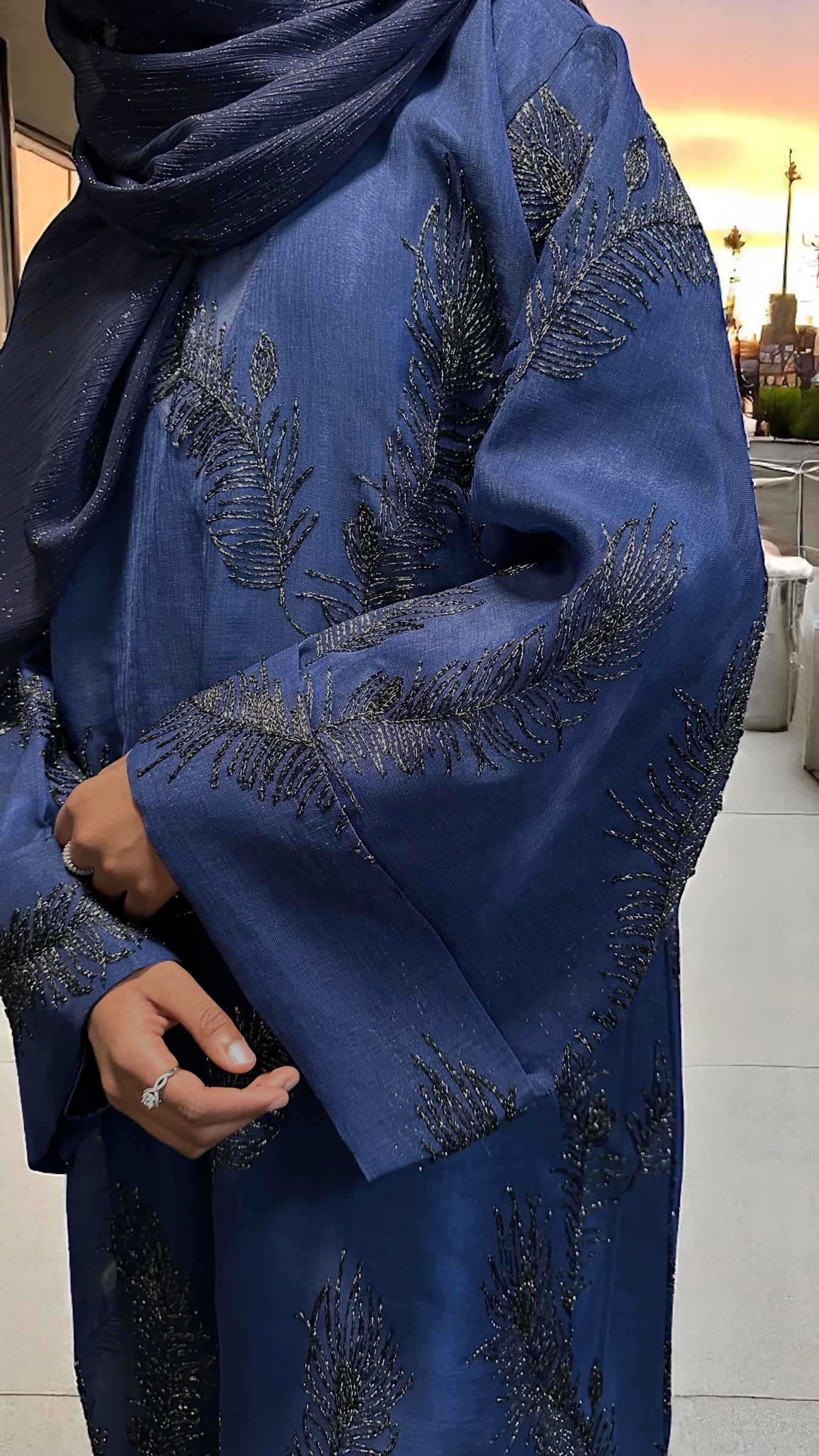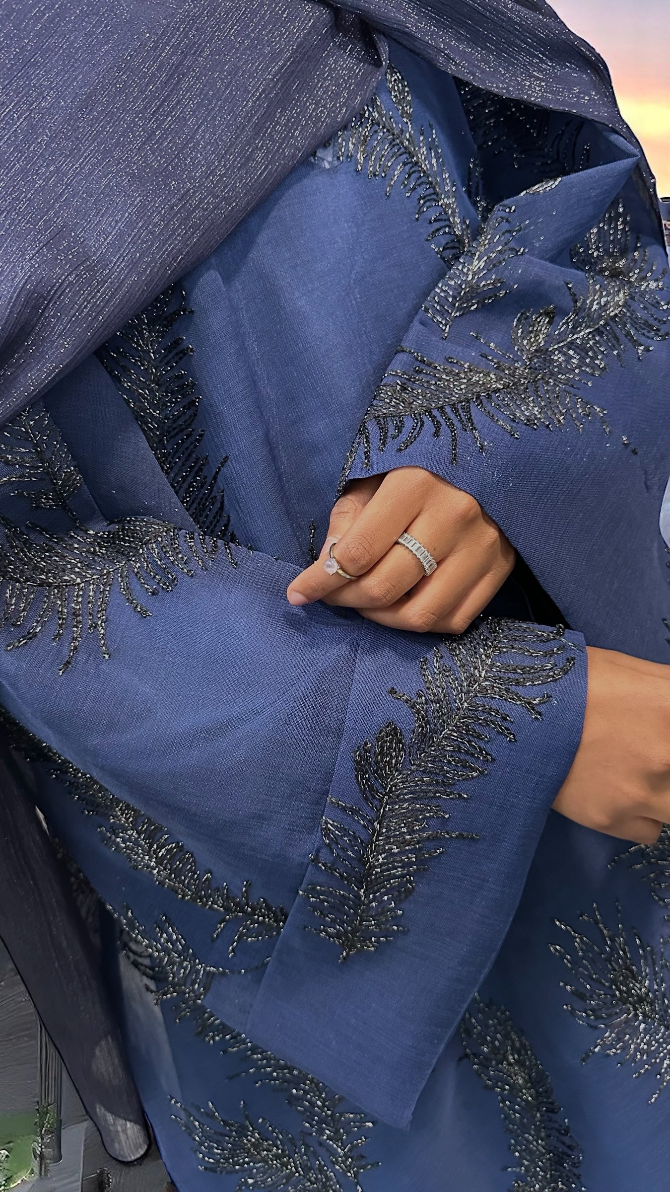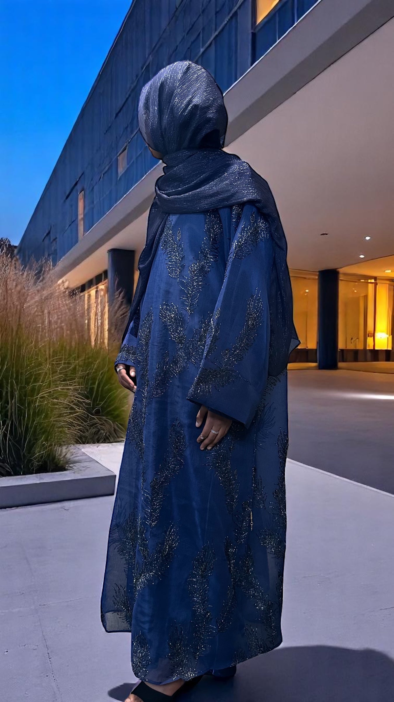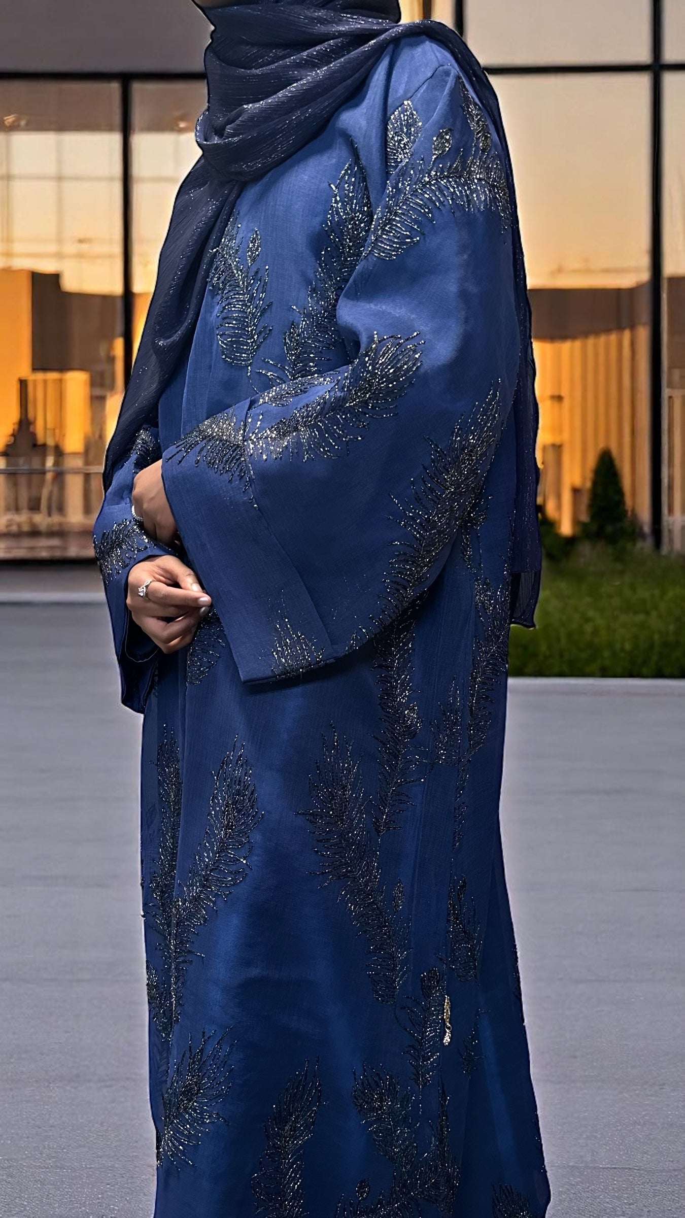 A true embodiment of elegance and sophistication, this royal blue closed abaya is crafted from sheer linen and beautifully embellished with intricate silver metallic floral embroidery. The design features delicately folded sleeves and comes with a luxurious satin silk full sleeved inner dress for complete coverage and a refined silhouette. The full sleeves add an extra layer of modesty while maintaining a soft, graceful flow beneath the sheer overlay. Completing the set is a large, subtle shimmery scarf in a matching royal blue tone designed to add that final touch of effortless luxury to your look. Perfect for formal evenings, special occasions, or any moment you want to feel royally radiant.