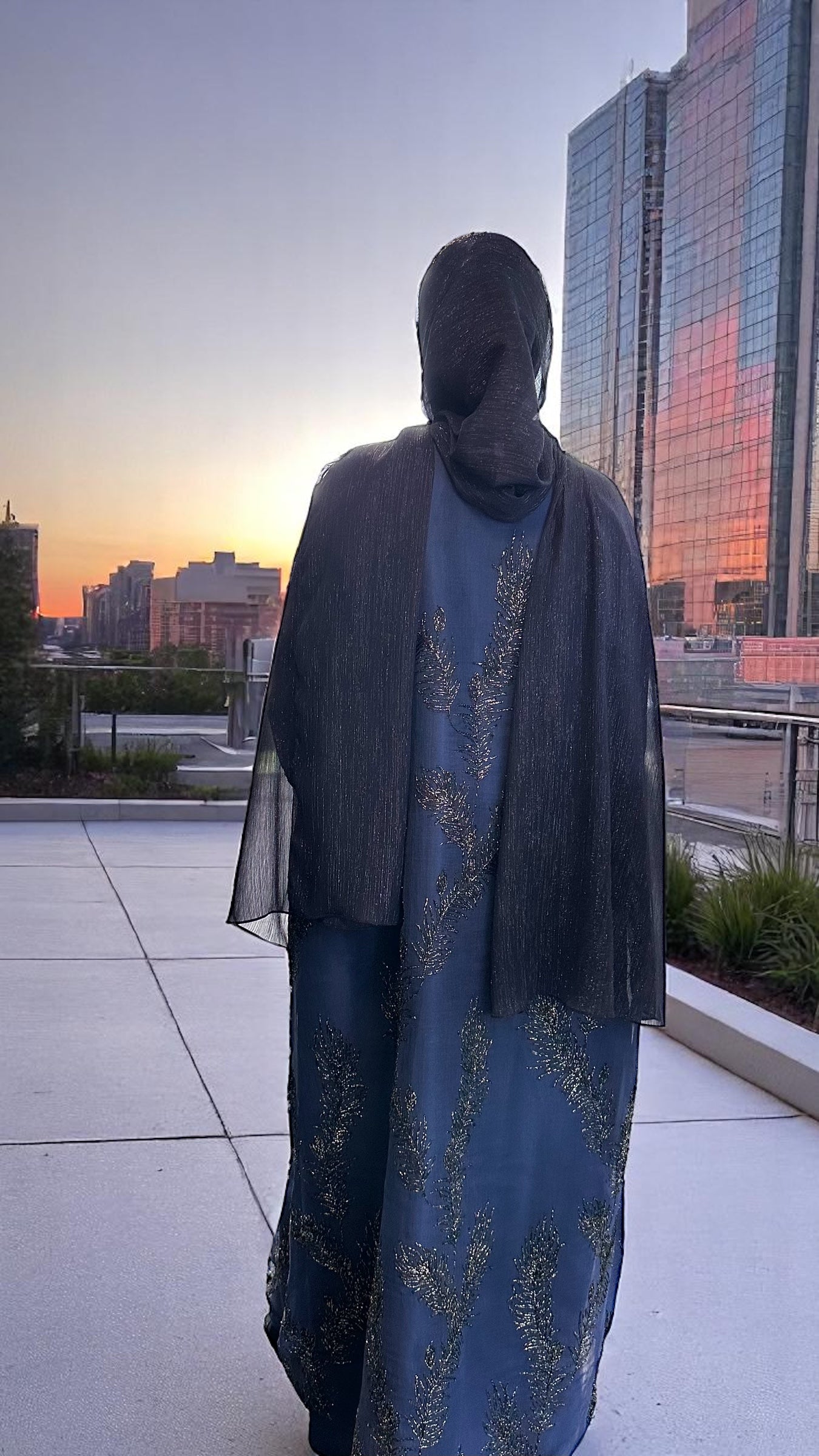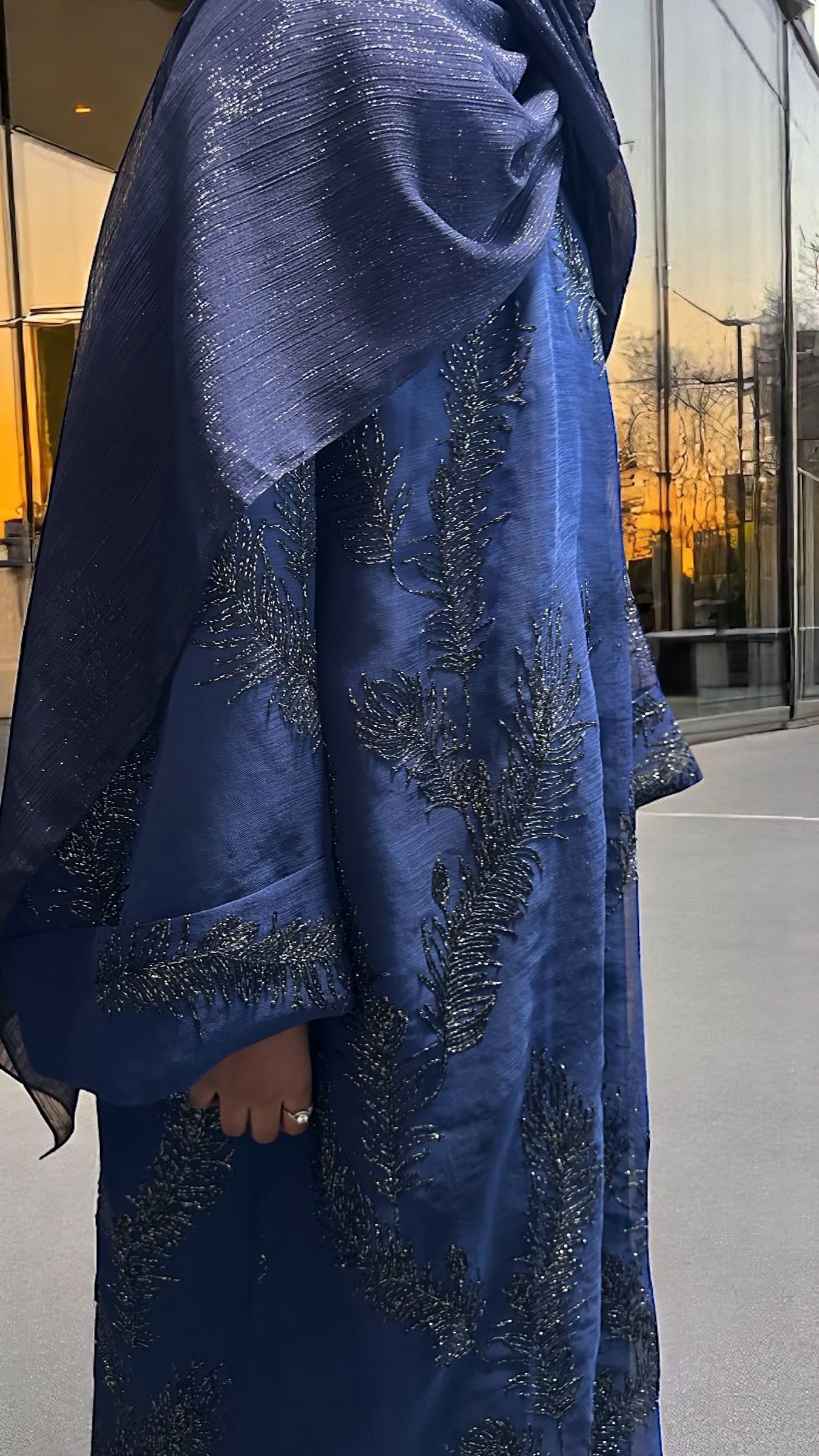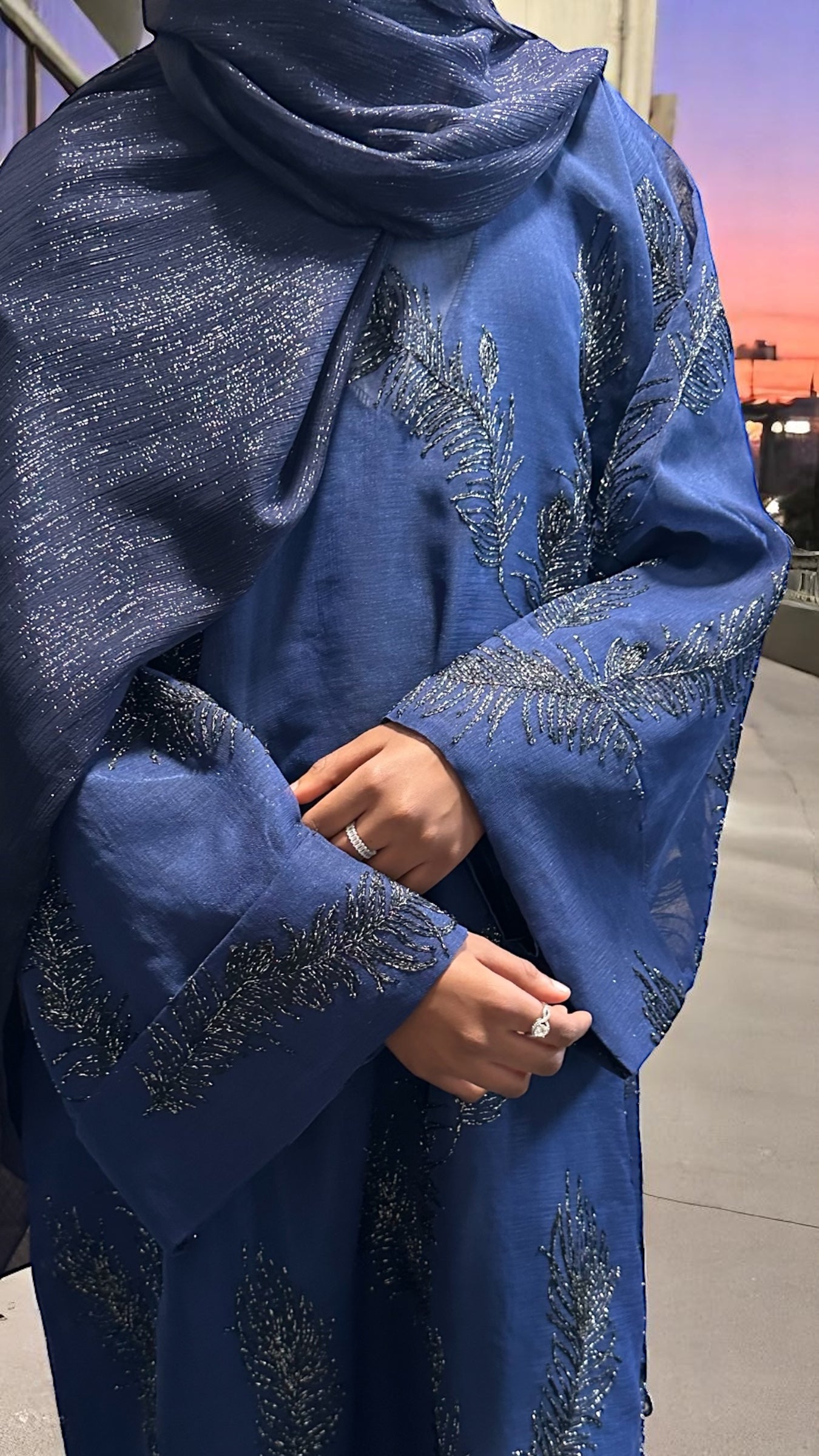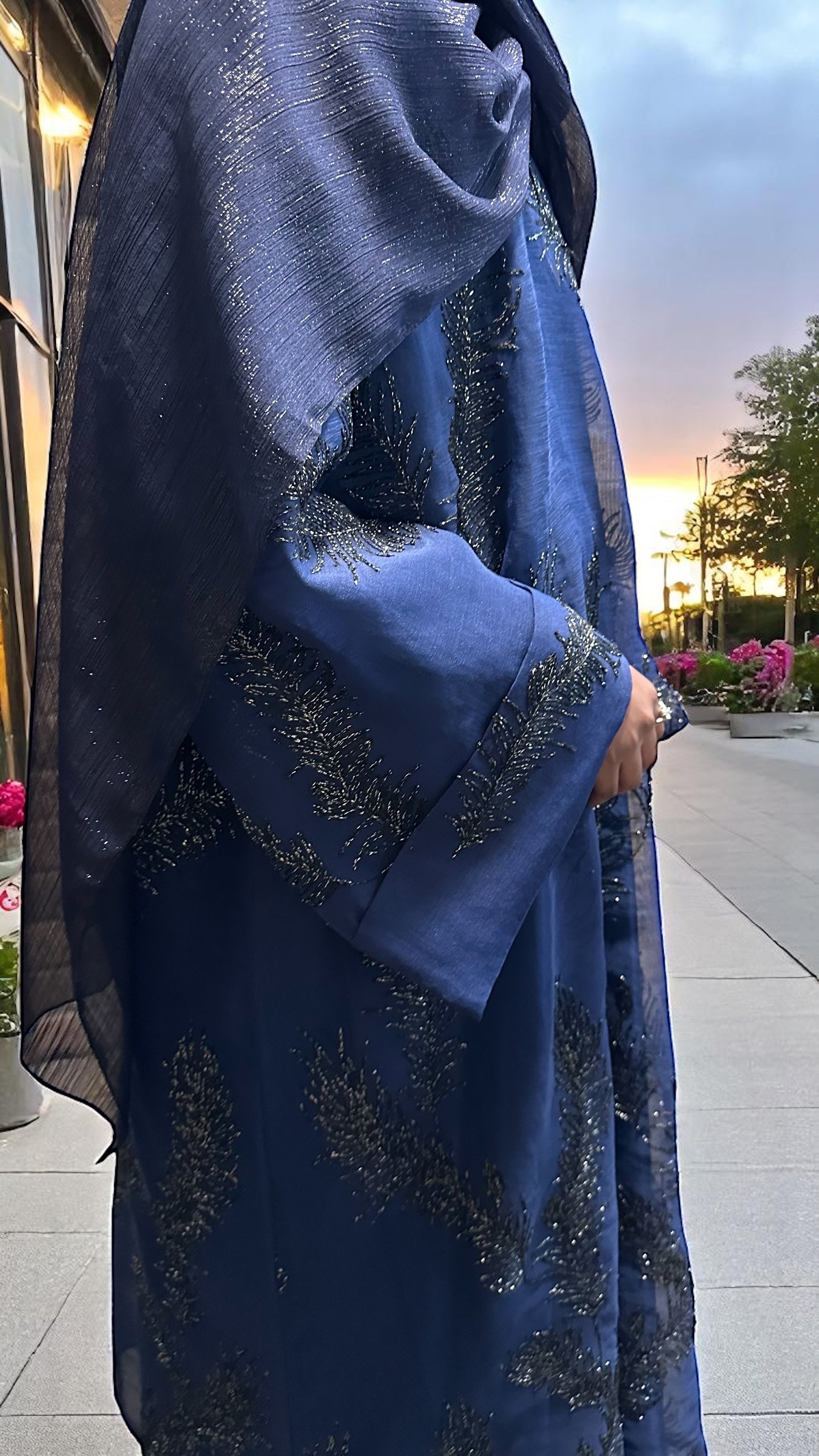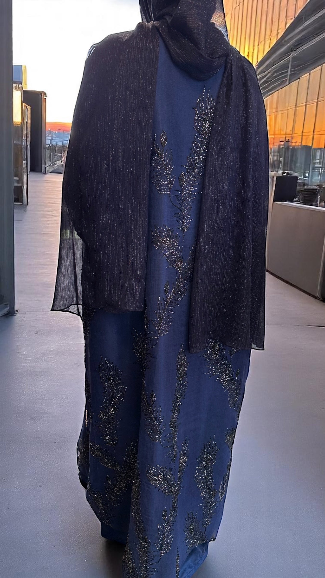 A true embodiment of elegance and sophistication, this royal blue closed abaya is crafted from sheer linen and beautifully embellished with intricate silver metallic floral embroidery. The design features delicately folded sleeves and comes with a luxurious satin silk full sleeved inner dress for complete coverage and a refined silhouette. The full sleeves add an extra layer of modesty while maintaining a soft, graceful flow beneath the sheer overlay. Completing the set is a large, subtle shimmery scarf in a matching royal blue tone designed to add that final touch of effortless luxury to your look. Perfect for formal evenings, special occasions, or any moment you want to feel royally radiant.