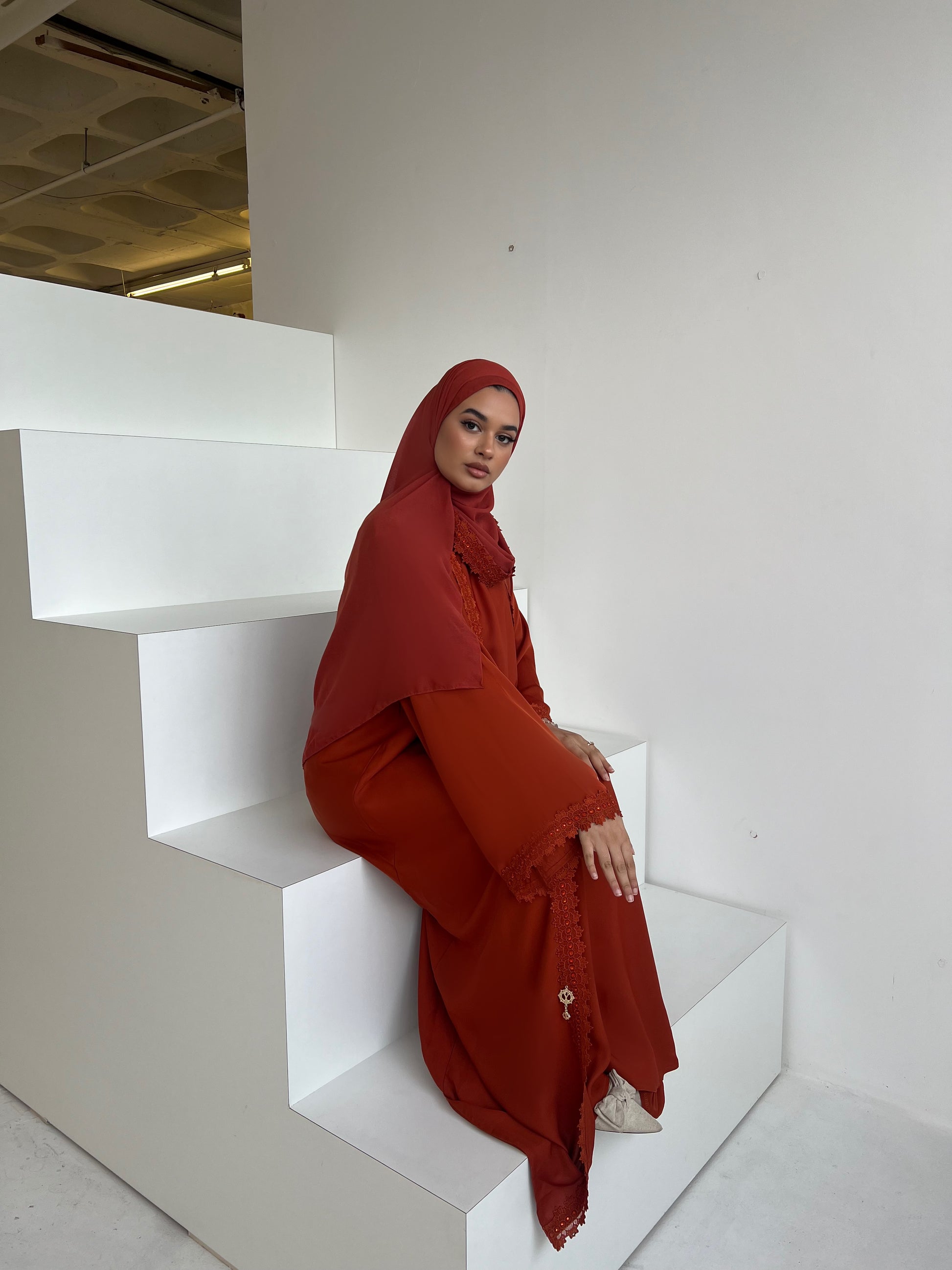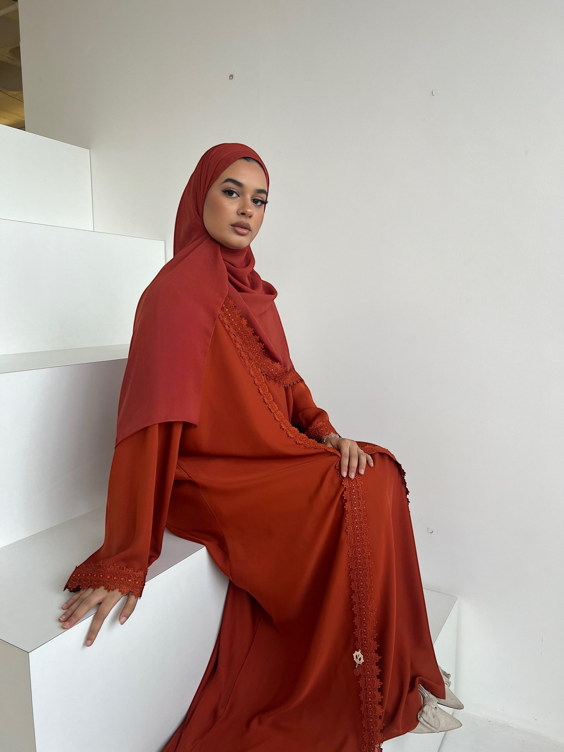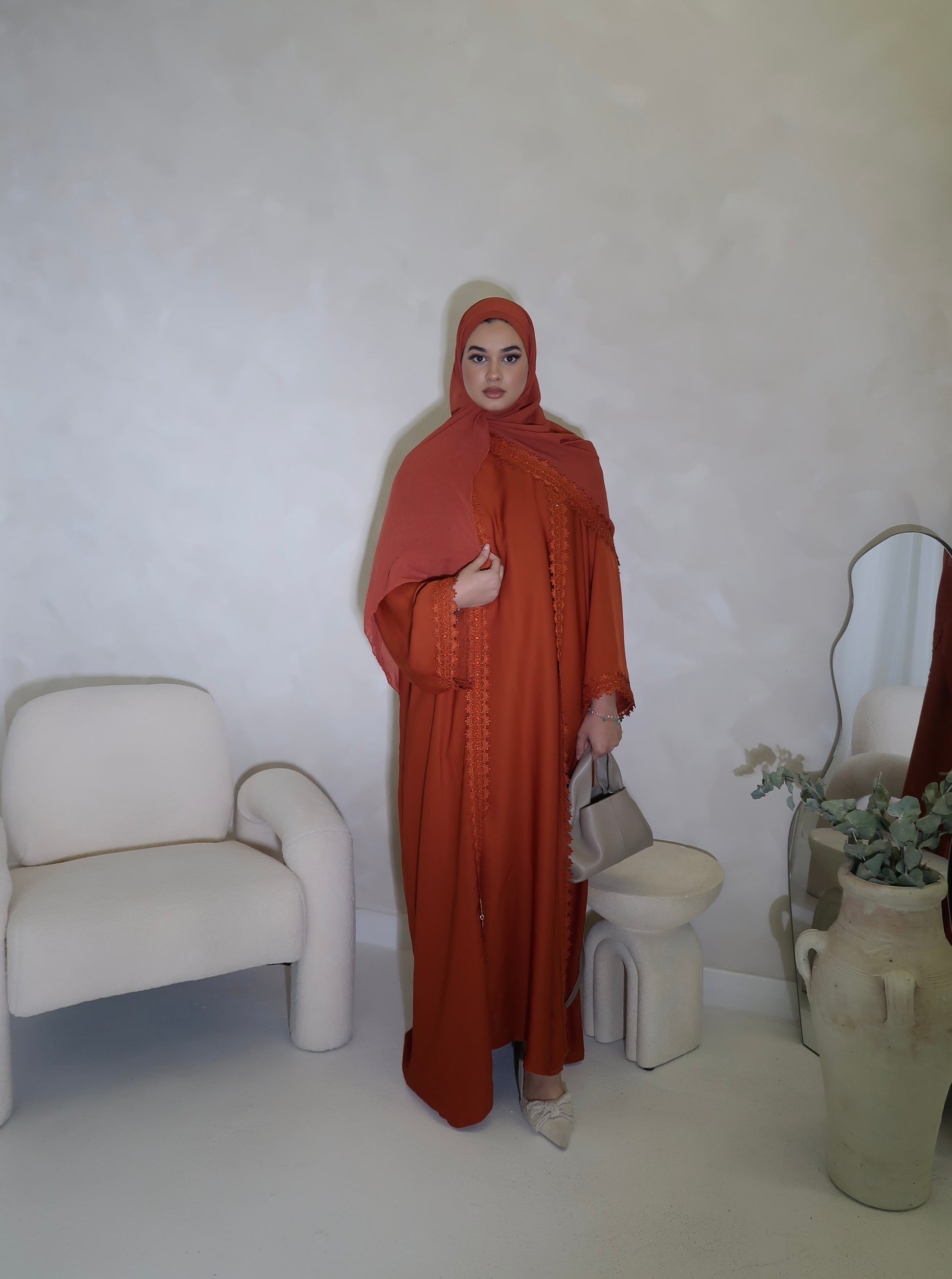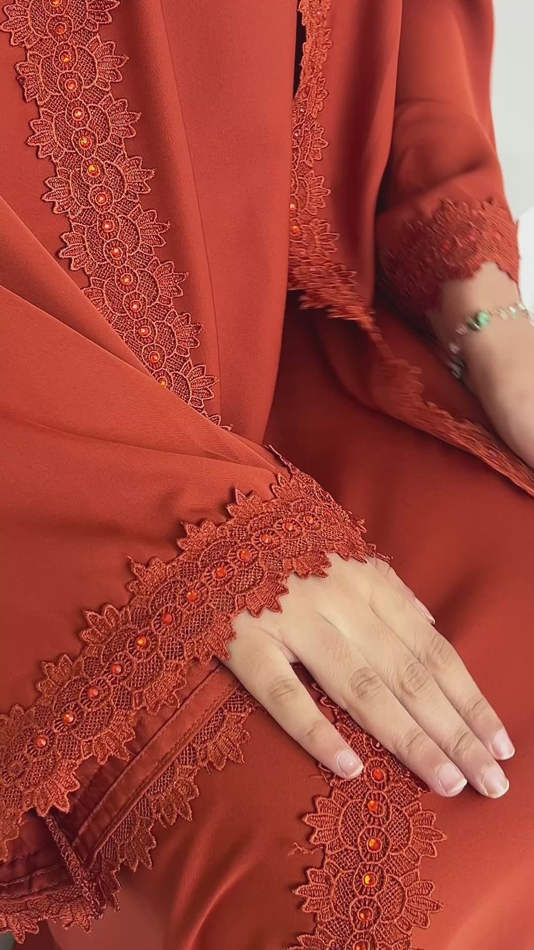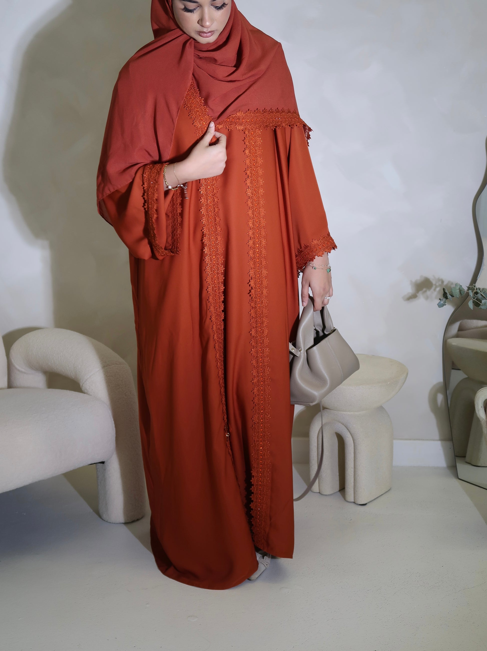 This stunning rust colored abaya set, made from premium nada fabric, exudes timeless elegance. Both the abaya and matching scarf are adorned with crystal rhinestone embellished lace, adding a refined touch of sparkle. A classic and sophisticated piece, it requires no additional accessories to achieve a perfectly elegant look for any occasion.